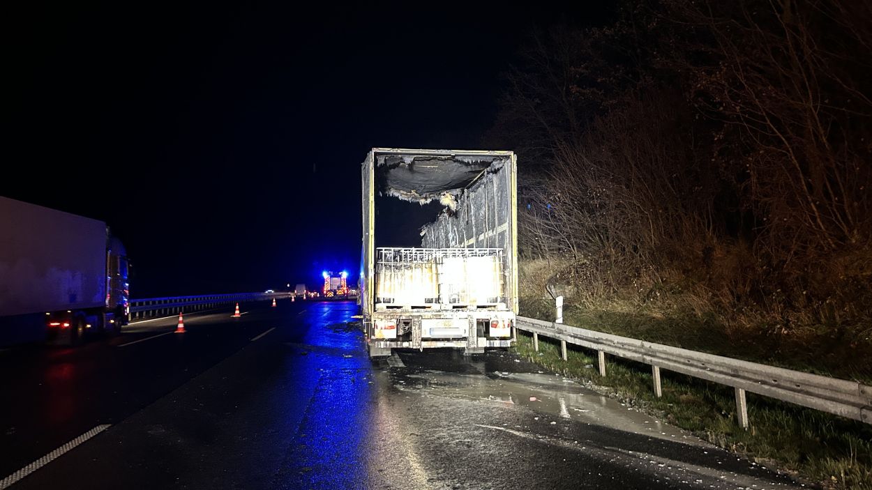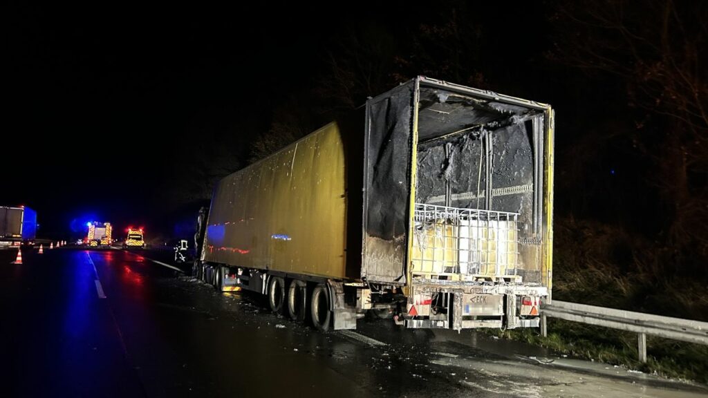 Gegen 21:25 Uhr war die Zugmaschine des Sattelzuges vermutlich aufgrund eines technischen Defekts auf dem Seitenstreifen in Brand geraten. Die Flammen griffen rasch auf den Auflieger über und beschädigten rund 20 IBC-Behälter, die mit verschiedenen säurehaltigen Produkten befüllt waren. Der 53-jährige Fahrer aus dem Landkreis Groß-Gerau konnte sich rechtzeitig in Sicherheit bringen und blieb unverletzt. Feuerwehren aus dem Raum Hann. Münden löschten den Brand.