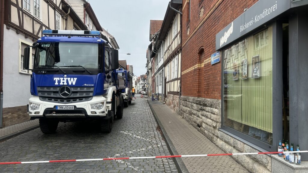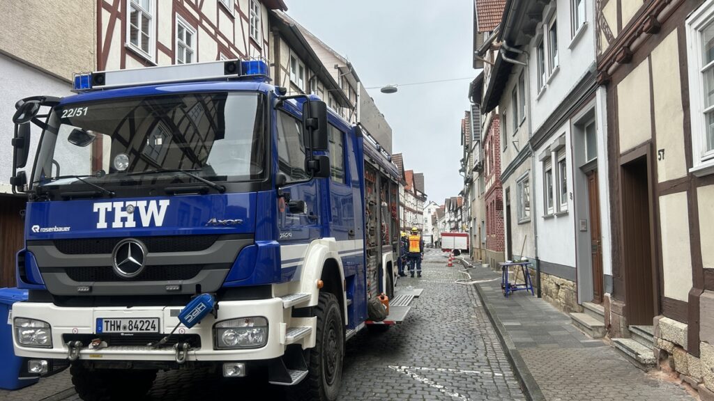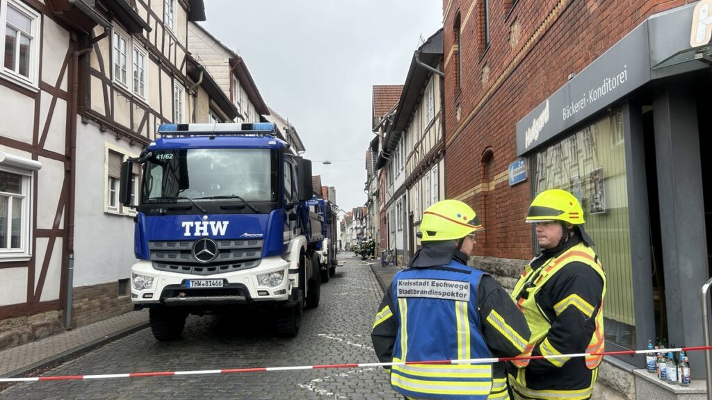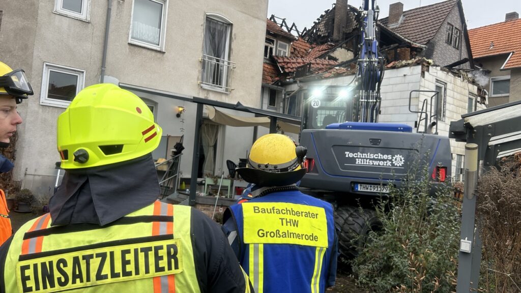 Seit den frühen Morgenstunden ist die Feuerwehr Eschwege sowie das THW bei dem Gebäude erneut im Einsatz. Das THW muss einige Teile des Gebäudes mit einem Bagger abtragen, damit die Feuerwehr letzte Glutnester ablöschen kann.