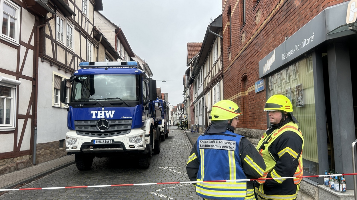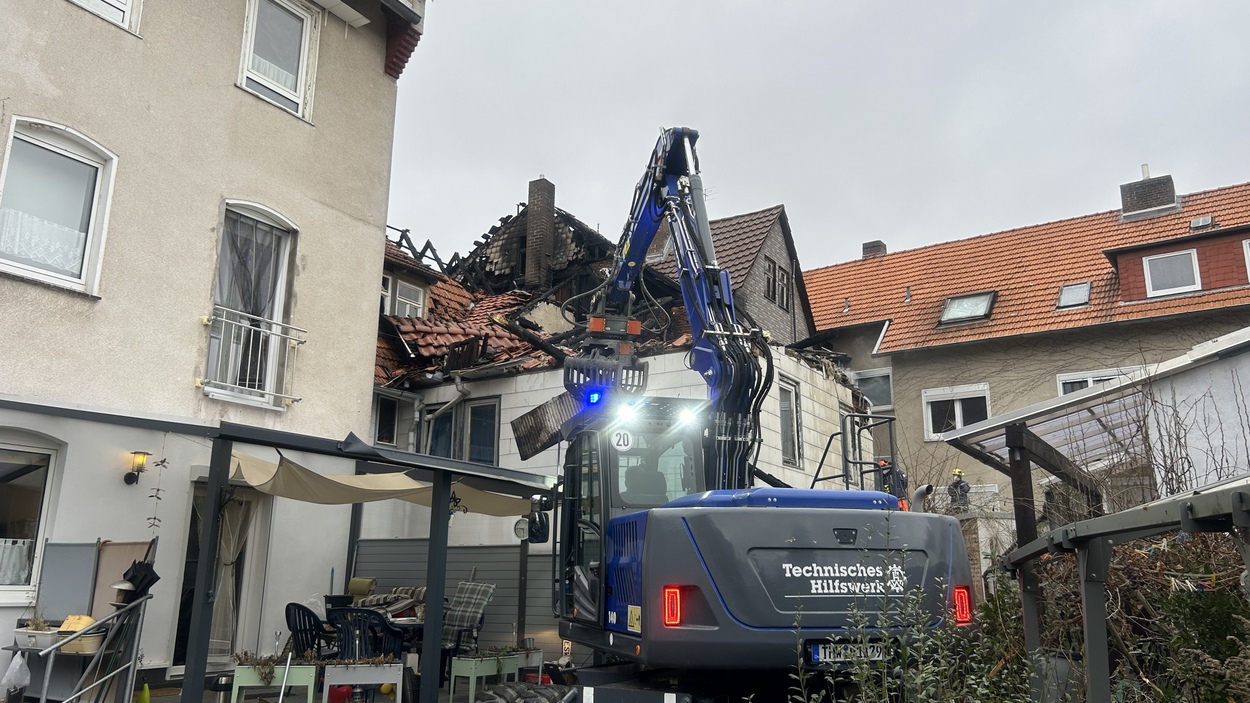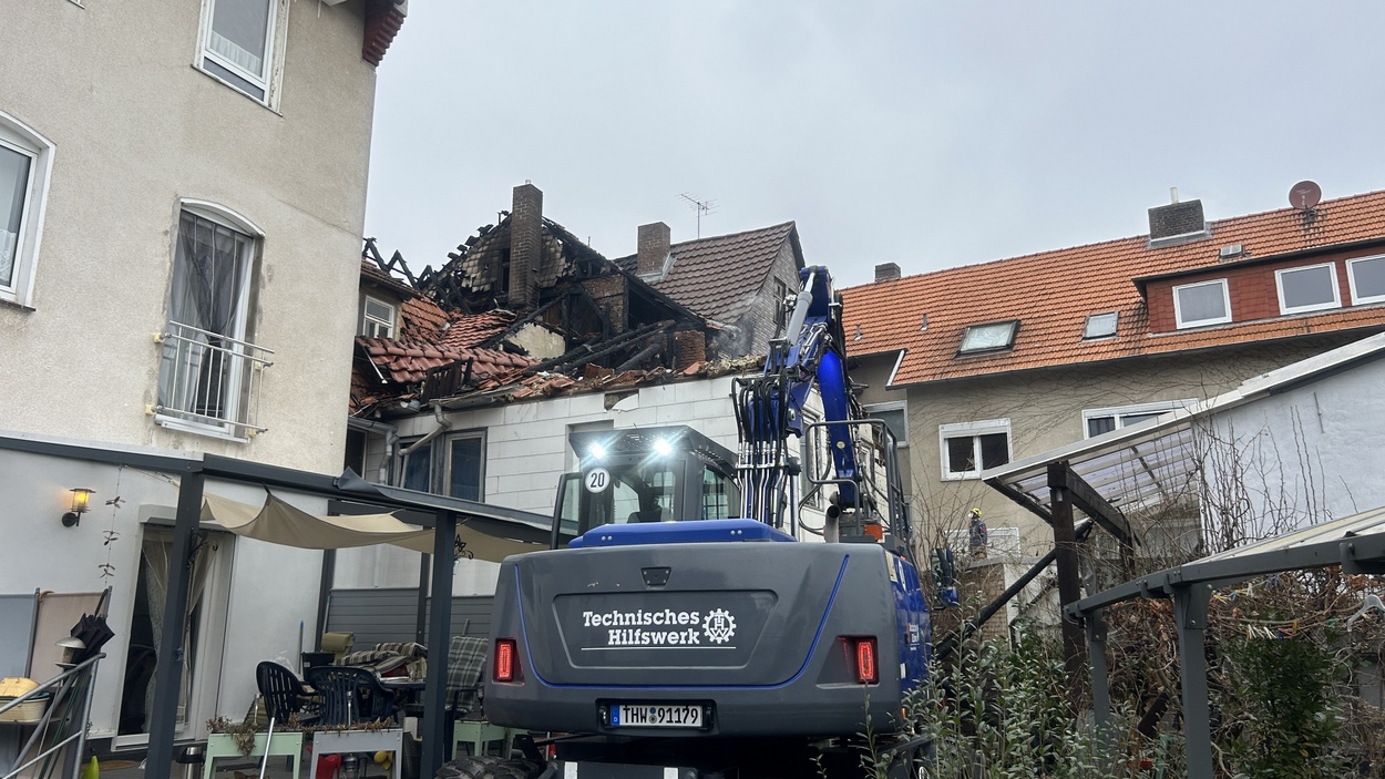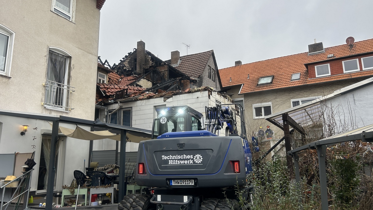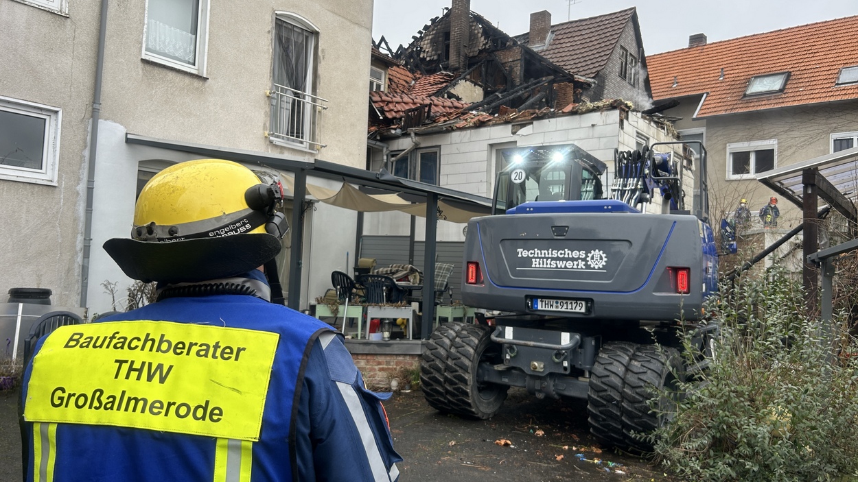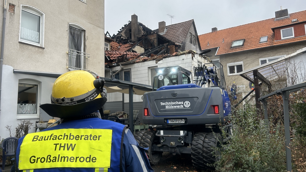 Seit den frühen Morgenstunden ist die Feuerwehr Eschwege sowie das THW bei dem Gebäude erneut im Einsatz. Das THW muss einige Teile des Gebäudes mit einem Bagger abtragen, damit die Feuerwehr letzte Glutnester ablöschen kann.