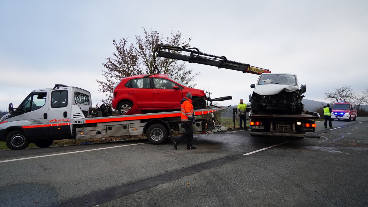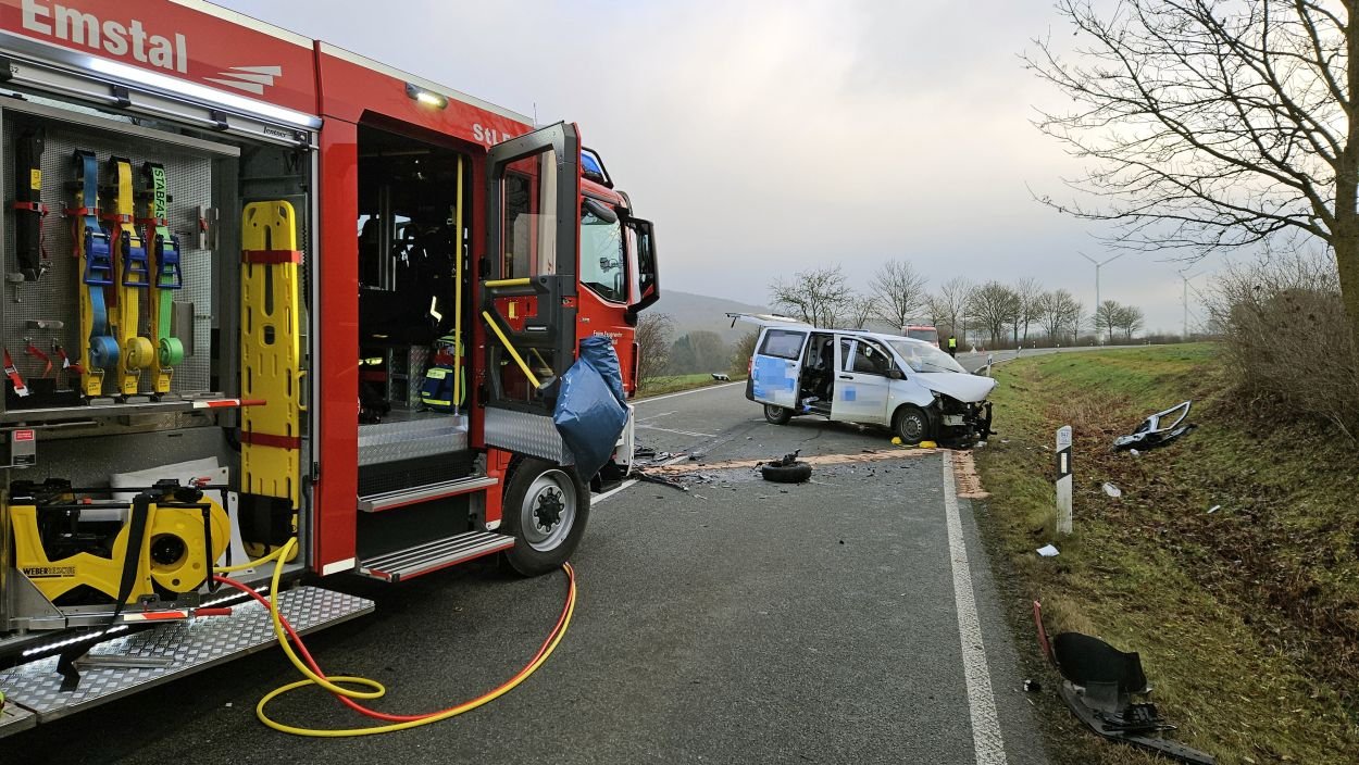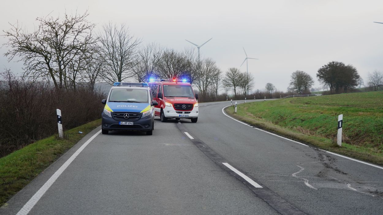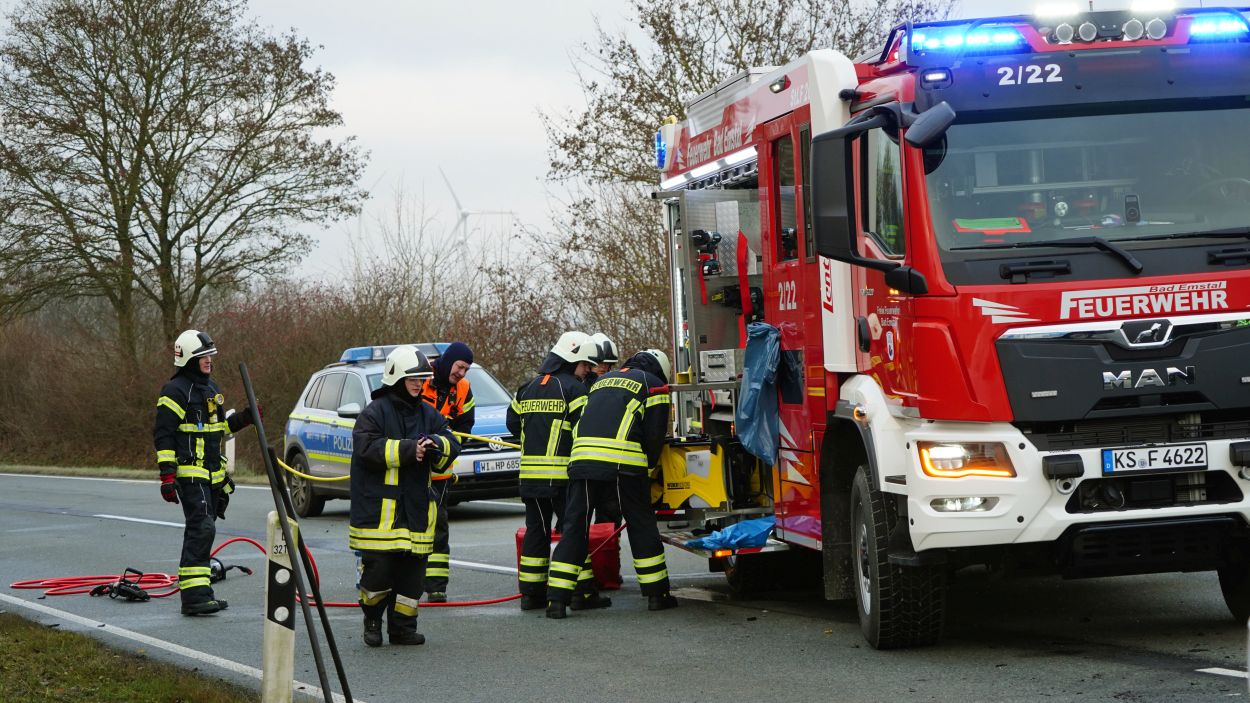 Eine zufällig vorbeifahrende Polizeistreife begann sofort mit ersten Rettungsmaßnahmen. Der 45-jährige Mann aus dem Landkreis Kassel erlitt jedoch so schwere Verletzungen, dass er noch an der Unfallstelle verstarb. Die Fahrerin des Mercedes wurde bei dem Zusammenstoß in ihrem Fahrzeug eingeklemmt und musste von der Feuerwehr mit schwerem Gerät befreit werden. Nach etwa 30 Minuten konnte sie dem Rettungsdienst übergeben werden. Sie wurde mit schweren, aber nicht lebensgefährlichen Verletzungen in ein Krankenhaus eingeliefert. Während der umfangreichen Rettungs- und Bergungsarbeiten blieb die L 3215 zwischen dem Abzweig zur B 450 und Schauenburg-Martinhagen mehrere Stunden voll gesperrt. Die Vollsperrung konnte gegen 11 Uhr aufgehoben werden. Beide beteiligten Fahrzeuge wurden sichergestellt. Zur Klärung der Unfallursache hat die Polizei die Ermittlungen aufgenommen, ein Gutachter wurde hinzugezogen. Rund 60 Einsatzkräfte von Feuerwehr, Rettungsdienst und Polizei waren vor Ort. Die Feuerwehr Bad Emstal wurde dabei durch die Feuerwehr Schauenburg-Martinhagen unterstützt. Aufgrund der belastenden Einsatzlage ist für die Einsatzkräfte am Abend eine Nachbesprechung mit psychologischer Betreuung vorgesehen.