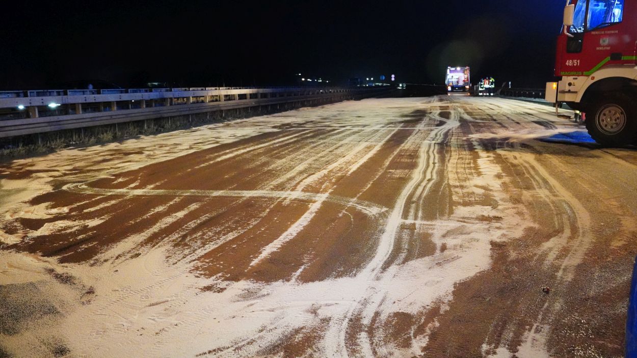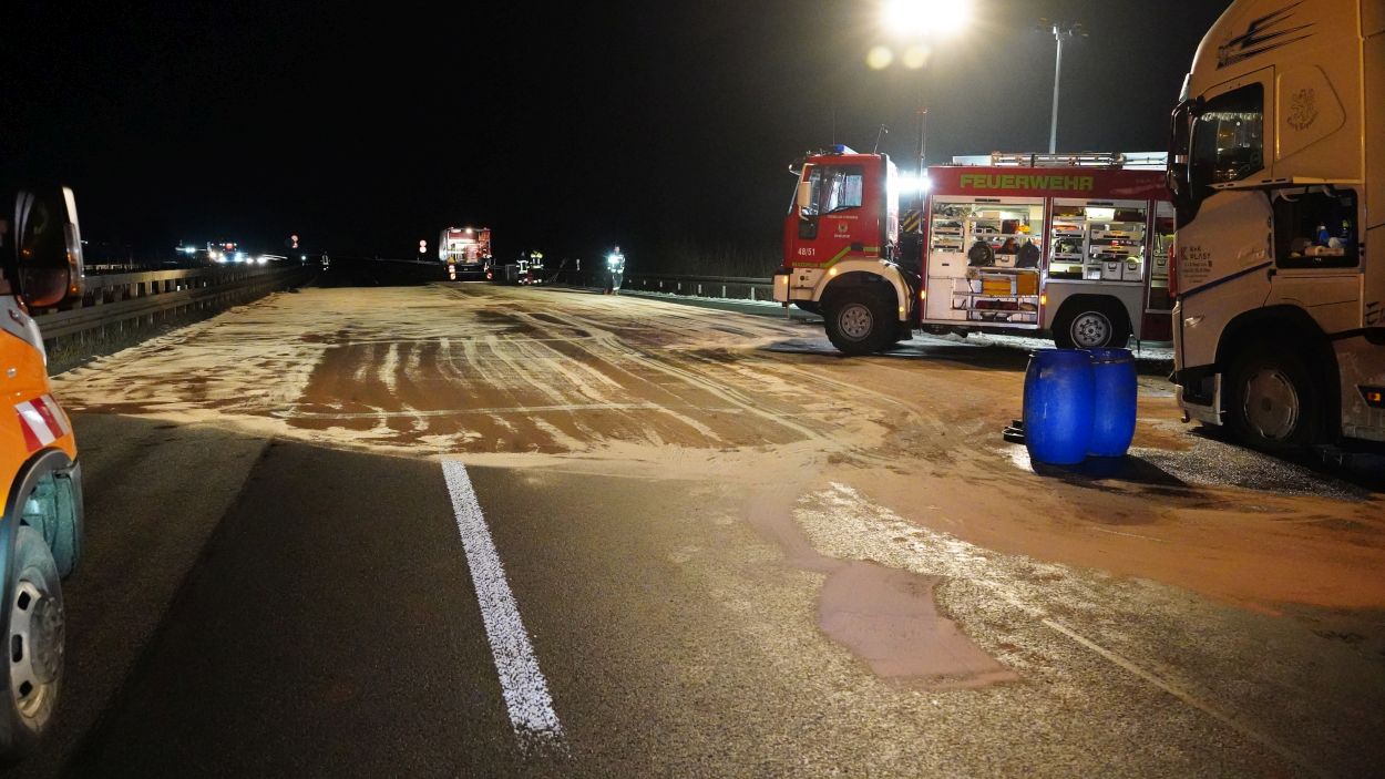 Umgehend wurden Maßnahmen ergriffen, um weiteren Kraftstoffaustritt zu verhindern und ein Eindringen des Diesels in die Kanalisation zu unterbinden. Anschließend musste großflächig Bindemittel auf die Fahrbahn aufgebracht werden. Der Einsatz zog sich bis in die späten Abendstunden. Eine Kehrmaschine übernahm schließlich die Beseitigung des kontaminierten Bindemittels. Zudem wurde ein Spülwagen angefordert, der die Kanalisation reinigte. Durch die Vollsperrung kam es zu einem mehrere Kilometer langen Rückstau. Wann die Vollsperrung aufgehoben werden kann, ist unklar.