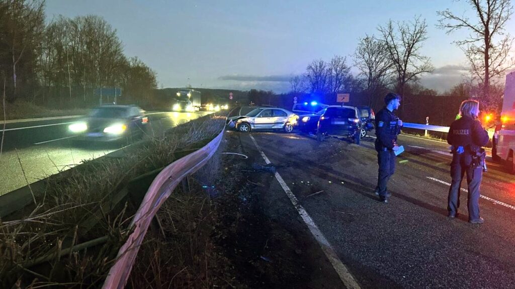 Kaufungen – Auf der B7 kam es am Dienstagnachmittag zwischen Niederkaufungen und Oberkaufungen zu einem Verkehrsunfall. Nach Angaben der Polizei befuhr ein 20-Jähriger gegen 17:30 Uhr mit seinem Honda die K10/L3203 und wollte die Auffahrt Lohfelden auf die B7 nutzen. Beim Auffahren verlor der Fahrer die Kontrolle über sein Fahrzeug und kollidierte mit zwei weiteren Pkw, die in Fahrtrichtung Eschwege unterwegs waren. Der 20-Jährige sowie die beiden Fahrerinnen im Alter von 45 und 35 Jahren wurden leicht verletzt und vorsorglich in ein Krankenhaus gebracht. Der entstandene Sachschaden wird auf rund 30.000 Euro geschätzt. Aufgrund von Bergungs- und Reinigungsarbeiten war die B7 bis 20:30 Uhr voll gesperrt.
