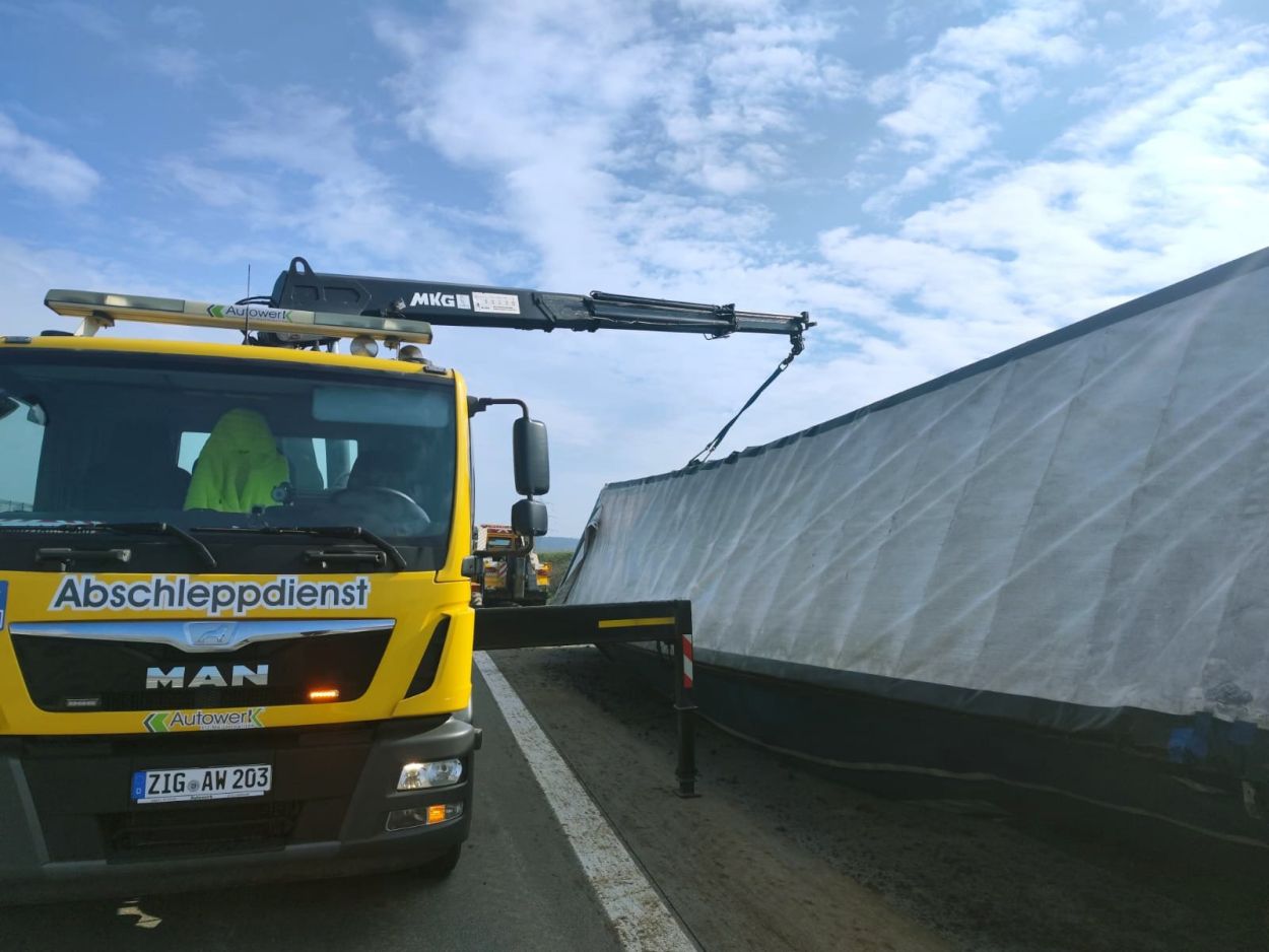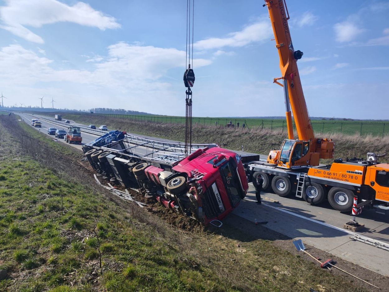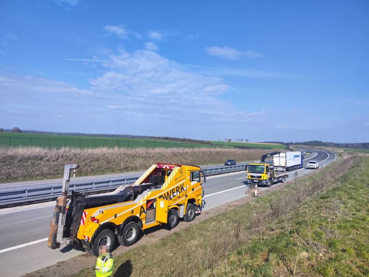 Akzuell: Stand 18 Uhr ist die Autobahn weiterhin gesperrt. Eine Kehrmaschine beseitigt derzeit die letzten Spuren des Unfalls, danach soll die Vollsperrung aufgehoben werden. Zur Unfallursache gibt es bislang keine Angaben. Der entstandene Schaden wird auf etwa 45.000 Euro geschätzt.
