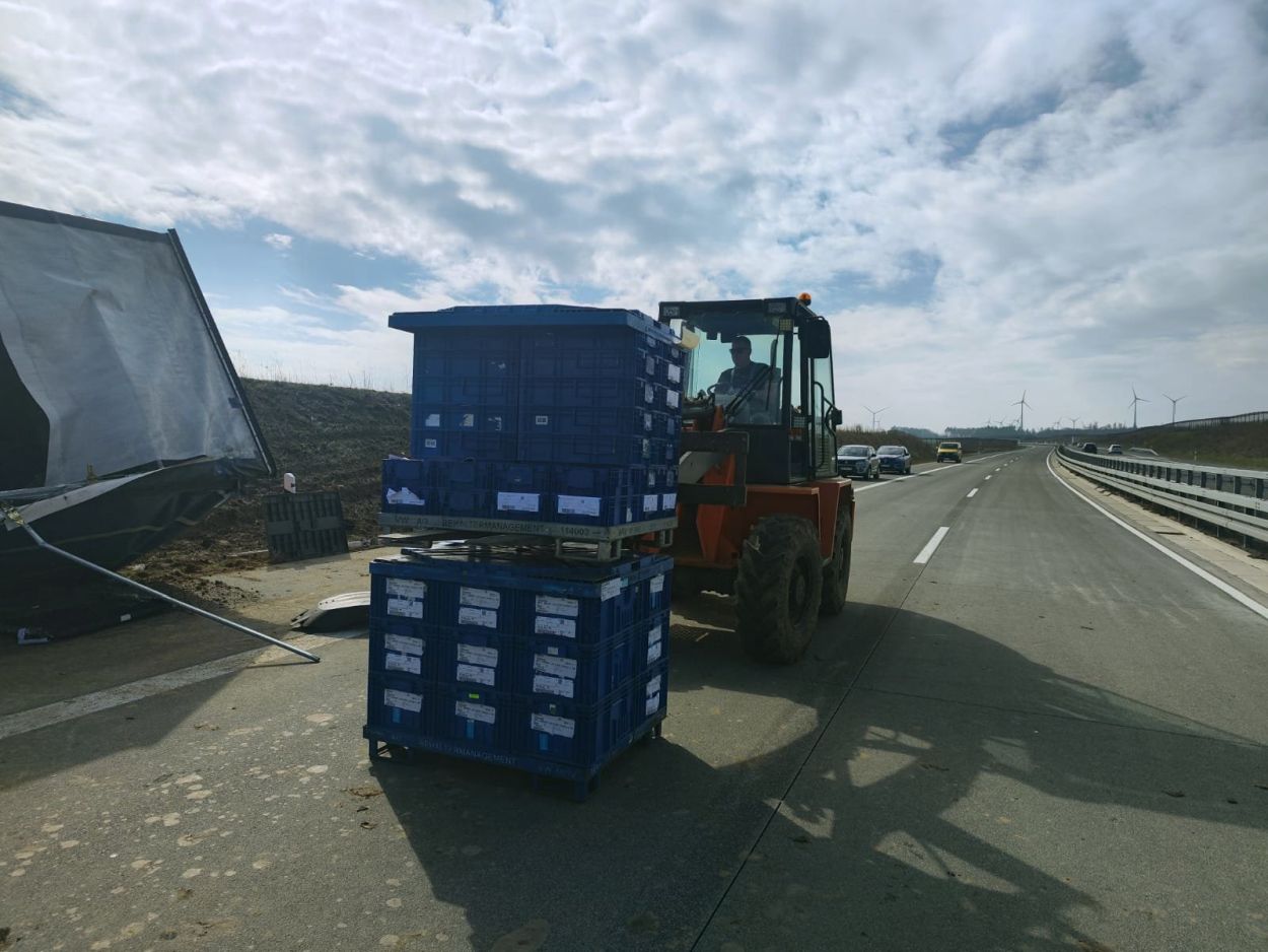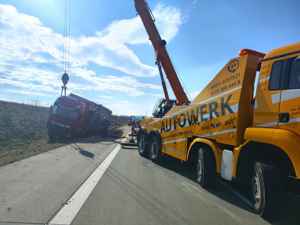 Der Sattelauflieger war mit rund elf Tonnen Stückgut, darunter Autoteile von VW und Audi, beladen. Vor der Bergung des Lkw mussten diese per Hand entladen werden. Für die aufwendigen Bergungsarbeiten musste die Autobahn ab 10 Uhr in Fahrtrichtung Kassel vollständig gesperrt werden. Im Einsatz für die Bergung war ein Mobilkran, ein Kranfahrzeug, ein Radlader, eine Kehrmaschine sowie ein zusätzlicher Sattelzug zum Umladen der Autoteile. Die Bergung gestaltete sich schwierig, da der Lkw auf der Seite in einem Hang lag. Mit Hilfe des Krans konnte das Fahrzeug schließlich aufgerichtet und aus dem Graben geborgen werden.