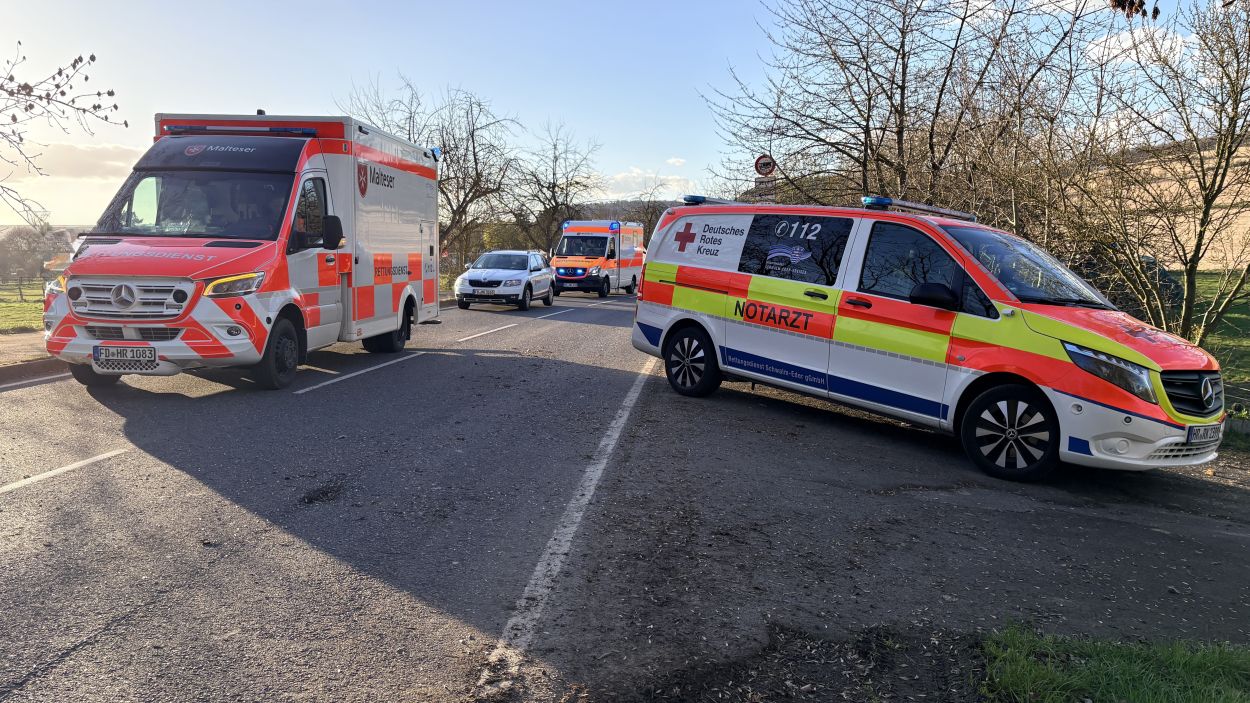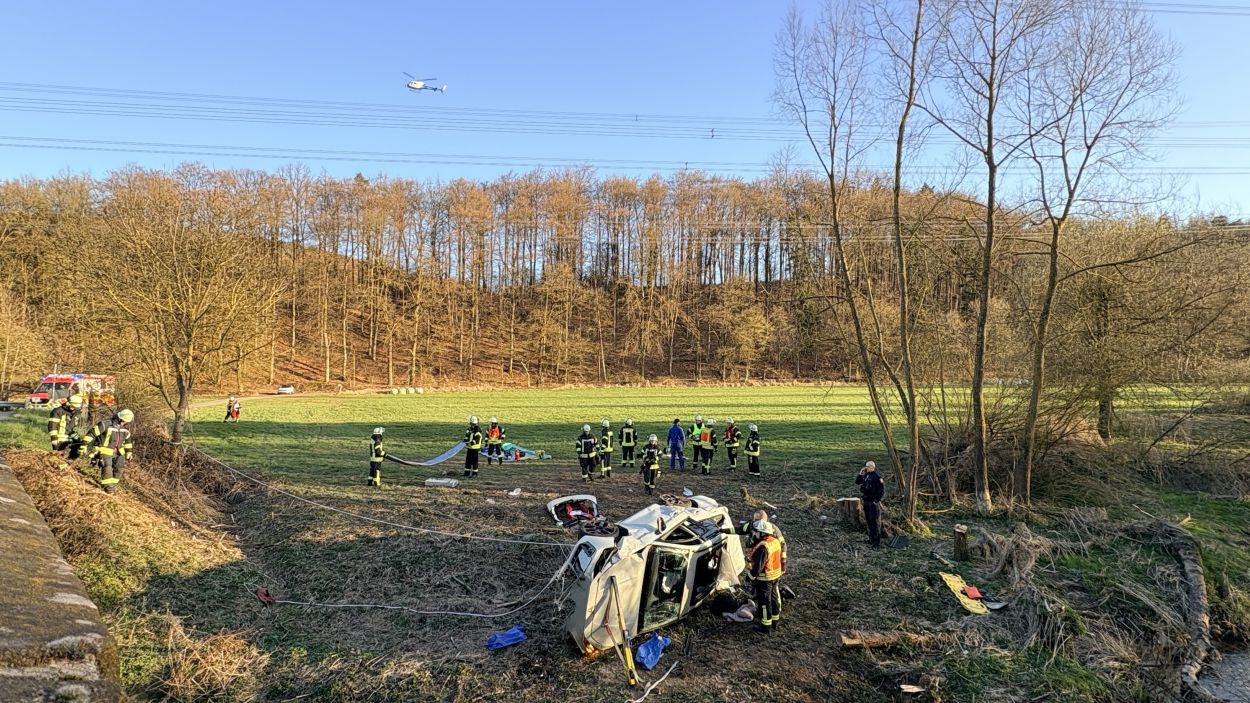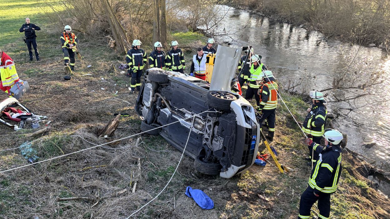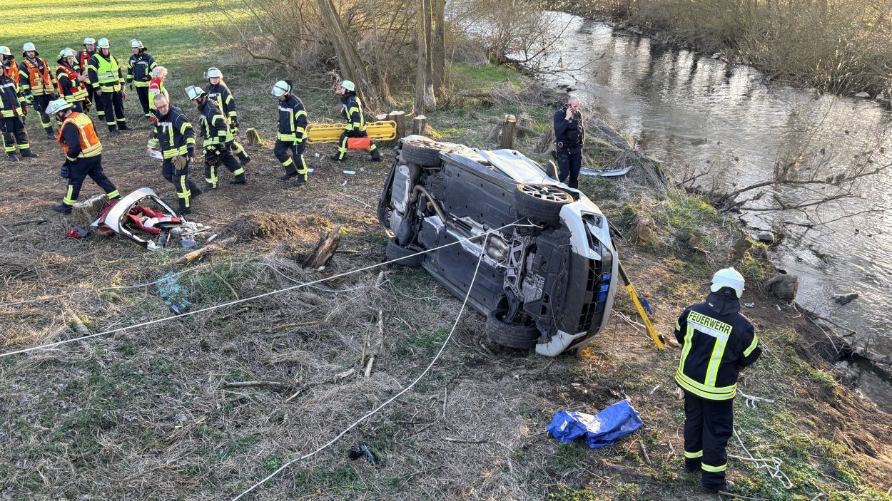 Ein PKW, besetzt mit insgesamt vier Insassen, war auf der K73 zwischen den Borkener Stadtteilen Arnsbach und Kerstenhausen unterwegs. In einer Rechtskurve, nur wenige Meter vor der Schwalmbrücke bei Kerstenhausen, kam das Fahrzeug aus bislang ungeklärten Umständen nach links von der Fahrbahn ab. Der PKW fuhr den Abhang hinunter, überschlug sich und blieb nur wenige Meter vor der Schwalm auf der Fahrerseite liegen. Alle vier Insassen wurden dabei in ihrem Fahrzeug eingeschlossen und konnten dieses zunächst nicht verlassen. Ersthelfer eilten den Verunfallten zur Hilfe, stützten das Fahrzeug vor einem möglichen Umkippen ab und alarmierten die Rettungskräfte. Der Rettungsdienst und die Feuerwehr hatten im Einsatz alle Hände voll zu tun. Der Wagen wurde final von der Feuerwehr gesichert. Im weiteren Verlauf wurden die Verunfallten nacheinander mit vereinten Kräften durch das Panoramadach des Fahrzeuges heraus gerettet und durch die Rettungsteams vor Ort versorgt. Im Anschluss wurden alle vier Verunfallte in umliegende Krankenhäuser transportiert. Der Rettungshubschrauber konnte ohne Patient zurück nach Kassel fliegen.