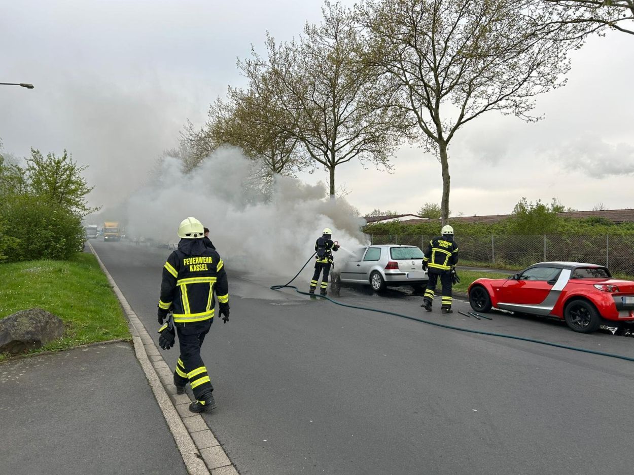 Rund eineinhalb Stunden später, gegen 8:30 Uhr, bemerkten Passanten, dass im Motorraum des Fahrzeugs ein Feuer ausgebrochen war. Die alarmierte Feuerwehr Kassel konnte den Brand unter Atemschutz mit einem Schnellangriff zügig unter Kontrolle bringen. Um die Flammen vollständig zu löschen, wurde die Motorhaube geöffnet. Während der Löscharbeiten musste die Falderbaumstraße zeitweise gesperrt werden. Verletzt wurde bei dem Einsatz niemand. Als Ursache des Feuers geht die Polizei von einem technischer Defekt aus.