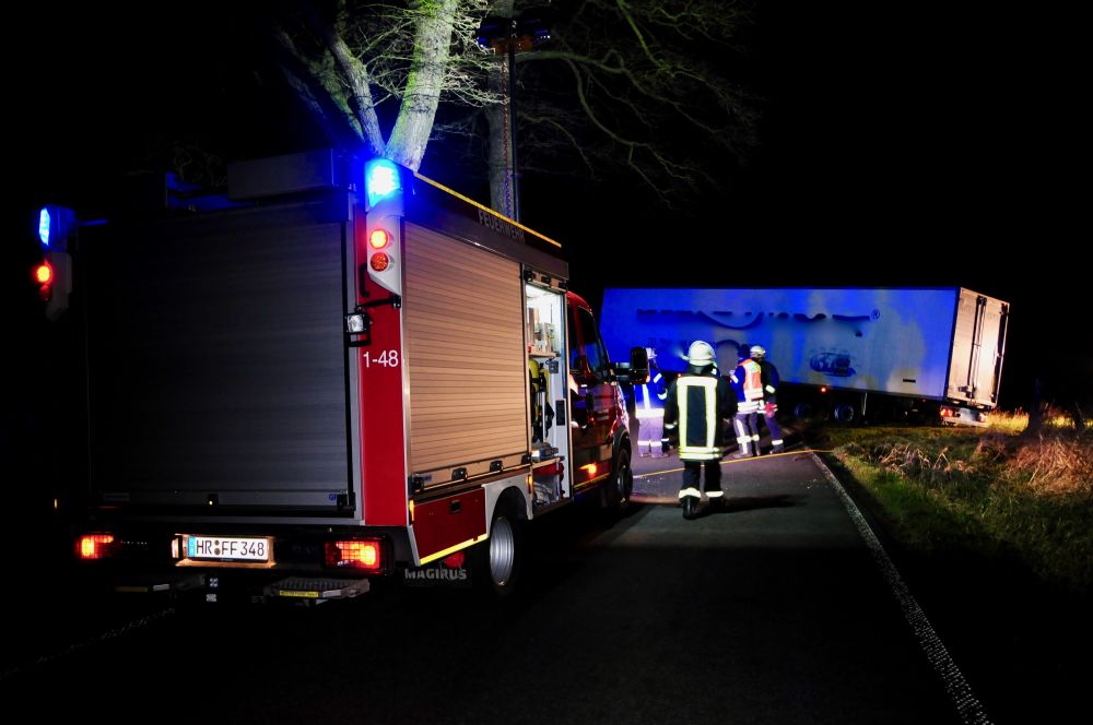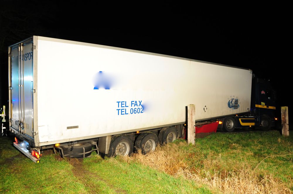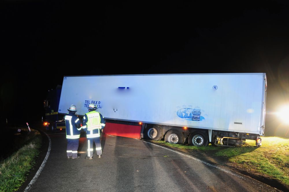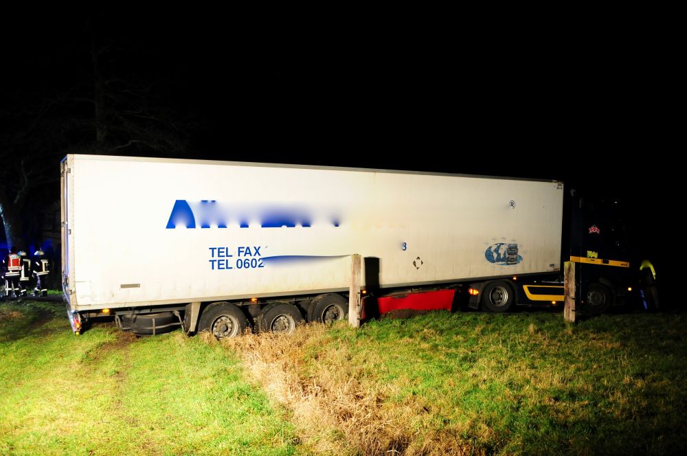 Die Zugmaschine kam zwar auf der Fahrbahn zum Stehen, war aber nicht mehr in der Lage den mit den Achsen über einem Graben hängenden Auflieger aus eigener Kraft aus der misslichen Lage zu ziehen. Auch die alarmierte Feuerwehr aus Allendorf-Landsburg war hier machtlos. Ein LKW-Bergungsdienst übernahm schließlich das herausziehen des Sattelzuges. Verletzt wurde bei dem Wendemanöver niemand. Polizei und Feuerwehr sicherten die Strecke ab. Zur Höhe des Schadens lagen zunächst keine Informationen vor. Die Kreisstrasse 103 war zwischen Rommershausen und Allendorf-Landsburg für über zwei Stunden voll gesperrt. Im Einsatz waren 10 Kameraden der Feuerwehr Allendorf-Landsburg sowie die Polizei Schwalmstadt. (mpu)