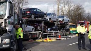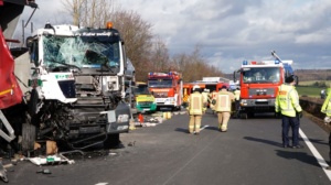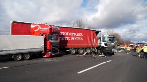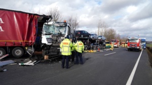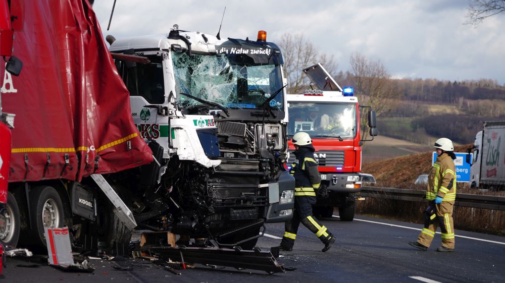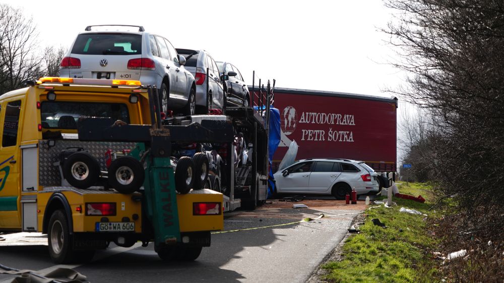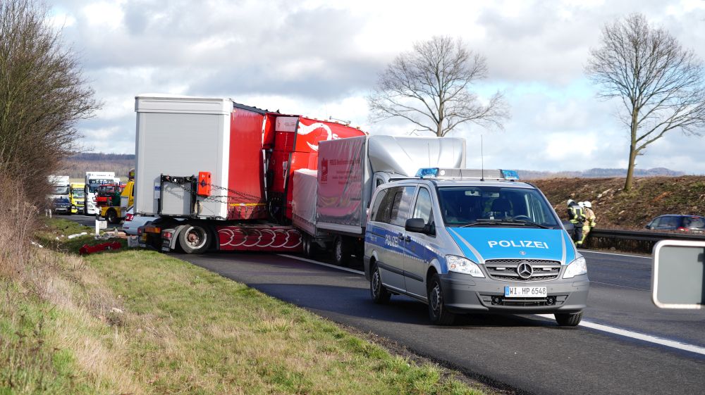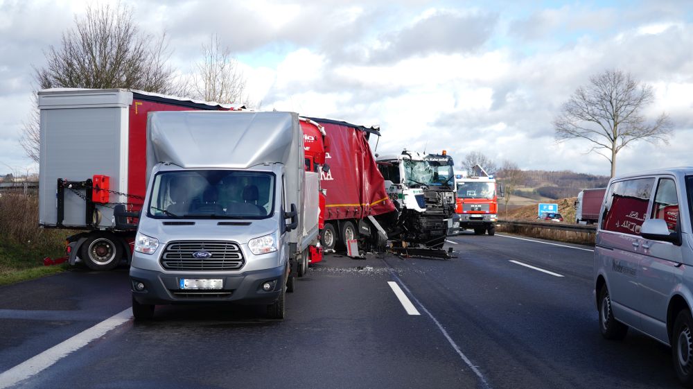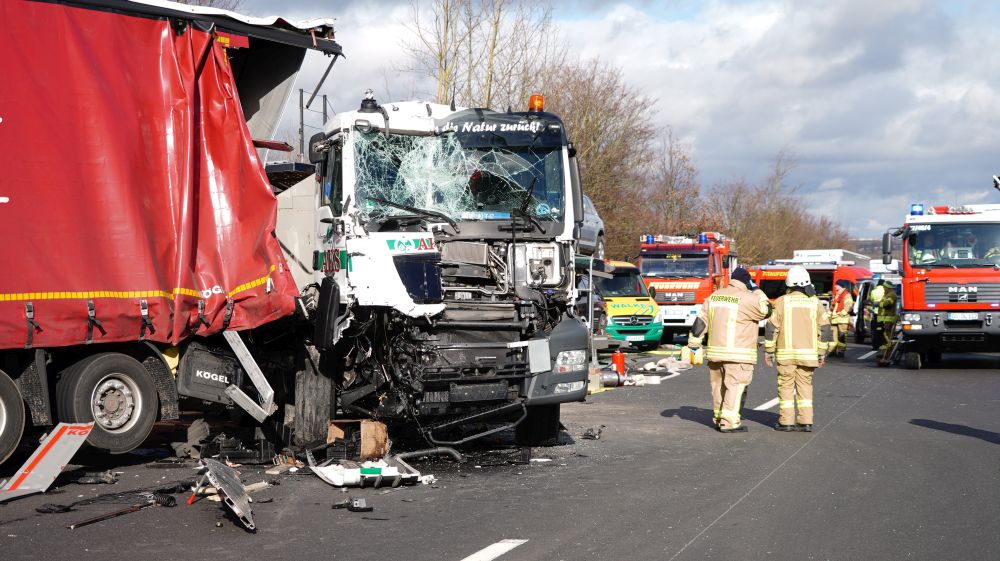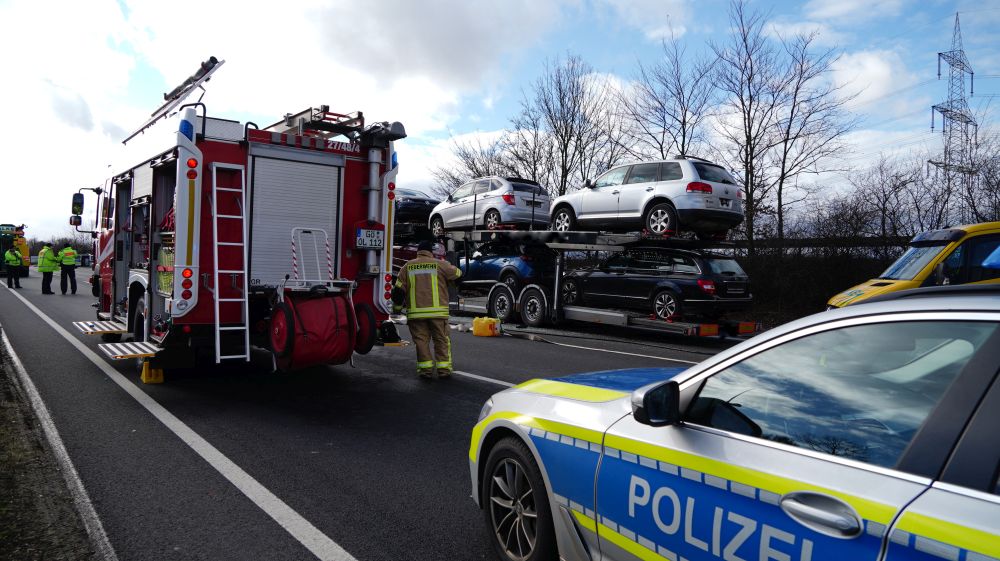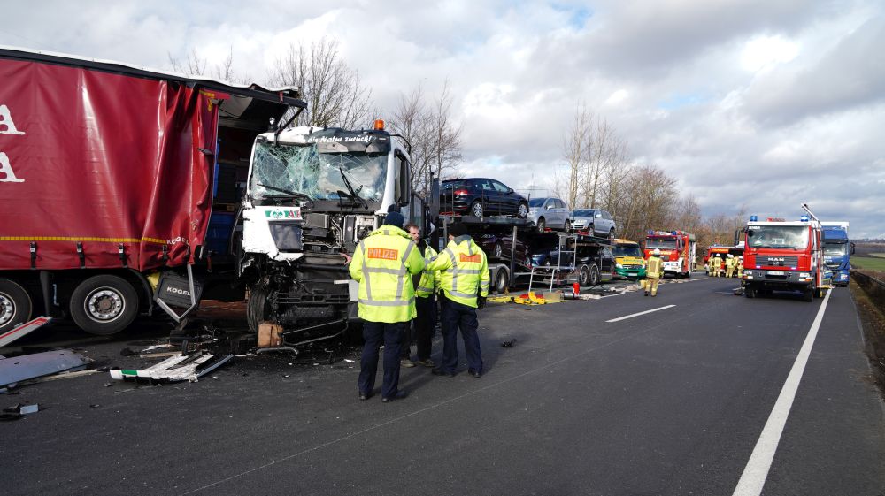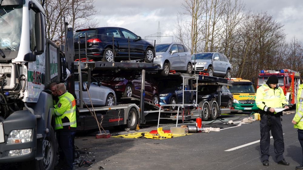Durch die Wucht des Aufpralls wurde dieser Lkw auf einen davorstehenden Sattelzug und dieser wiederum auf einen Kleintransporter mit Anhänger geschoben. Der 61-jährige Fahrer des Autotransporters wurde dabei so schwer verletzt, dass für ihn jede Hilfe zu spät kam. Er verstarb noch an der Unfallstelle. Der aus Velbert in Nordrhein-Westfalen stammende 39-jährige Fahrer des Lkw, auf den der Autotransporter aufgefahren war, sowie der aus Jessen in Sachsen-Anhalt stammende 39-jährige Fahrer des Kleintransporters wurden schwer, aber nicht lebensbedrohlich verletzt. Rettungswagen brachten sie anschließend in Kasseler Krankenhäuser. Der 25-Jährige, aus Tschechien stammende Fahrer des an zweiter Position stehenden Sattelzuges kam letztlich mit dem Schrecken davon und wurde nicht verletzt. Die Höhe des Sachschadens beläuft sich insgesamt auf ca. 300.000 Euro. Alle Fahrzeuge waren bei dem schweren Unfall erheblich beschädigt worden und mussten abgeschleppt werden. An dem Autotransporter, der mit fünf Gebrauchtwagen beladen war, war ein Totalschaden in Höhe von ca. 160.000 Euro entstanden. Den an dem Lkw entstanden Schaden schätzen die Beamten der Polizeiautobahnstation auf 80.000 Euro, den am Sattelzug auf 40.000 und an dem Kleintransporter mit Anhänger auf 15.000 Euro. Aufgrund der erforderlichen umfangreichen Bergungs- und Reinigungsarbeiten musste die A 7 in Richtungen Süden für lange Zeit voll gesperrt werden. Es kam zu erheblichen Verkehrsbehinderungen auf der A 7 Richtung Kassel und den Umleitungsstrecken. Die Arbeiten an der Unfallstelle dauerten bis in die Nacht. Die Vollsperrung konnte erst gegen 1:45 Uhr wieder aufgehoben werden. Die weiteren Ermittlungen zum Unfallhergang dauern an und werden bei der Polizeiautobahnstation Baunatal geführt.