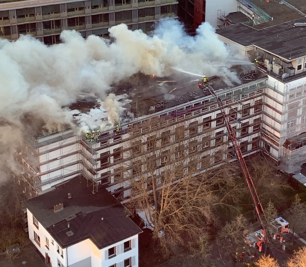 Wegen Bauarbeiten war das Gebäude jedoch rundum eingerüstet und es bestand dadurch die Möglichkeit über Gerüsttreppen das Dach zu erreichen. Dabei wurde dann von den Einsatzkräften mit Spezialwerkzeugen die Dachhaut geöffnet und Löschwasser und Löschschaum in die Öffnungen eingebracht um die Brände, im Innern zu löschen. Außerdem wurden auch an den Dachkanten zusätzliche Öffnungen geschaffen um Löschwasser und -schaum in das Innere der Konstruktion einzubringen. Alle diese Arbeiten führten letztendlich zum Erlöschen des Brandes und nach dem Aufspüren und Ablöschen aller übrigen Glutnester konnte „Feuer aus“ gemeldet werden. Die Feuerwehren, Freiwillige und Berufsfeuerwehr waren mit zahlreichen Einsatzkräften und -fahrzeugen, sowie Spezialeinheiten (HÖRG) vor Ort. Es waren dies die Wehren aus Schwanheim, Zeilsheim, Fechenheim, Unterliederbach, Niederursel, Seckbach, Niedererlenbach, Oberrad, Berkersheim und Nied, sowie die Kräfte mehrerer Wachen der Berufsfeuerwehr. Die Höhe des Sachschadens ist noch nicht absehbar, die Brandursache wird von der Polizei ermittelt. Verletzt wurde niemand.