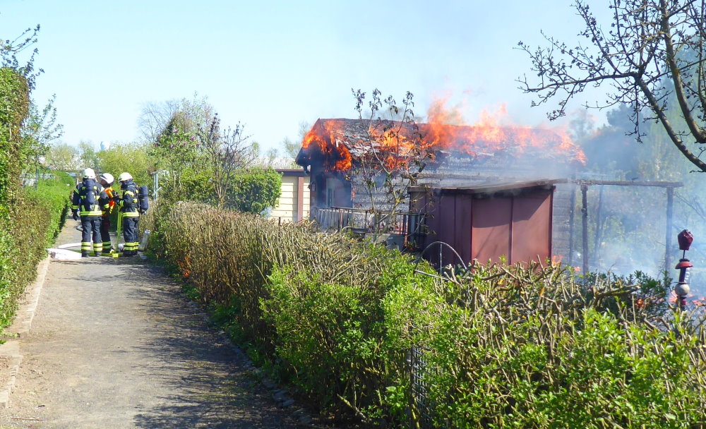Kassel – Eine Gartenhütte brannte am Dienstagnachmittag im Kleingartengelände Frasenweg in voller Ausdehnung. Die Feuerwehr verhinderte durch ihr schnelles eingreifen ein übergreifen der Flammen auf benachbarte Gartenhütten. Gegen 14:40 Uhr wurde die Feuerwehr alarmiert. Mehrere Gasflaschen sollten laut Anruferin in der brennenden Gartenhütte gelagert sein. Daraufhin entsendete die Leitstelle umgehend den Löschzug der Feuerwache 1 und die Freiwillige Feuerwehr Harleshausen.