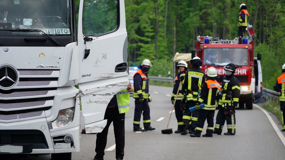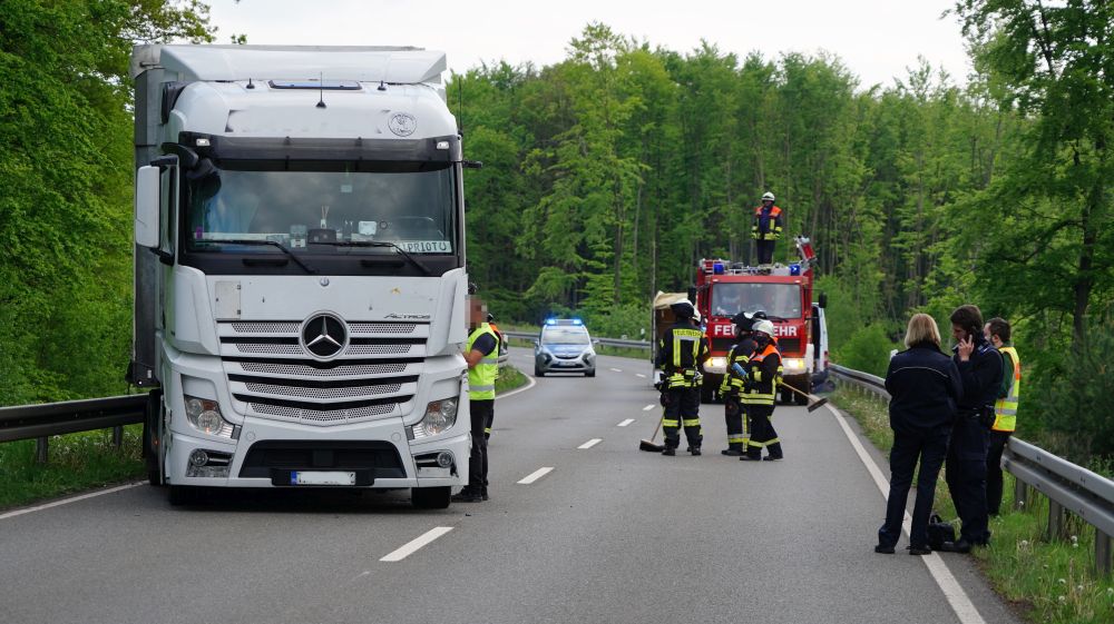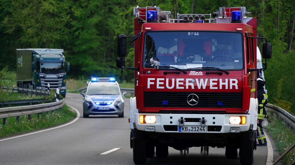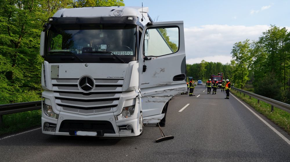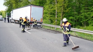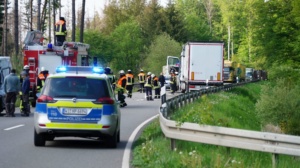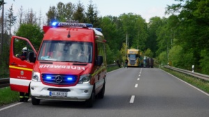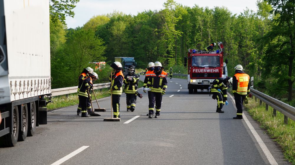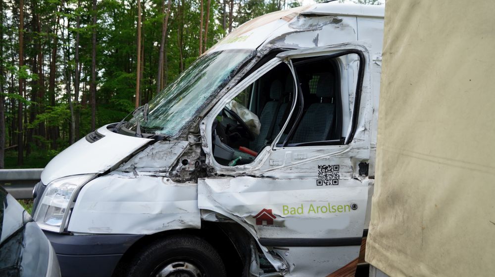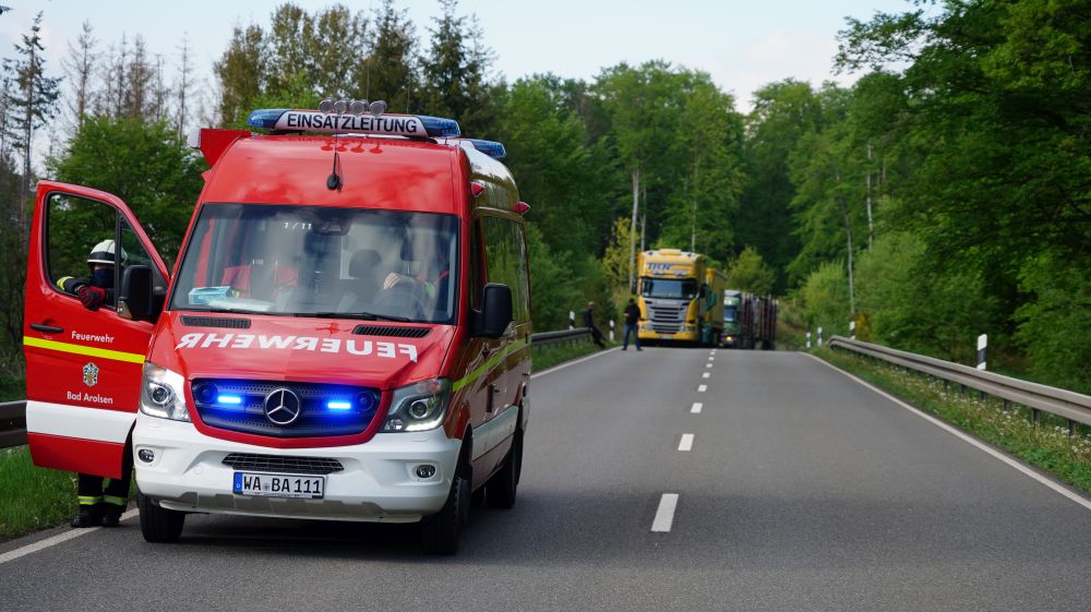 Der Transporter kam einige Meter weiter zum Stehen. Der Fahrer wurde leicht verletzt und vorsorglich in ein Krankenhaus eingeliefert. Die alarmierte Feuerwehr wurde mit dem Alarmstichwort „HGefahr 1“ alarmiert, da man zunächst davon ausging, dass der LKW mit Gefahrgut beladen war. Wenig später stellte sich heraus, dass der Auflieger mit Reifen beladen war. Der Sachschaden wird auf über 50.000 Euro geschätzt. Im Einsatz war die Feuerwehr Bad Arolsen und Mengeringhausen mit 45 Einsatzkräften. Die B 450 war für rund 90 Minuten voll gesperrt.