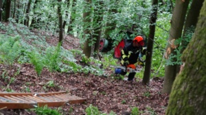 Die alarmierte Feuerwehr befreite den Fahrer aus seiner misslichen Lage mit Hilfe einer Schleifkorbtrage. Anschließend wurde der Mann mit einem Rettungshubschrauber in ein Krankenhaus geflogen. Über die Art der Verletzungen ist derzeit noch nichts bekannt.