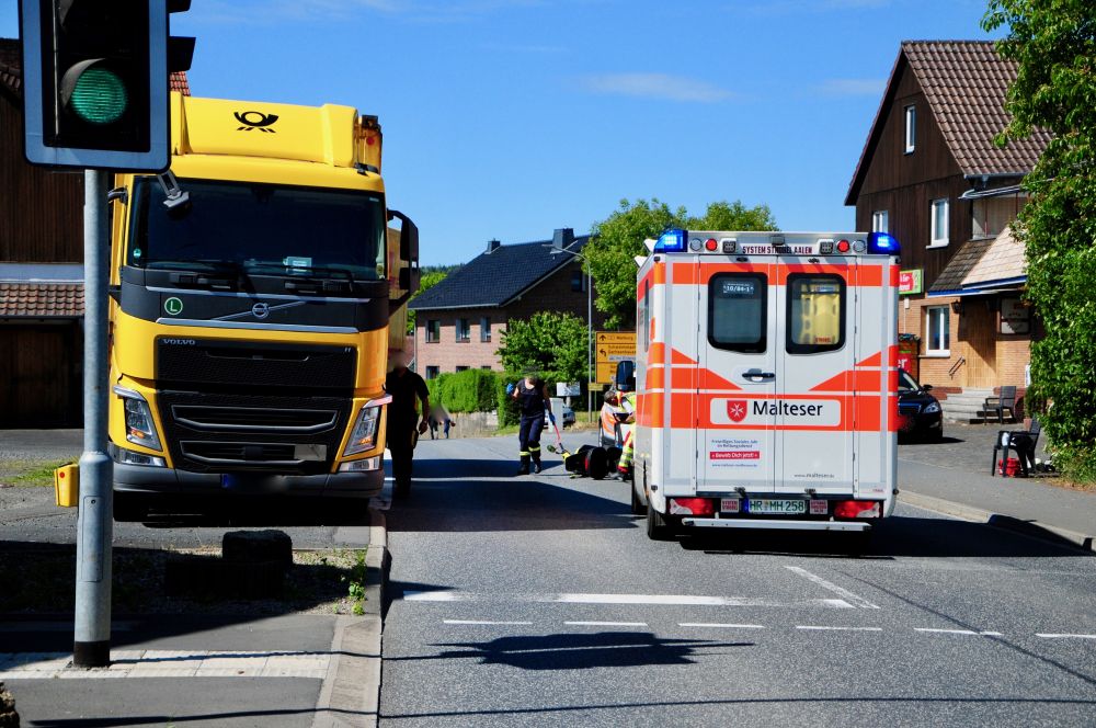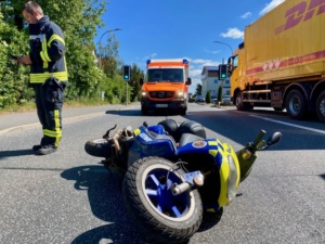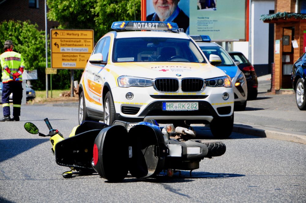Der Mann trug nach ersten Erkenntnissen keinen Sturzhelm. Durch den Sturz auf den Asphalt zog sich der Gilserberger schwere Verletzungen zu. Dabei hatte der Rollerfahrer noch Glück im Unglück. Ein ihm entgegenkommender Gliederzug eines Paketdienstes konnte dem Verunfallten noch rechtzeitig auf einen Gehweg ausweichen. Ersthelfer kümmerten sich bis zum eintreffen der ersten Einsatzkräfte um den Verletzten. Nach seiner Erstversorgung durch den Rettungsdienst wurde der Mann mit dem Rettungshubschrauber in eine Kasseler Klinik geflogen. Die Ortsdurchfahrt von Gilserberg war während der Rettungsmaßnahmen und Unfallaufnahme für rund eine Stunde für den Verkehr voll gesperrt. Neben dem Rettungsdienst, einem Notarzt und der Besatzung von Christoph 7 waren auch die First Responder der Feuerwehr Gilserberg sowie die Polizei Schwalmstadt vor Ort im Einsatz. Am Roller entstand ein geringer Sachschaden. (mpu)