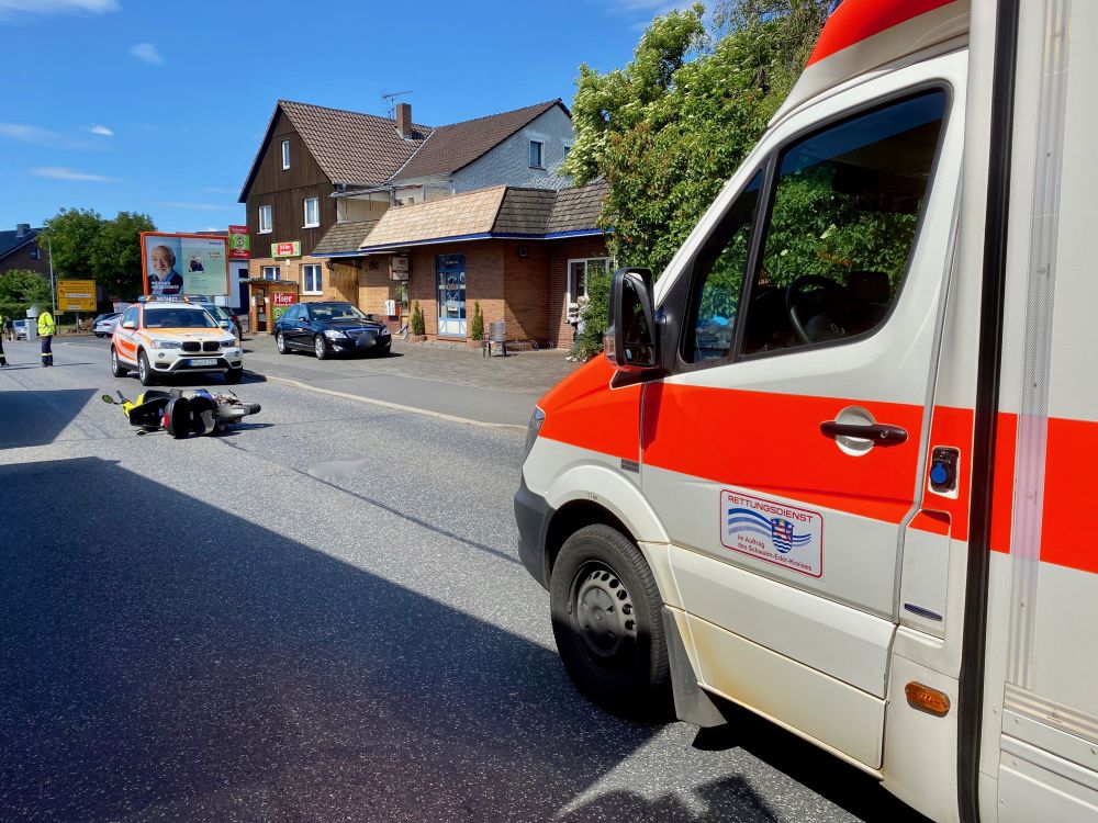 Gilserberg – Ohne jegliche Fremdbeteiligung stürzte am Samstag ein Rollerfahrer auf der Kasseler Straße in der Ortsdurchfahrt von Gilserberg. Der Mann zog sich schwere Verletzungen zu. Auch ein Rettungshubschrauber kam zum Einsatz. Ein 63 jähriger Mann war mit seinem Roller im Bereich der Ortsdurchfahrt Gilserberg in Fahrtrichtung Marburg unterwegs, als er nach Informationen von der Einsatzstelle kurz hinter der „Berggartenstrasse“ einfach umfiel.
