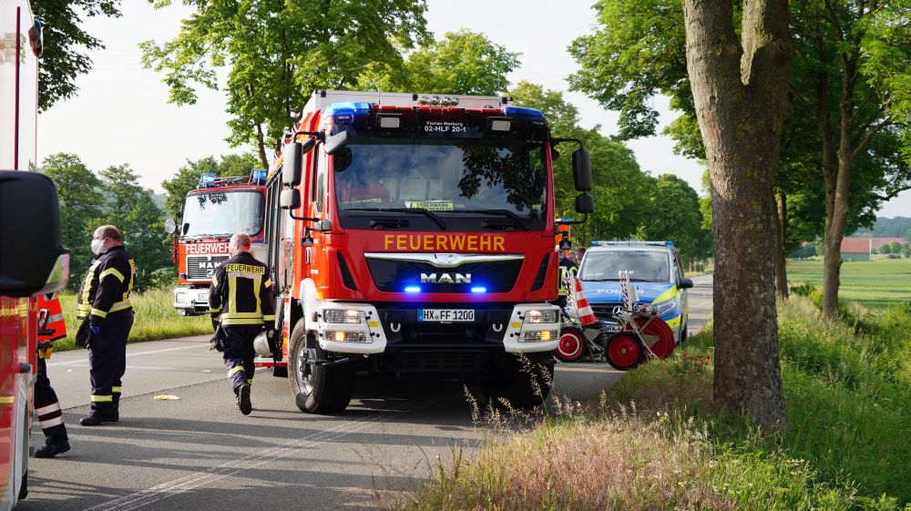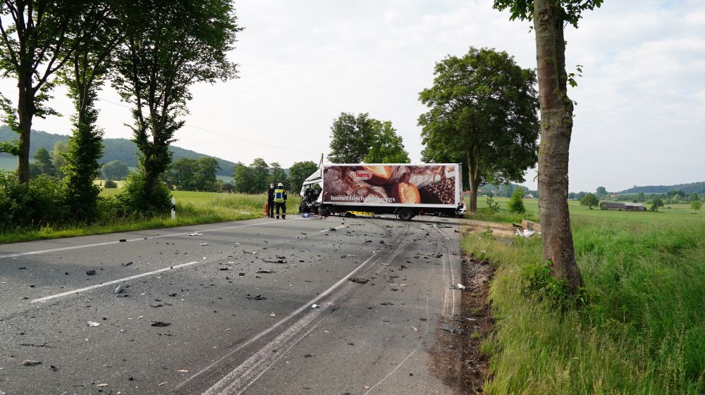 Warburg (NRW) – Auf der L828 zwischen Scherfede und Willebadessen kam es am Montagmorgen zu einem tödlichen Verkehrsunfall. Ein 29-Jähriger Mann befuhr mit seinen Transporter gegen 06.25 Uhr die Landstraße in Fahrtrichtung Willebadessen. Aus bislang noch nicht geklärter Ursache, kam der 29-Jährige in den Gegenvekehr und prallte frontal mit einem LKW zusammen. Der LKW-Fahrer wurde in seinem Fahrzeug massiv eingeklemmt und musste von der Feuerwehr mit schwerem Gerät befreit werden.