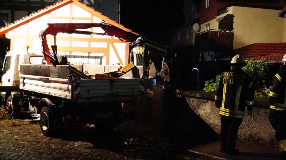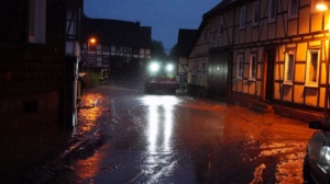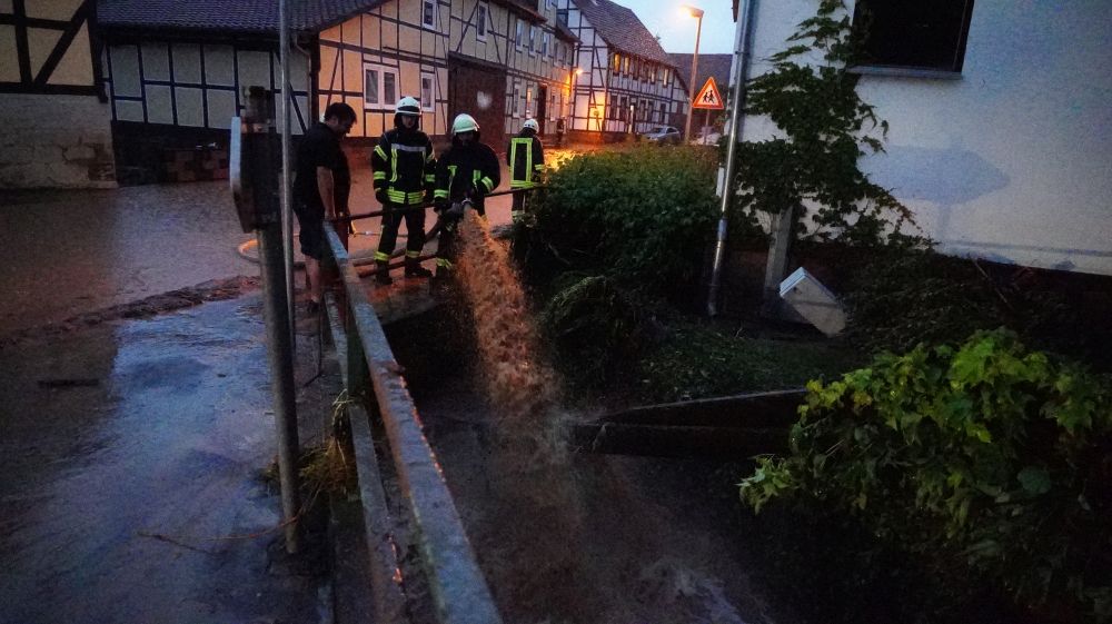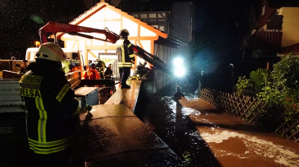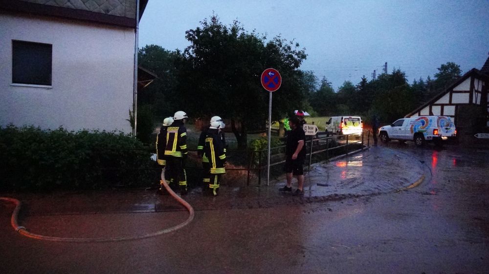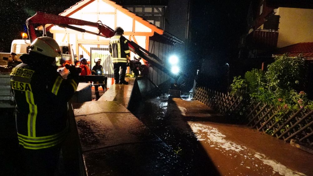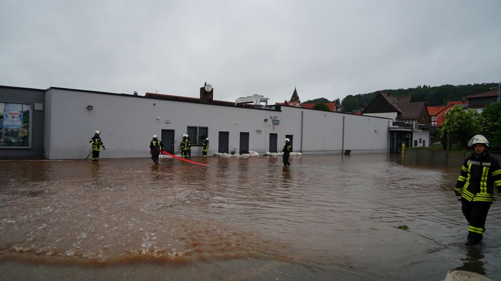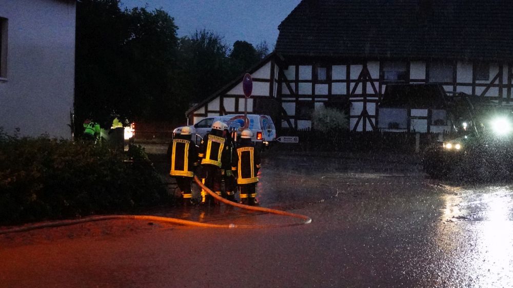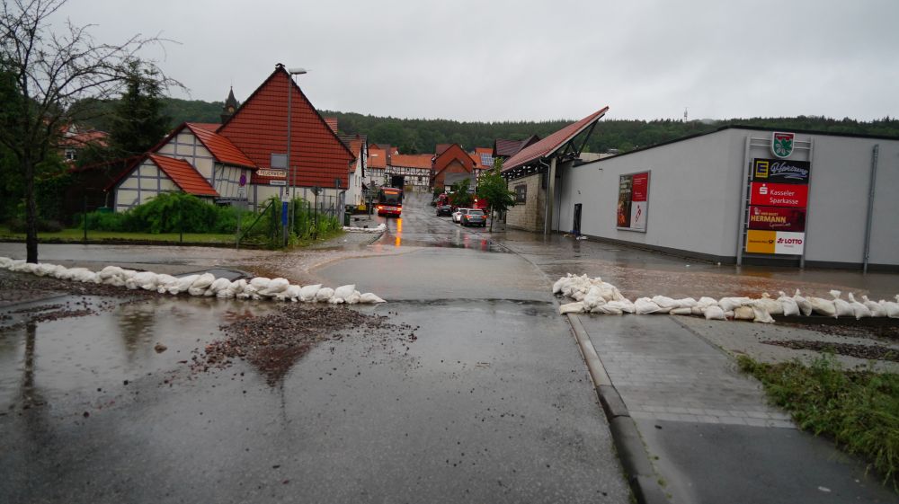 In der Nacht von Sonntag auf Montag tobte sich erneut ein Unwetter in Nordhessen aus. Bis in die frühen Morgenstunden waren die Einsatzkräfte unterwegs. In Helsa war der Bach übergelaufen, weil angeschwemmtes Holz und Geröll das Wasser aufgestaut hatte. Mit einem Greifarm wurde das Material aus dem Bach gehoben und abtransportiert. Dennoch sind mehrere Keller vollgelaufen. In Nieste trat ebenfalls der Bach über das Ufer und sorgte für absolutes Chaos. Ein Einkaufsmarkt wurde geflutet, was erheblichen Schaden verursachte. Das Feuerwehrgerätehaus lief ebenfalls voll und machte Einsatzklamotten und Spinde der Kameraden vorerst unbrauchbar. Die vor der Halle geparkten Fahrzeuge wurden von den Wassermassen angehoben und zur Seite geschoben. In Witzenhausen Gertenbach sammelte sich das Wasser in der Ortschaft und sorgte für Schlamm und voll gelaufene Keller. In Lohfelden kümmerten sich die Kameraden um das befüllen von Sandsäcken um die Einsatzkräfte mit dem Nötigsten zu versorgen.