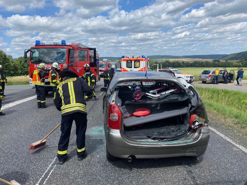 Kurz vor Oberurff, in Höhe der Aussiedlerhöfe, beabsichtigte dieser die Bundesstraße nach links zu verlassen. Eine dahinter fahrende 67-jährige Frau aus Jesberg sowie eine weitere Verkehrsteilnehmerin aus Marburg, bremsten ihre Fahrzeuge bis zum Stillstand ab. Ein 58-jähriger LKW Fahrer aus Wismar erkannte offenbar die Situation zu spät und krachte der Marburgerin trotz Vollbremsung ins Heck. Die Marburgerin, welche mit ihrer 11-jährigen Tochter unterwegs war, wurde durch den heftigen Aufprall auf das Fahrzeug der Jesbergerin geschoben. Während der LKW Fahrer sowie die Jesbergerin unverletzt blieben, wurden beide Marburgerinnen schwer, glücklicherweise aber nicht lebensbedrohlich verletzt. Aufgrund des Verletzungsmusters der beiden Marburgerinnen, wurde eine Patientenschonende Rettung vorgenommen. Die hinzugerufenen Einsatzkräfte der Feuerwehr setzten dazu hydraulische Geräte ein. Beide Patientinnen, Mutter und Tochter, wurden durch den Rettungsdienst nach Marburg gebracht. Ob der abbiegende Verkehrsteilnehmer, welcher den Verkehr zum Stillstand brachte und verbotswidrig abbiegen wollte, den Unfall nicht bemerkt hatte, konnte bisher nicht ermittelt werden. Neben der Polizei, zwei Rettungswagen und einem Notarzt, waren die Feuerwehr Bad Zwesten, Oberurff-Schiffelborn und Niederurff mit insgesamt 60 Einsatzkräften, darunter auch fünf Einsatzkräfte des Rettungsdienstes, vor Ort. Die Bundesstraße 3 war für rund eineinhalb Stunden in beide Richtungen voll gesperrt. Den Schaden beziffert die Polizei auf rund 25.000 Euro. (mpu)