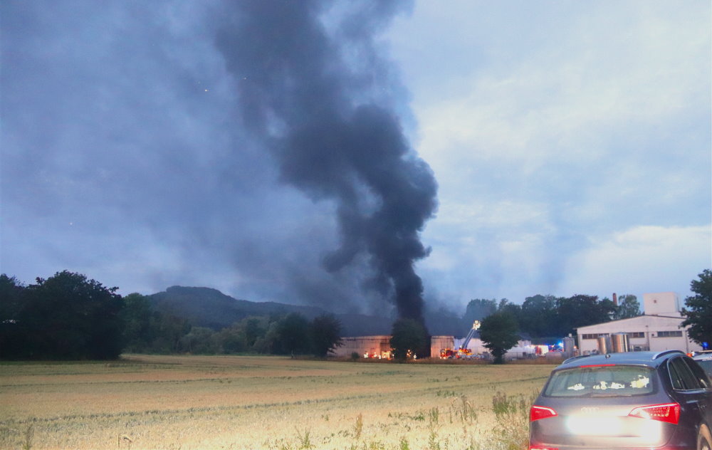 Beim Eintreffen der Rettungskräfte stand eine dichte schwarze Rauchwolke über der Halle. Die Feuerwehr der Stadt Warburg, die durch Kräfte aus Willebadessen, Diemelstadt und Marsberg unterstützt wurde, brachte das entstandene Feuer nach rund zwei Stunden unter Kontrolle. Es wurden ein Messwagen der Feuerwehr Beverungen sowie die Untere Wasserbehörde und das Landesamt für Naturschutz, Umwelt und Verbraucherschutz NRW (LANUV) hinzugezogen, um die Gefahr von Umweltschäden zu klären. Ebenso nahm die Kriminalpolizei noch am Samstag die Ermittlungen auf. Von den elf Fahrzeugen brannten sieben komplett aus, die anderen vier wurden beschädigt. Ebenso wurden neben der Halle selbst ein Hallenkran und weitere hochwertige Maschinen beschädigt, so dass der Sachschaden nach ersten Schätzung bei mindestens 500.000 Euro liegen dürfte. /Te.