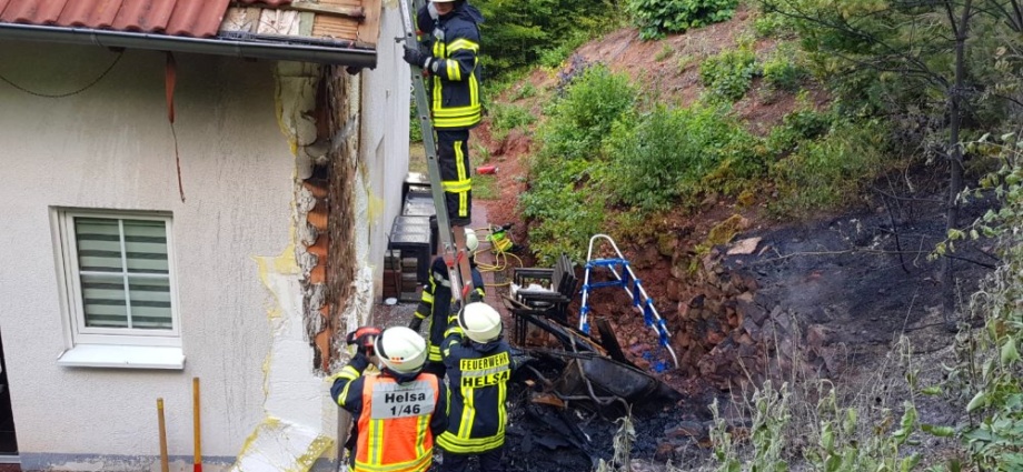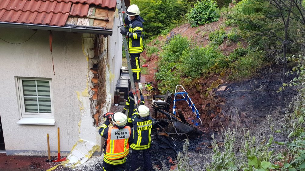 Helsa – Zu einem Brand kam es am Dienstagmorgen in Helsa in der Straße „Rue de Trébes“. Nachbarn haben den Hauseigentürmer gegen 07.50 Uhr auf den Brand aufmerksam gemacht und alarmierten die Feuerwehr. Bereits auf der Anfahrt konnten die Einsatzkräfte eine starke Rauchentwicklung erkennen. An der Einsatzstelle angekommen, stand ein Geräteschuppen im Vollbrand. Dieser kippte gegen die Hauswand und endzündete die Außenfassade.