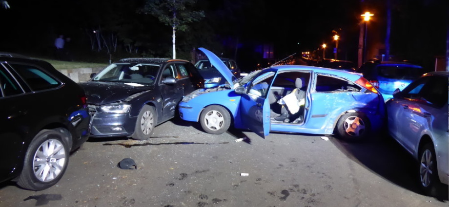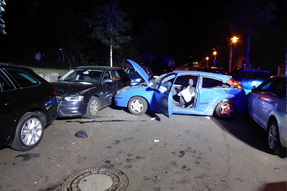 Um kurz nach 23 Uhr gingen mehrere Notrufe bei der Leitstelle der Feuerwehr Kassel ein, die einen Verkehrsunfall zwischen zwei Fahrzeugen mit mehreren Verletzten meldeten. Daraufhin wurde der Rüstzug der Feuerwache 1, sowie mehrere Rettungswagen und ein Notarzt zur Einsatzstelle entsandt. An der Einsatzstelle wurden dann insgesamt sechs verletzte Personen angetroffen, wovon sich noch zwei in einem PKW befanden. Neben dem 22-jährigen Fahrer wurden auch seine vier Mitfahrer, im Alter von 19 bis 21 Jahren, leicht verletzt. Umgehend wurden durch die Feuerwehr weitere Rettungsmittel zur Versorgung der Patienten zur Einsatzstelle nachgefordert. Die beiden Personen im PKW wurden unter anderem mittels hydraulischem Rettungsgerät durch die Feuerwehr befreit und anschließend an den Rettungsdienst übergeben. Die Verletzten wurden umgehend zur weiteren Behandlung in Kasseler Krankenhäuser eingeliefert. Keiner der Verletzten erlitt lebensbedrohliche Verletzungen. Durch den Aufprall wurde das Fahrzeug des 22-jährigen herumgeschleudert und beschädigte dabei drei weitere, geparkte Fahrzeuge. Die Parkstraße und die Annastraße waren in folge der Rettungsarbeiten im Bereich der Einsatzstelle voll gesperrt. Der Sachschaden wird auf 41.500 Euro geschätzt.