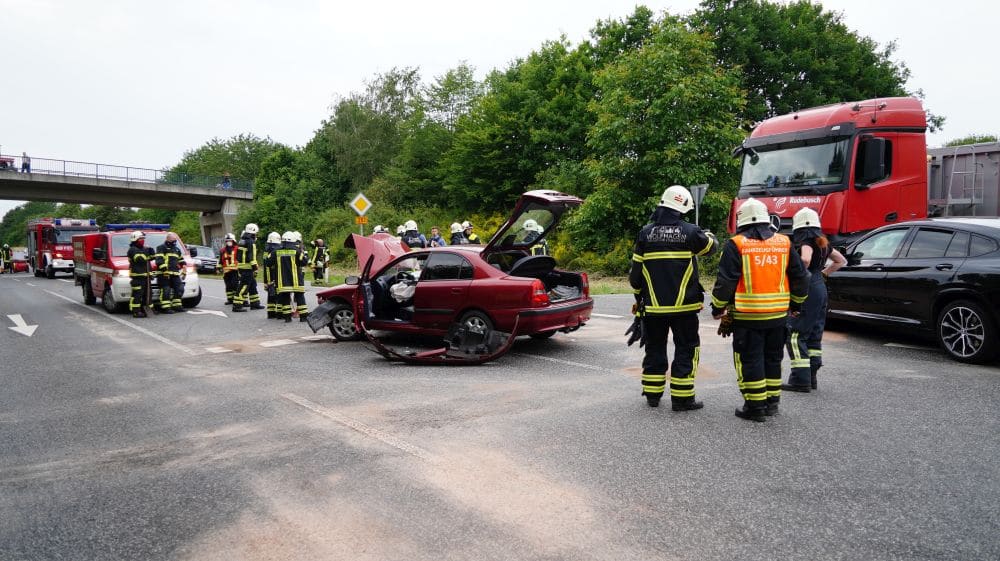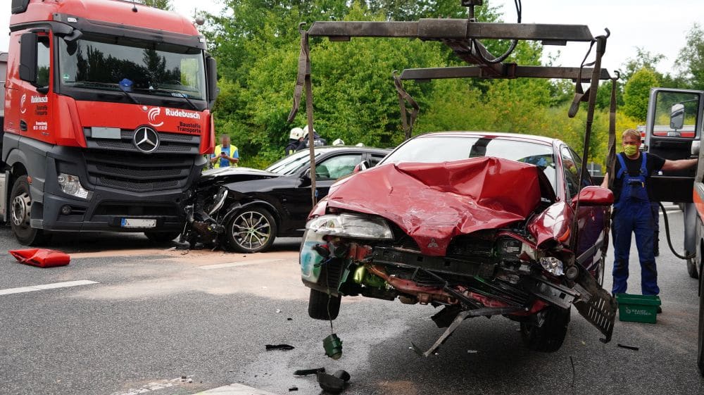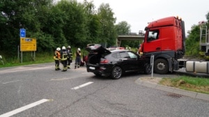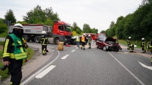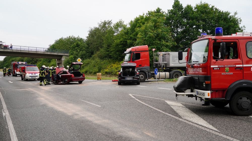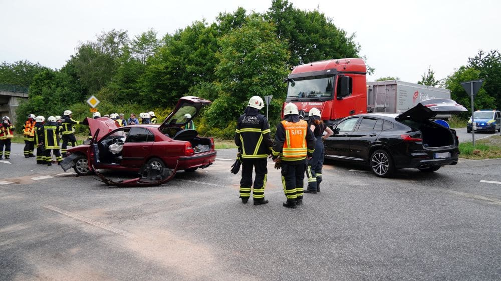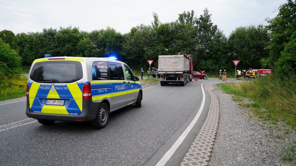 Wolfhagen – Ein schwerer Unfall ereignete sich am Dienstagnachmittag gegen 16.45 Uhr auf der B251 direkt an der Abfahrt Istha. Nach ersten Informationen der Polizei befuhr ein roter PKW von Wolfhagen kommend die Bundesstraße in Richtung Oelshausen. Der Fahrer wollte dann in Richtung Istha abbiegen und übersah einen entgegenkommenden BMW, es kam zum Zusammenstoß. Durch die Wucht des Aufpralls wurde der BMW dann noch gegen einen an der Kreuzung stehenden LKW geschleudert.