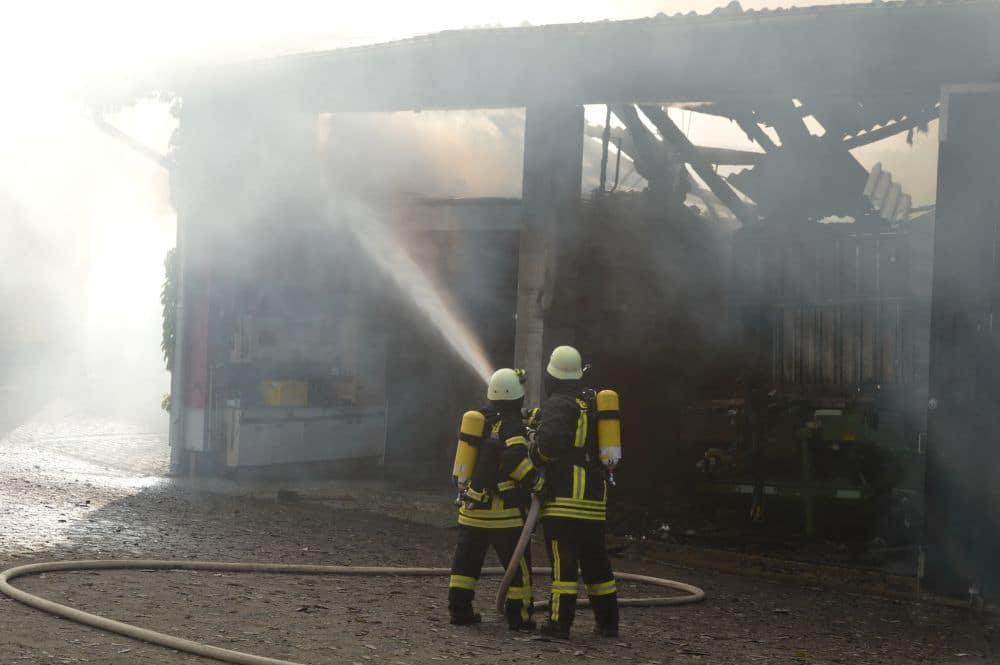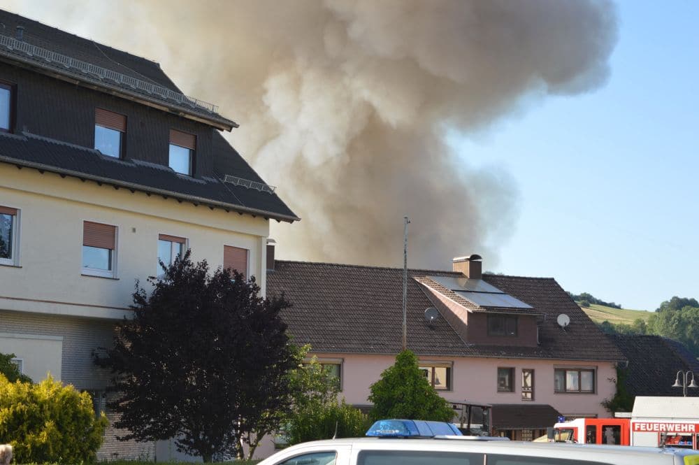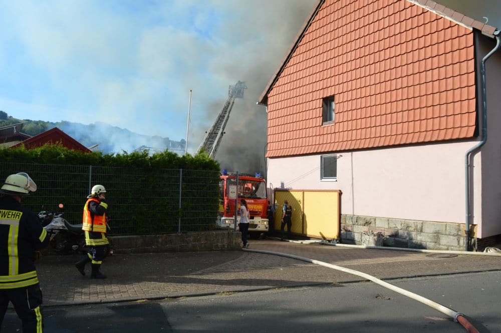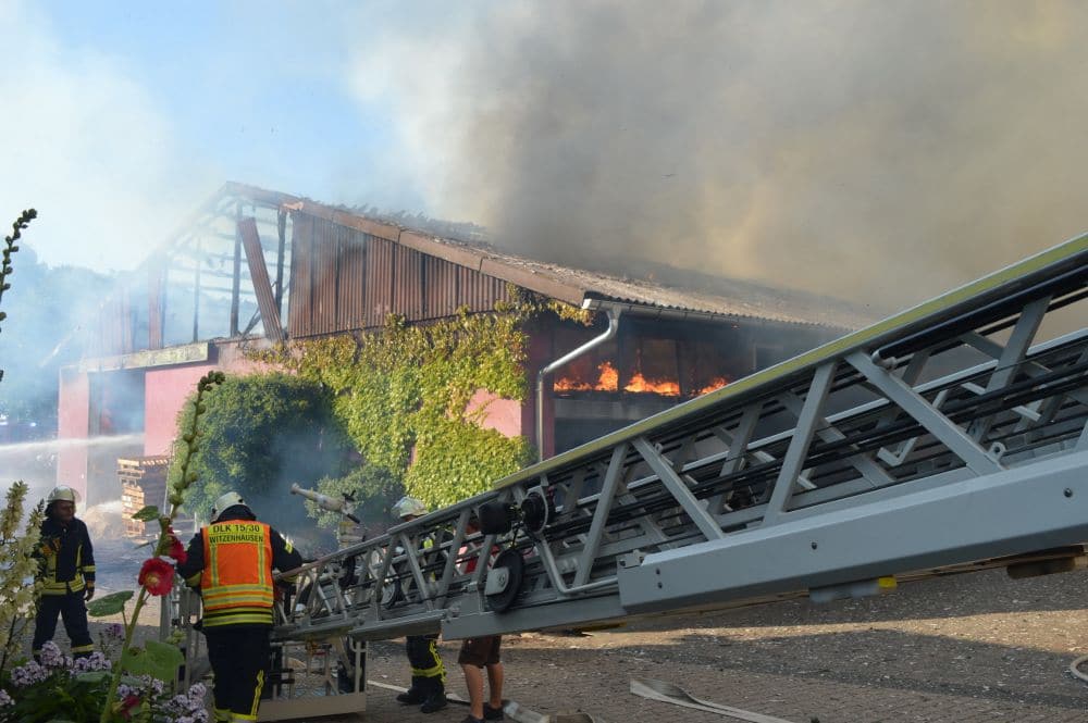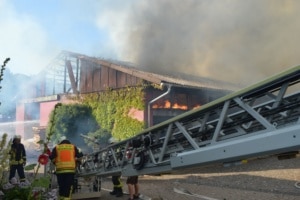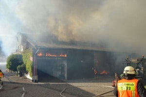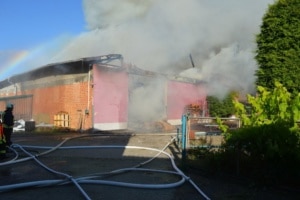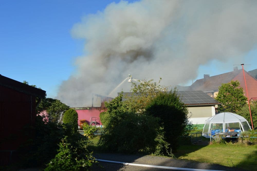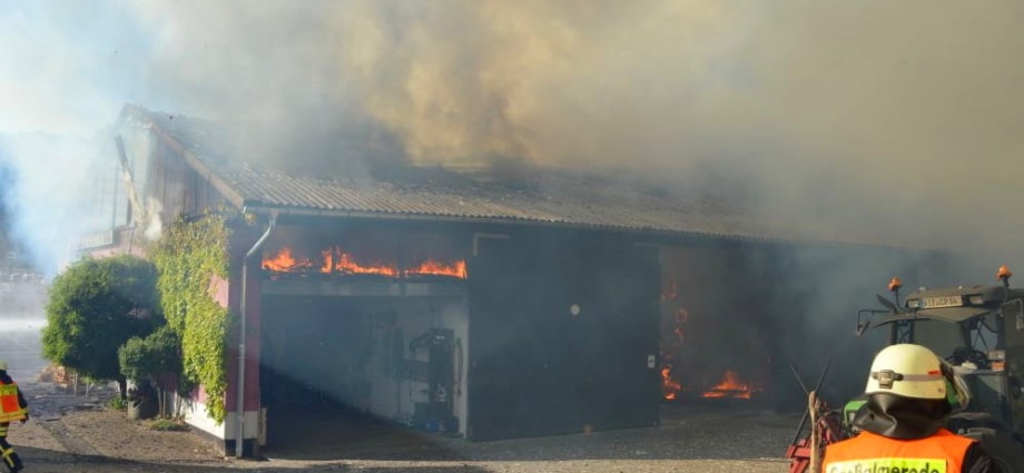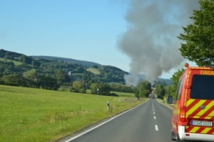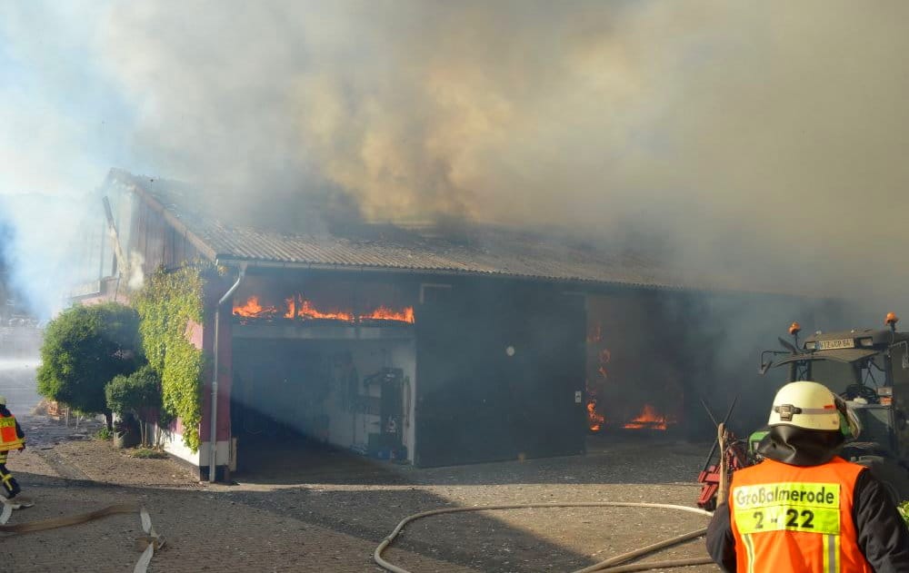 Großalmerode – In Laudenbach ist es am Donnerstag gegen 18.15 Uhr zum Brand eines landwirtschaftlichen Anwesens gekommen, in der Ortsmitte stand eine Scheune mit Fahrzeughalle im Vollbrand. Feuerwehren, Rettungsdienst und Polizei waren mit einem Großaufgebot im Einsatz. Maschinen und die Heuernte sind ein Raub der Flammen geworden. Der Einsatz läuft zurzeit noch, bis auf zwei leicht verletzte Einsatzkräfte ist bisher niemand verletzt worden, die Ortsdurchfahrt Laudenbach ist voll gesperrt, Anwohner wurden über Radiodurchsagen aufgefordert Fenster und Türen geschlossen zu halten.