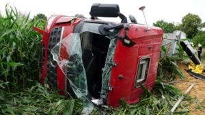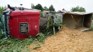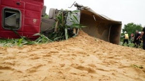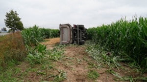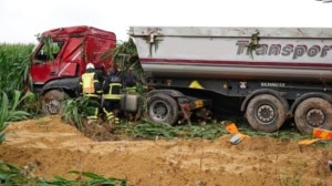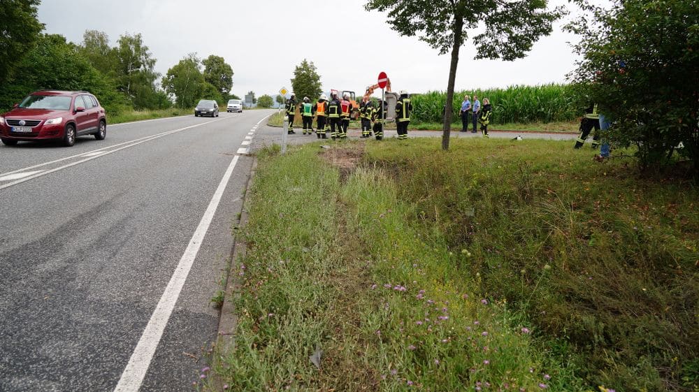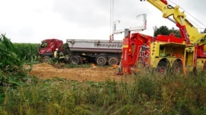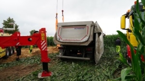 Wolfhagen – Am Montag gegen 12:45 Uhr kam es auf der B 251 zwischen Oelshausen und Istha zu einem schweren LKW Unfall. Der 59-Jährige Fahrer eines mit rund 27 Tonnen Sand beladenen LKW befuhr die Bundesstraße von Wolfhagen kommend in Fahrtrichtung A44. In Höhe eines Parkplatzes kam der Fahrer nach rechts von der Fahrbahn ab, überfuhr einen Leitpfosten, durchfuhr einen Entwässerungsgraben, touchierte ein Verkehrsschild und kippte schließlich im angrenzenden Maisfeld um.