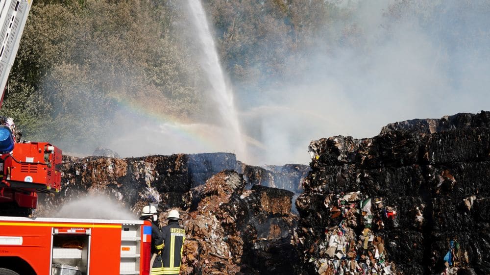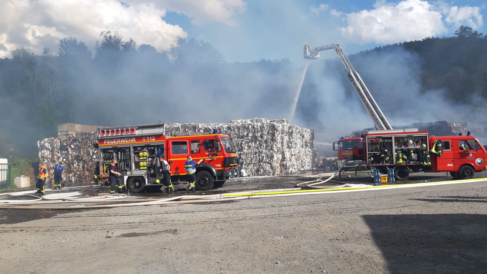 Auf Grund der aktuellen Außentemperaturen breitete sich das Feuer rasend schnell auf weitere gepresste Papierballen aus. Nach Angaben der Feuerwehr hat ein Ballen etwa ein Gewicht von rund 500 kg. Das Problem ist, dass das Feuer in den Ballen vordringt. Aus diesem Grund müssen nun die Ballen alle auseinandergerissen werden, um an die Brandnester heran zu kommen. Bis die Feuerwehr die enorme Wasserversorgung aus einem nahegelegenen Bach aufbauen konnte, musste kurzzeitig auf das Trinkwassernetzt zurückgegriffen werden. Nach Angaben von Einsatzleiter Claus Demandt können sich die aufwendigen Löscharbeiten noch bis zum Sonntag hinziehen. Mit Baggern des Papier Recycling Unternehmens und des THW wurden die Papierballen auseinandergerissen. Was den Brand ausgelöst hat, ist aktuell noch unklar. Insgesamt sind rund 180 Einsatzkräfte der Feuerwehr Witzenhausen, dem gesamten Landkreis, THW und DRK im Einsatz. Anwohner wurden gebeten auf Grund der enormen Rauchentwicklung Türen und Fenster geschlossen zu halten.