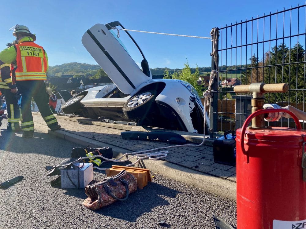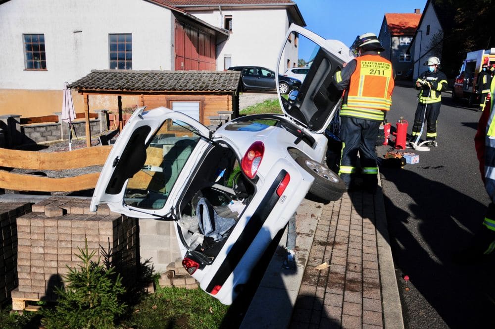 Einsatzkräfte der Feuerwehr Frielendorf und Leimsfeld, welche sich auf einer Nachtübung in der Nähe befanden, eilten zur Hilfe. Sie sicherten das Fahrzeug, halfen der Fahrzeugführerin aus ihrer misslichen Lage und übergaben sie an den Rettungsdienst. Mit leichten Verletzungen wurde die Frau nach ihrer Erstversorgung in ein nahegelegenes Krankenhaus gebracht. Am Fahrzeug und am Gartenzaun entstand nach ersten Schätzungen ein Sachschaden in Höhe von 5000 Euro. Im Einsatz waren, neben der Polizei und dem Rettungsdienst, 56 Einsatzkräfte der Feuerwehren Frielendorf, Leimsfeld, Großropperhausen und Obergrenzebach. Während der Rettungsmaßnahmen war die Knüllstraße in der Ortsdurchfahrt von Großropperhausen für rund eine Stunde voll gesperrt. (mpu)