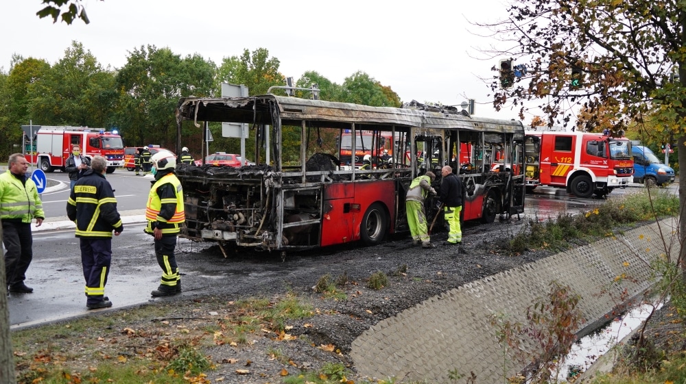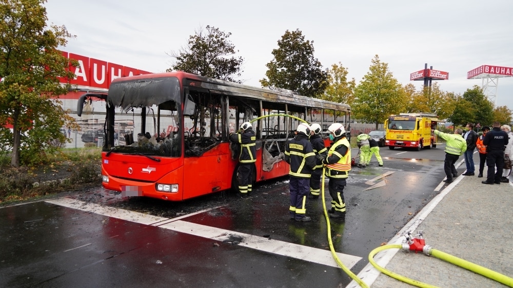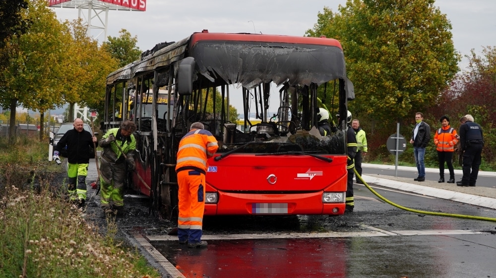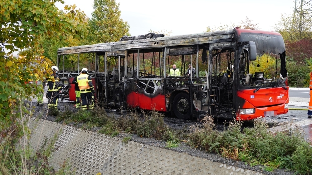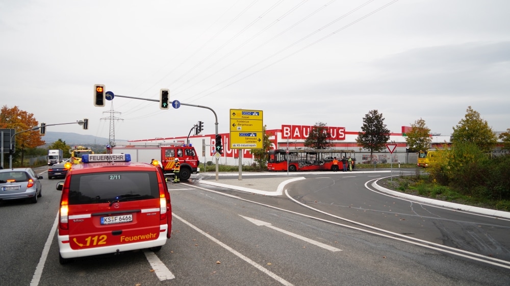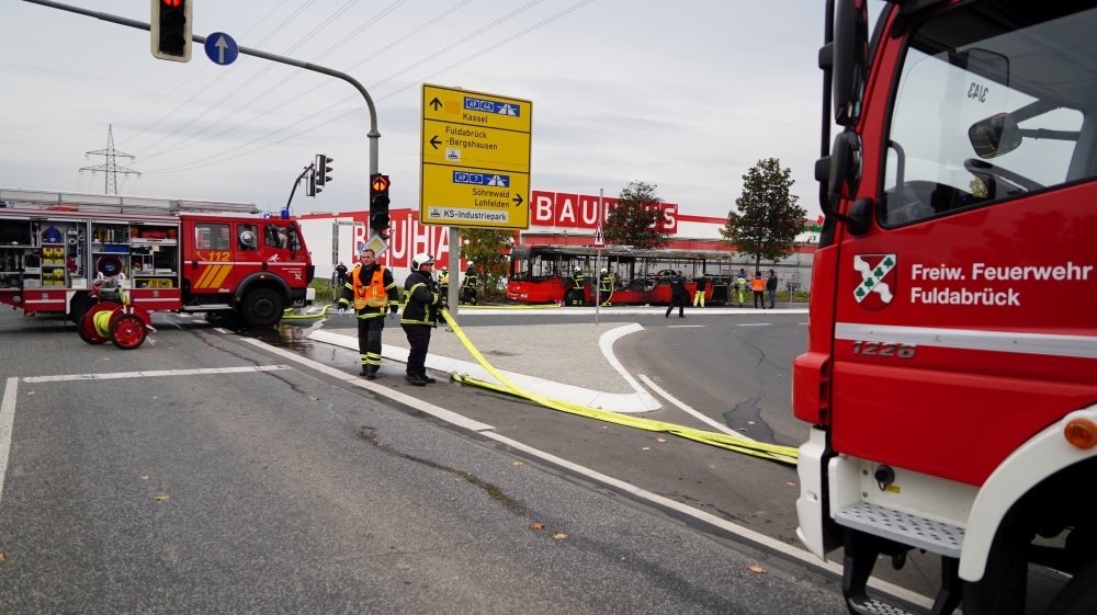 Fuldabrück: Wie die bei dem Brand des Busses im Bereich der Kreuzung Marie-Curie-Straße / Flughafenstraße eingesetzten Beamten des Polizeireviers Ost berichten, handelt es sich um einen Linienbus. Nach den ersten Erkenntnissen war das Feuer am 20. Oktober gegen 14:50 Uhr während der Fahrt im Bereich des Motorraums ausgebrochen, was auf einen technischen Defekt hindeutet.