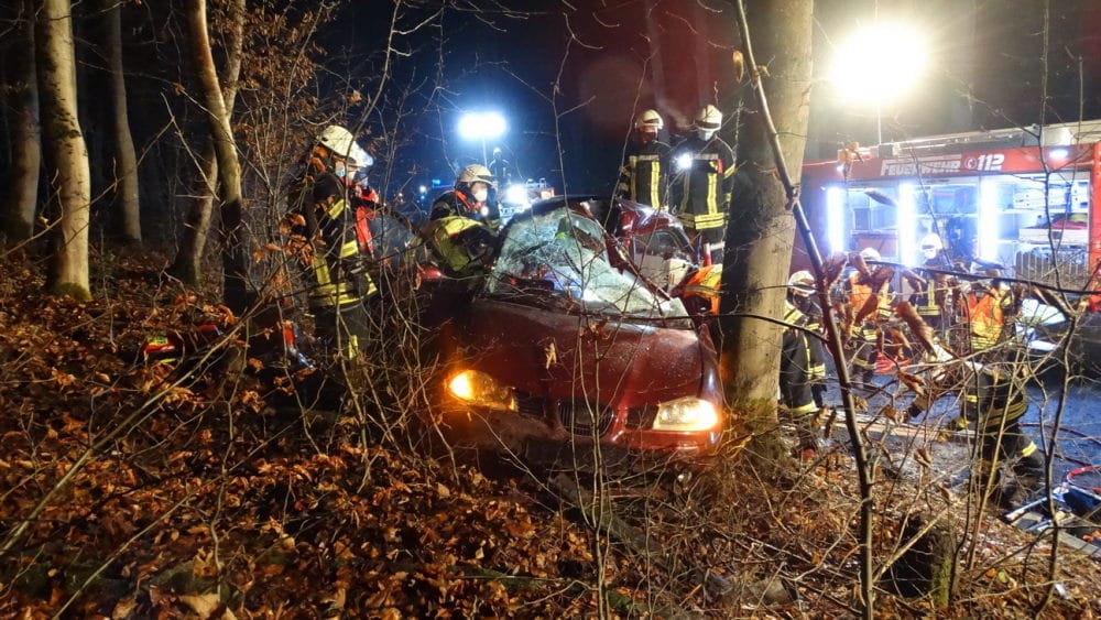 Im weiteren Verlauf verlor er die Kontrolle über den Pkw, fuhr eine Böschung hoch und kollidierte mit dem Stumpf eines Baumes, wodurch der Wagen auf der Fahrerseite im Bodenbereich stark eingedrückt wurde. Schließlich kollidierte der Pkw mit einem Baum und blieb liegen. Der Fahrer wurde eingeklemmt und musste von der Feuerwehr gerettet werden. Er wurde mit lebensgefährlichen Verletzungen in ein Krankenhaus eingeliefert. Der 14-jährige Beifahrer hatte sich im Schockzustand von der Unfallstelle in zunächst unbekannte Richtung entfernt, konnte aber durch die Einsatzkräfte kurze Zeit später bei Quentel glücklicherweise gefunden und zurück zur Unfallstelle gebracht werden. Drei Mädchen im Alter von 12, 14 und 15 Jahren konnten nach dem Unfall selbstständig aussteigen. Die vier Mitfahrer wurden schwer verletzt und wurden nach der Erstversorgung in ein Krankenhaus eingeliefert. Die Landstraße musste bis 19.30 Uhr voll gesperrt. Die Polizei hat ihre Ermittlungen aufgenommen.