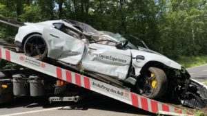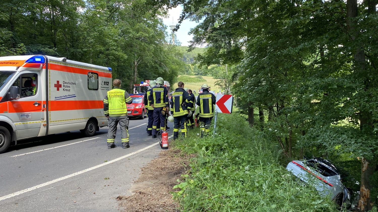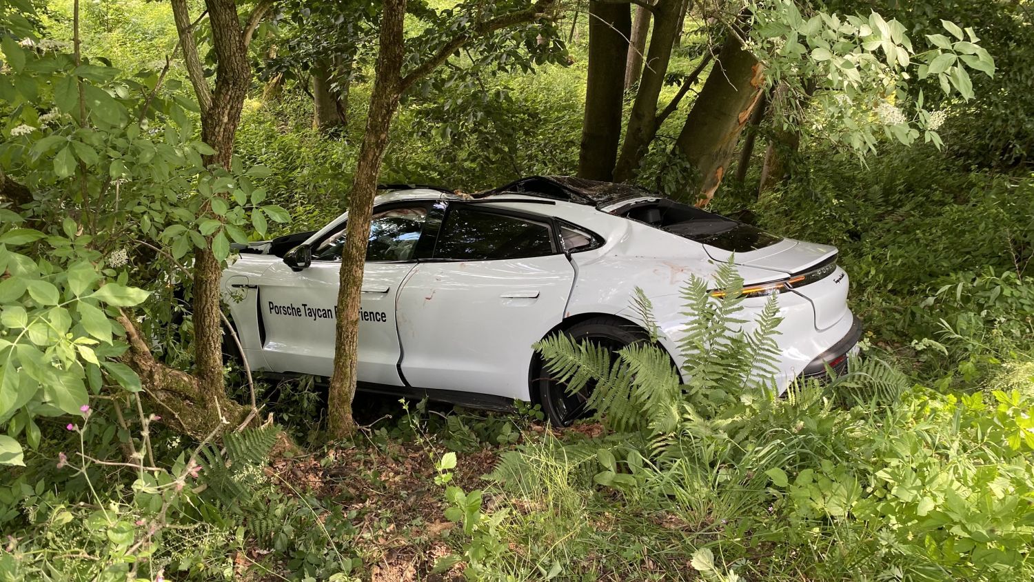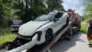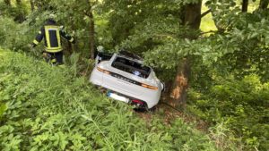 Kirchheim – Zu einem schweren Verkehrsunfall wurde die Feuerwehr aus gegen 13.25 Uhr zwischen Kirchheim-Willingshain und Neuenstein-Raboldshausen alarmiert. Beim Eintreffen an der Unfallstelle fanden die Einsatzkräfte zwei schwerverletzte Personen vor, die von Ersthelfern auf der Straße betreut wurden. Wie von der Polizei später ermittelt wurde, waren die Insassen eines vollelektrischen Porsche Taycan Turbo-S (761 PS) auf einer Probefahrt in Richtung Willingshain unterwegs. Nach Angaben des Fahrers kam ihnen in einer Linkskurve ein Motorradfahrer zu weit auf ihrer Fahrspur entgegen. Der Fahrer des Porsche versuchte nach rechts auszuweichen und kam dabei auf die Bankette. Im weiteren Verlauf flog der Porsche von der Straße einen Abhang hinunter und prallte frontal und mit dem Dach gegen einen Baum. Bei dem Unfall wurden Fahrer und Beifahrer schwer verletzt. Beide krochen ca. 20 Meter den Abhang bis hoch zur Straße, wo sie von zwei Motorradfahrern entdeckt wurden. Die Ersthelfer alarmierten die Rettungskräfte und betreuten die Insassen. Beide Fahrzeuginsassen mussten mit dem Rettungswagen und Notarztbegleitung in ein Krankenhaus gefahren werden.