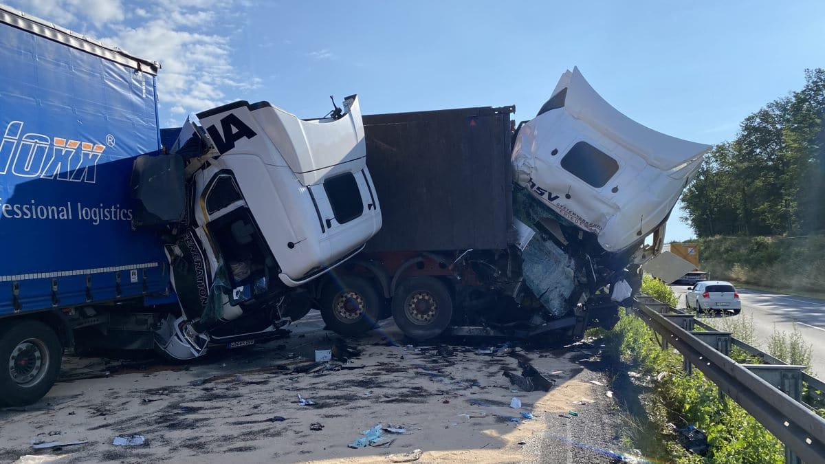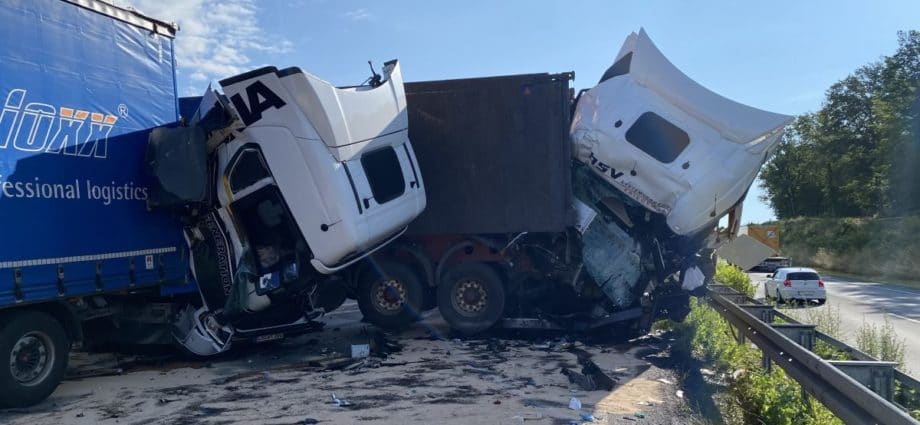 Bad Hersfeld – Zu einem sehr schweren Auffahrunfall mit vier beteiligten LKWs und zwei eingeklemmten Fahrern kam es am Dienstagmorgen gegen 6.20 Uhr auf der A4 zwischen Friedewald und Bad Hersfeld in Höhe der Wippershainer Brücke in Fahrtrichtung Kirchheimer Dreieck. Nach ersten Erkenntnissen befand sich auf dem rechten Fahrstreifen der zweispurigen Autobahn ohne Standstreifen seit den Morgenstunden ein Sattelzug mit einer Panne. Da der Verkehr einspurig über den linken Fahrstreifen an dem Pannenfahrzeug vorbeifuhr, bildete sich ein Rückstau. Nach bisher unbestätigten Informationen übersah der Fahrer eines Sattelzuges das Stauende kurz hinter dem Pannenfahrzeug und krachte in einen Sattelzug mit Mulde. Im weiteren Verlauf wurde der Muldensattelzug durch die Wucht des Aufpralls in einen weiteren Sattelzug geschoben, der final auch noch in einen vor ihm stehenden Sattelzug krachte. Bei dem Unfall wurden der Fahrer des Auffahrenden Sattelzuges und der Fahrer des Muldensattelzuges in ihren Fahrerhäusern eingeklemmt.