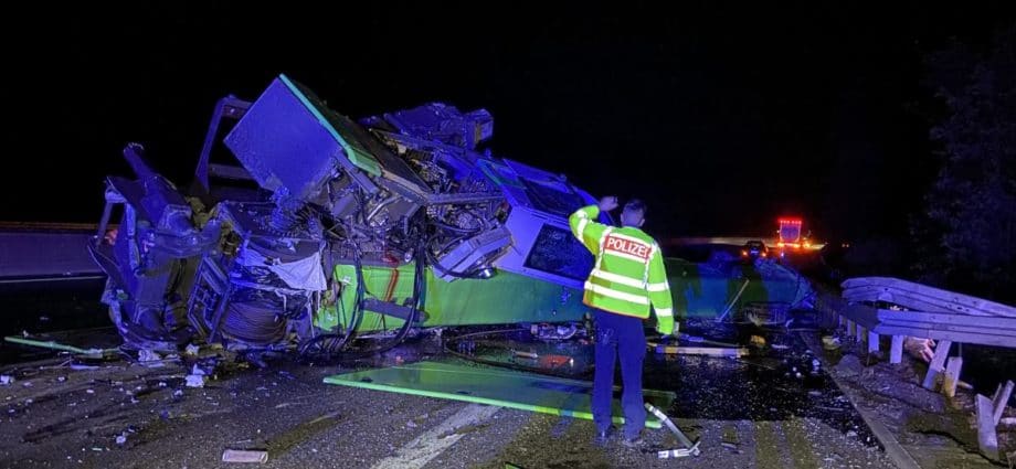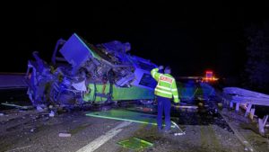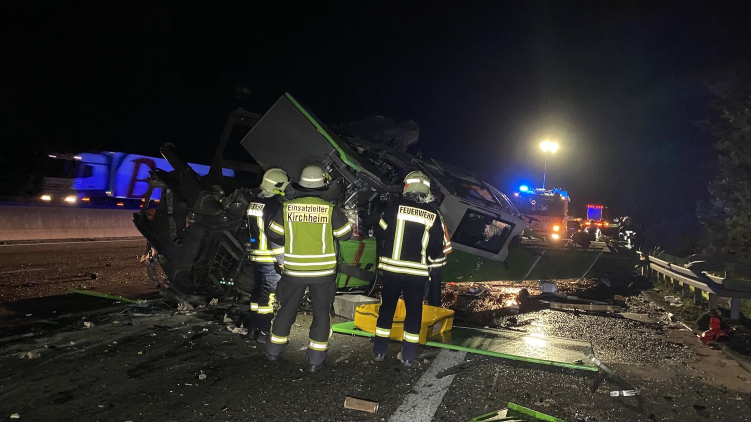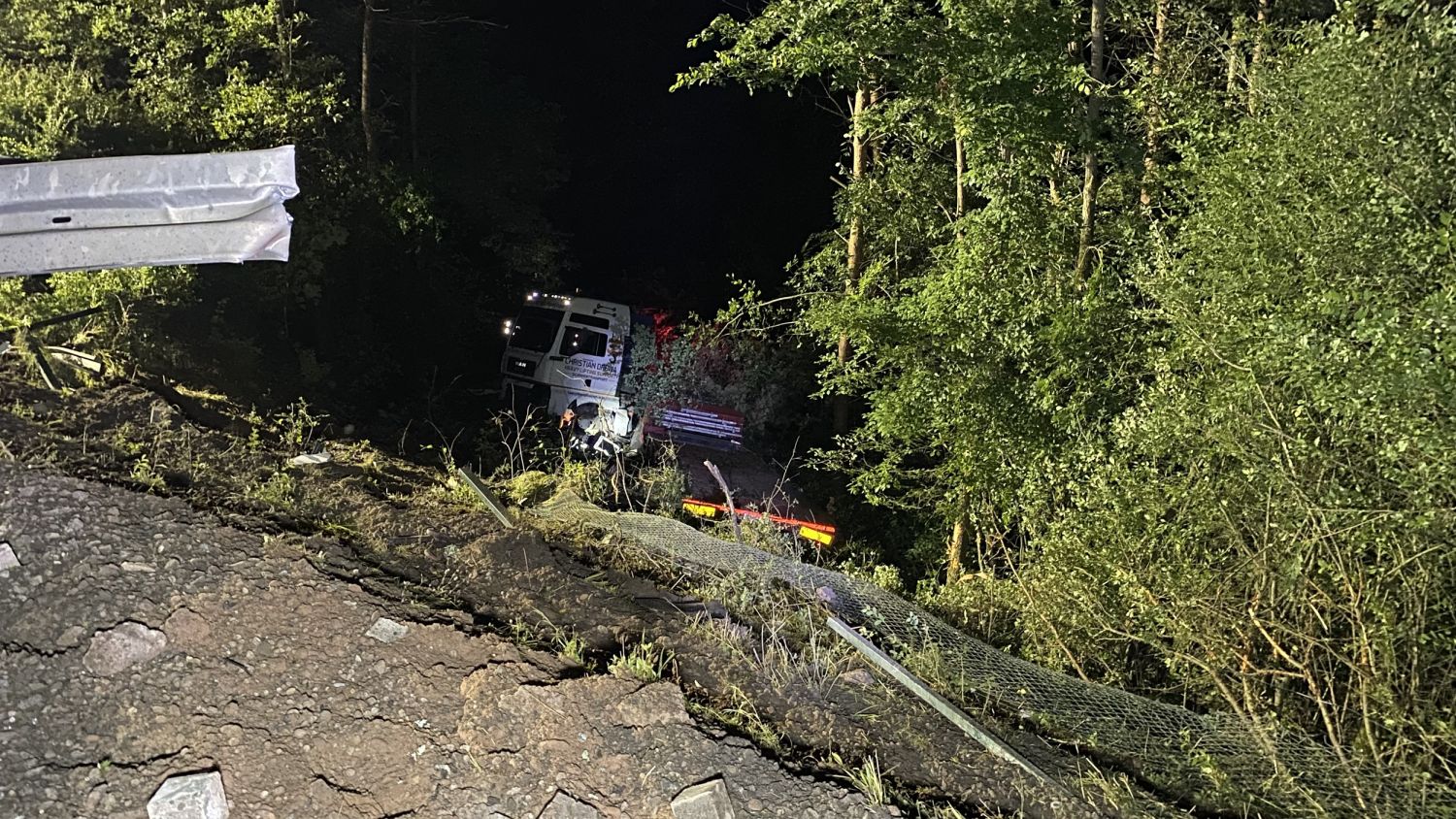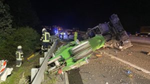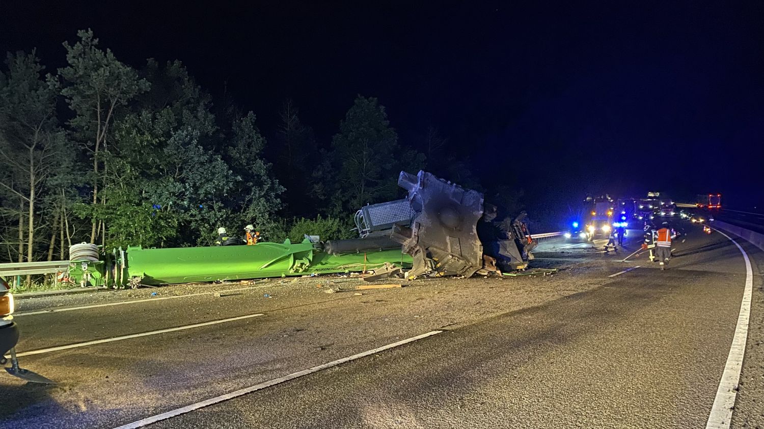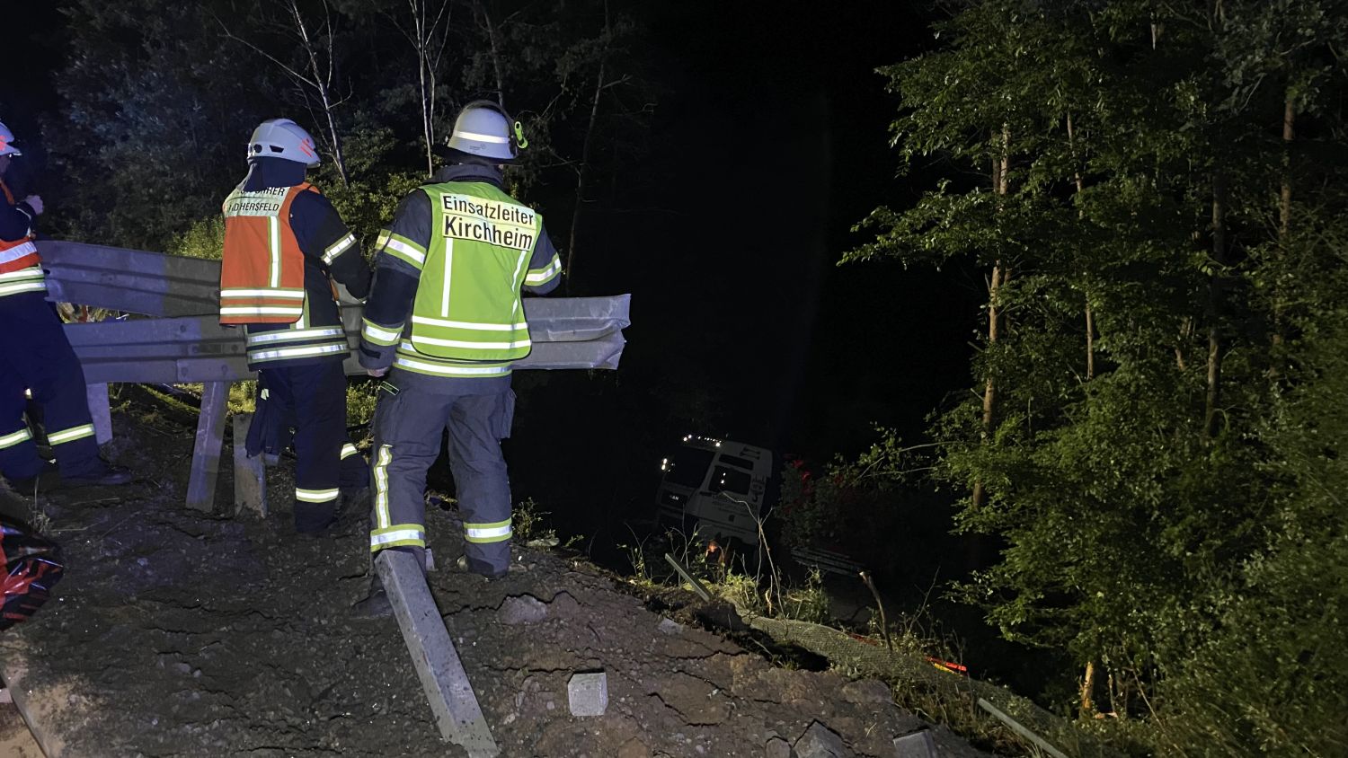 Kirchheim – Es grenzt schon fast an ein Wunder, dass die Fahrerin eines in Richtung Norden fahrenden Schwertransporters am Donnerstagabend gegen 23 Uhr verletzt, aber aus eigener Kraft aus dem Fahrerhaus krabbeln konnte und dort von zwei Ersthelfern in Empfang genommen und die Böschung hinauf zur Autobahn gebracht wurde, wo sie dem Rettungsdienst übergeben wurde. Ein Rettungswagen brachte die Fahrerin dann in ein Krankenhaus nach Bad Hersfeld. Über die Unfallursache ist noch nicht sehr viel bekannt. Der Schwertransporter kam aus bisher ungeklärter Ursache nach rechts von der Fahrbahn ab und verlor dabei die Ladung, einen großen, 45 Tonnen schweren Kran von der Ladefläche. Der Kran rutschte noch einige Meter über die Fahrbahn, wobei er eine ca. 1,5 Meter lange, 40 cm breite und 30cm tiefe Furche in die Betondecke riss, bevor er auf der linken Seite zum Liegen kam. Die Zugmaschine mit dem Tieflader walzte ca. 100 Meter Schutzplanke am rechten Fahrbahnrand nieder und stürzte etwa 30 Meter einen Abhang hinunter.