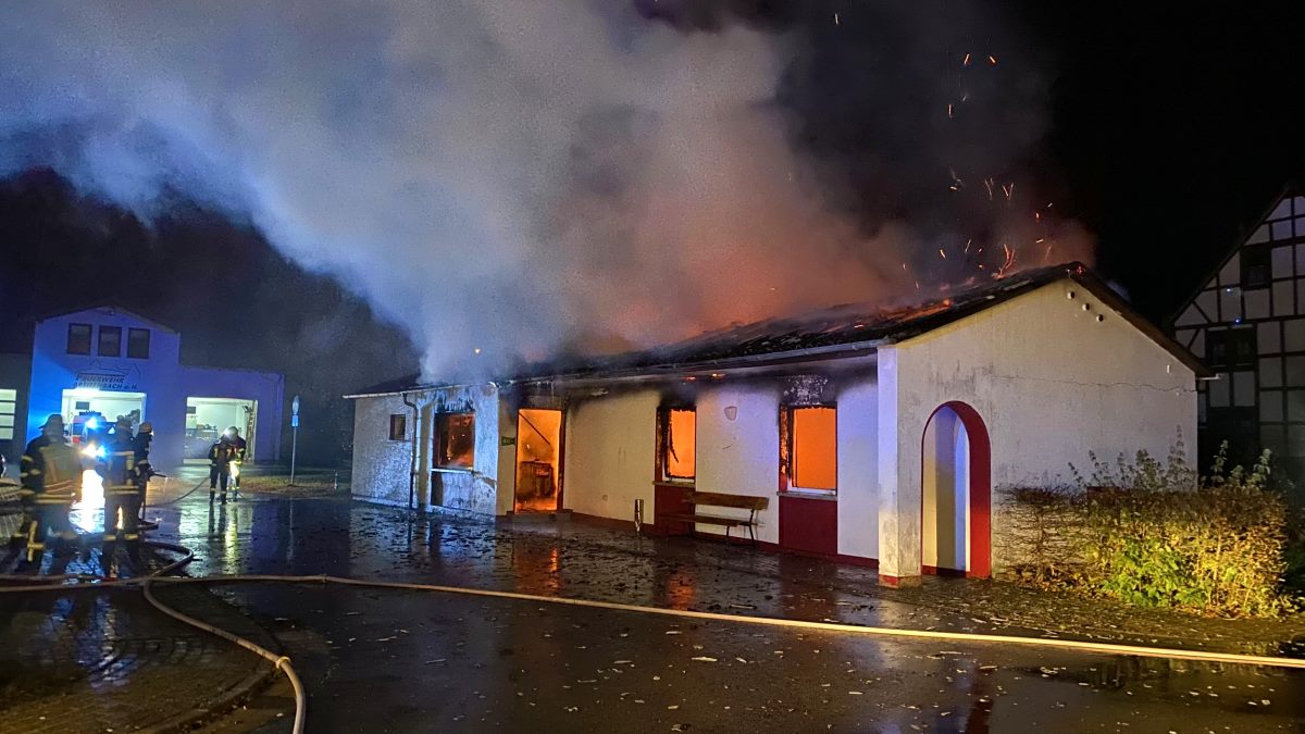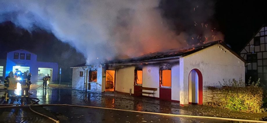 Hersfeld-Rotenburg – Am Dienstagabend wurden die Feuerwehren aus Breitenbach a.Herzberg und Ortsteilen gegen 22.45 Uhr zu einem Dachstuhlbrand in der Mittelstraße alarmiert. Bereits beim Eintreffen am Gerätehaus der Feuerwehr konnten sich die Feuerwehrleute ein Bild von Feuer machen, da sich das Gebäude direkt neben dem Gerätehaus befand. Mit ca. 50 Einsatzkräften löschten die Feuerwehrleute von mehreren Seiten das im Vollbrand stehende Gebäude. Dabei handelt es sich um ein Vereinshaus, das von einem Wanderverein benutzt wurde. Wie die Polizei an der Einsatzstelle mitteilte, soll das Feuer vermutlich nach einer Verpuffung entstanden sein. Zum Zeitpunkt der Verpuffung befanden sich ein 57-Jähriger sowie ein 44-jähriger Mann in dem Gebäude, von denen der 44-jähriger Brandverletzungen erlitt und mit dem Rettungswagen in ein Krankenhaus gefahren werden musste. Nach bisher unbestätigten Informationen soll es beim Ausschalten eines mit Gas betriebenen Ofens zu der Verpuffung gekommen sein. Nach Beendigung der Löscharbeiten holten die Einsatzkräfte der Feuerwehr acht zum Teil noch volle Gasflaschen aus dem Gebäude und kühlten sie in einem neben der Einsatzstelle befindlichen Bachlauf. Auch der Bürgermeister der Gemeinde Breitenbach, Volker Jaritz machte sich vor Ort ein Bild vom Ausmaß des Feuers und den Zerstörungen. Der Bürgermeister äußerte sich besorgt, da durch die ohnehin schwere Coronazeit gerade die Vereine sehr gelitten haben und nun ein Verein auch noch sein Vereinshaus verloren hat. Da es durch die Verpuffung auch zu Schäden an festen Gebäudeteilen gekommen ist, schätzt die Polizei den Sachschaden im sechsstelligen Bereich. Noch in der Nacht waren die Brandermittler der Kripo an der Einsatzstelle um die Ermittlungen aufzunehmen. Von Schaulustigen, die zur Einsatzstelle gekommen waren konnten man vernehmen, dass die Verpuffung fast im gesamten Ort zu hören war.