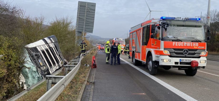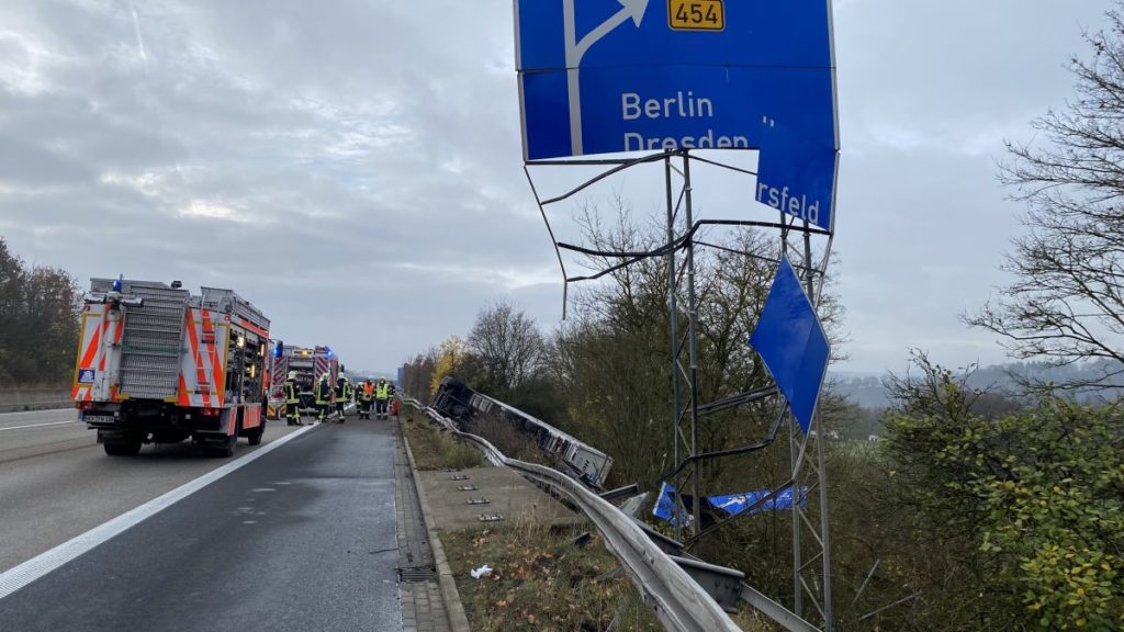 Bad Hersfeld – Wie es genau zu dem Unfall gegen 9 Uhr auf der A7 etwa einen Kilometer vor dem Kirchheimer Dreieck kam, muss noch ermittelt werden. Bekannt ist nur, dass der Fahrer eines unbeladenen Lastzuges mit seinem Gespann nach rechts von der Fahrbahn abkam, eine große Schilderbrücke umfuhr, dann einen Abhang hinunter schleuderte und auf die Beifahrerseite kippte. Ersthelfer waren sehr schnell zur Stelle und konnten dem verletzten Fahrer dabei helfen, das Fahrerhaus zu verlassen. Beim Eintreffen von Feuerwehr aus Kirchheim saß der Fahrer auf einer Schutzplanke und konnte dem Rettungsdienst übergeben werden, der den Verletzten in ein Krankenhaus nach Bad Hersfeld brachte. Von der Feuerwehr wurden auslaufende Betriebsstoffe aufgefangen und die Fahrbahn von Trümmerteilen und Erde befreit. Während der ersten Rettungsarbeiten musste der rechte von drei Fahrstreifen gesperrt werden. Es kam zu keinen nennenswerten Behinderungen. Da die Reste der großen Schilderbrücke umzukippen drohten, musste der Bereich abgesperrt werden. Für den Vormittag ist die Bergung des Lastzuges geplant. Hierfür wird vermutlich ein weiterer Fahrstreifen gesperrt werden müssen. Über die Höhe des Sachschadens konnten noch keine Angaben gemacht werden.