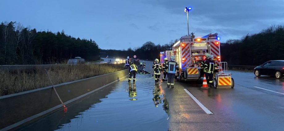Kirchheim – Zu einem nicht ganz alltäglichen Einsatz rückte die Feuerwehr aus Kirchheim am Sonntagabend gegen 17 Uhr aus. Auf der A5 zwischen Kirchheim und Alsfeld kurz vor der Rastanlage Rimberg kam es aufgrund von Tief Roxana verursachten heftigen Regenfällen zu einer Überschwemmten Fahrbahn in Richtung Süden. Verstopfte Auffangkörbe in den Gullys waren auf einer Länge von ca. 200 Metern der Grund dafür, dass der linke Fahrstreifen teilweise bis zu 25 Zentimeter unter Wasser stand. Die Feuerwehrleute öffneten die Gullys, reinigten die Auffangkörbe und pumpten mit Tauchpumpen das Wasser ab. Während des Einsatzes der 15 Feuerwehrleute mussten der linke und der mittlere Fahrstreifen gesperrt werden. Der Verkehr staute sich aufgrund des starken Pendlerverkehrs mehrere Kilometer zurück.
