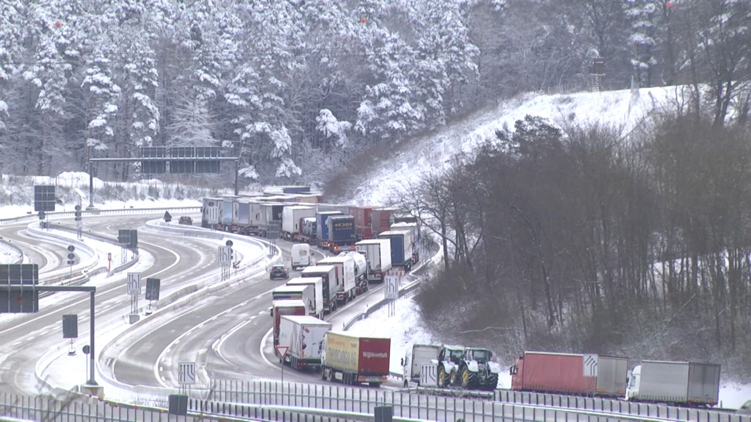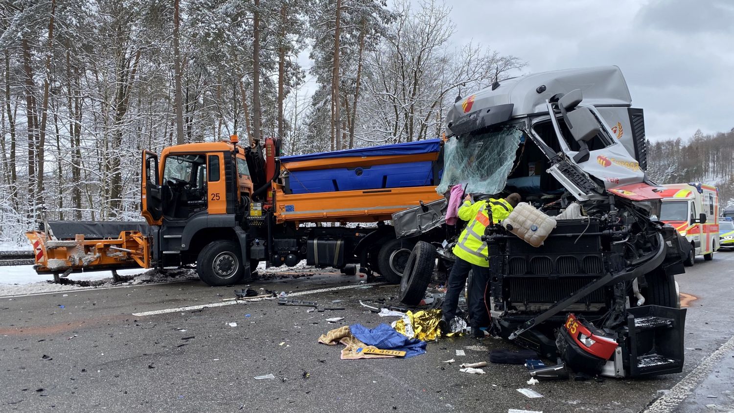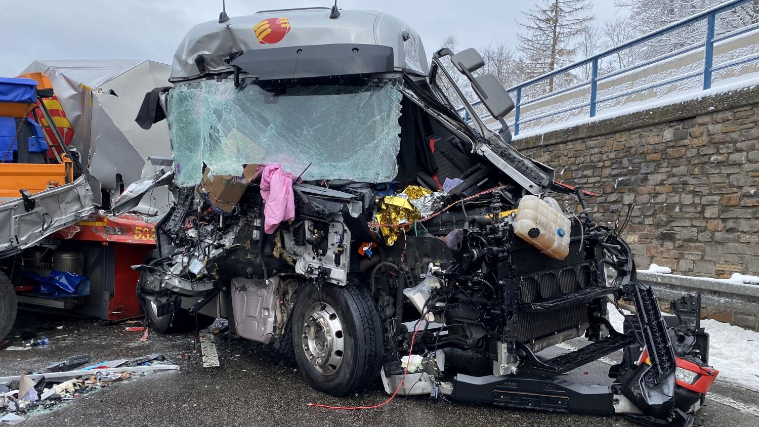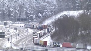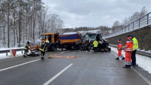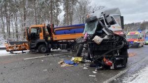 Kirchheim – Am Samstagmorgen bildete sich aufgrund starken und langanhaltenden Schneefalls ein Kilometerlanger Stau auf der A4. Auf Steigungsstrecken kam der Schwerlastverkehr teilweise zum Erliegen. Aufgrund der schneeglatten Fahrbahn sind mehrere Sattelzüge liegen geblieben. Es bildete sich ein Kilometerlanger Stau auf der A4 zwischen Kirchheim und Bad Hersfeld. Gegen 9 Uhr ereignete sich auf der A5 zwischen Alsfeld Ost und Hattenbacher Dreieck in Fahrtrichtung Kirchheim ein schwerer Verkehrsunfall. Ein Winterdienst war gerade dabei die rechte Spur auf der A5 zu streuen als ein Sattelzug fast ungebremst auf das Streufahrzeug auffuhr. Bei dem Unfall wurde der Streuanhänger total zerstört. Die Zugmaschine des belgischen Sattelzuges knickte zur Seite und wurde völlig zerstört.