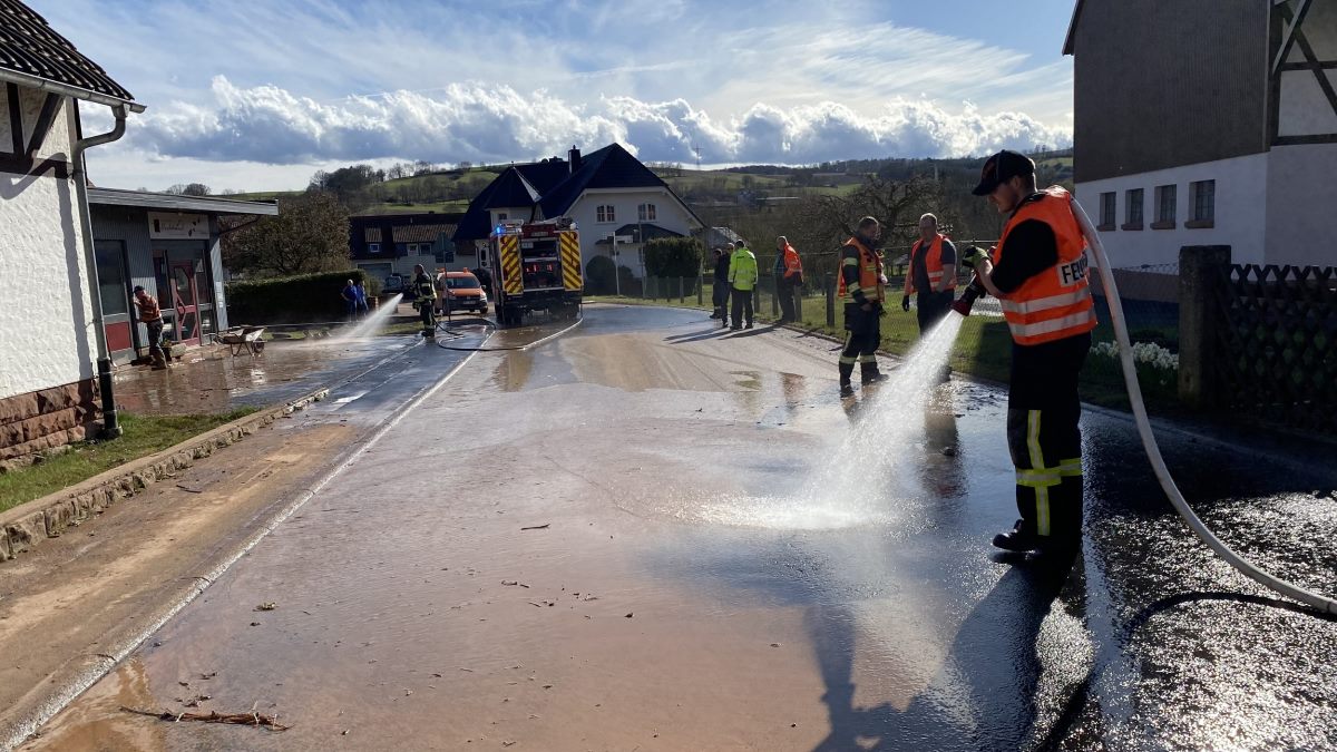 Hersfeld-Rotenburg – Am Donnerstagnachmittag zog seit 14.30 Uhr ein heftiges Unwetter mit viel Regen und Sturm über die Gemeinden Kirchheim und Niederaula. Innerhalb kürzester Zeit waren mehrere Straßen durch Schlamm- und Wassermassen überschwemmt. Die Feuerwehren aus Kirchheim und Niederaula mussten Gullys, die durch Laub verstopft waren reinigen und so für einen schnelleren Ablauf der Wassermassen sorgen. Besonders betroffen waren davon in Kirchheim die Hauptstraße und in Niederaula die B454 und der Kreuzungsbereich Wehrsteg/B454/Lerchenweg. In der Marktgemeinde Niederaula musste die Feuerwehr im Wehrsteg die völlig verschlammte Straße noch reinigen, nachdem das Wasser abgelaufen war und auch ein Besenwagen der Gemeindeverwaltung kam zum Einsatz. Noch während der Reinigungsarbeiten flaute auch der Sturm völlig ab und die Sonne schien bei Windstille von einem strahlend blauen Himmel.