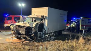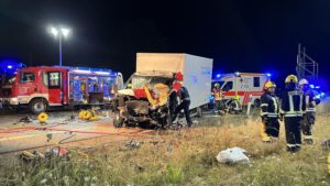 Niederaula – Am Dienstagabend kam es gegen 22.50 Uhr auf der B62 zwischen Niederaula und Niederjossa in Höhe der Auffahrt zur A7 zu einem schweren Verkehrsunfall mit einer schwerst eingeklemmten Person. Der Fahrer eines mit LKW-Ersatzteilen beladenen Sattelzuges befuhr die B62 von Niederaula in Richtung Niederjossa. Wie die Polizei an der Unfallstelle mitteilte kamen ihm in Höhe der Zufahrt zur A7 aus Richtung Niederjossa ein Kleintransporter entgegen, der auf den Zubringer zur A7 fahren wollte und dabei den Sattelzug vermutlich übersehen hatte. Es kam zu einem Frontalzusammenstoß. Durch den Zusammenstoß verlor der Fahrer des Sattelzuges die Kontrolle über sein Fahrzeug. Der Sattelzug schleuderte, kippte im weiteren Verlauf auf die Beifahrerseite und kam quer über alle Fahrstreifen liegend zum Stillstand. Der Fahrer des Kleintransporters wurde schwerst in seinem Fahrzeug eingeklemmt und musste von der Feuerwehr aus Niederaula mit schwerem Gerät aus dem Fahrzeugwrack befreit werden. Ein Rettungswagen brachte den Fahrer mit Notarztbegleitung in ein Krankenhaus. Der Fahrer des Sattelzuges wurde bei dem Unfall leicht verletzt. Wie der Einsatzleiter der Feuerwehr mitteilte, stand er beim Eintreffen der ersten Einsatzkräfte neben seinem umgekippten Fahrzeug. Die Bundesstraße musste während der Rettungs- und Bergungsarbeiten beidseitig voll gesperrt werden. Nach ersten Informationen von der Einsatzstelle wird die Bergung des über alle Fahrspuren liegenden Sattelzuges vermutlich bis in den frühen Morgen andauern, da erst die schwere Ladung abgeladen werden muss, bevor der Sattelzug aufgerichtet werden kann. Der Verkehr wird örtlich umgeleitet. Neben der Rettung des eingeklemmten Transporterfahrers streute die Feuerwehr aus Niederaula noch ausgelaufene Betriebsstoffe ab, beseitigte umherliegende Trümmerteile und leuchtete die Unfallstelle aus. Über die Höhe des Sachschadens konnten noch keine Angaben gemacht werden.