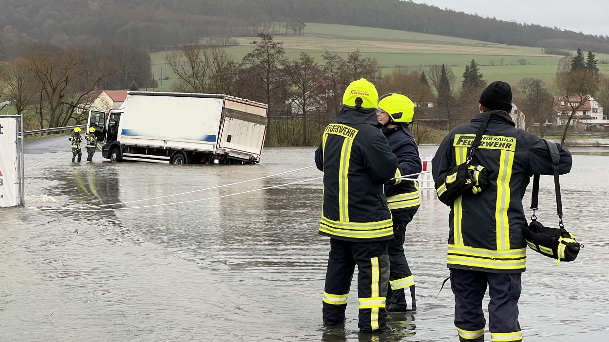 Niederaula – Am Freitagmittag wollte der Fahrer eines Lastwagens gegen 13.40 Uhr die Verbindungsstraße von Niederjossa in Richtung Solms befahren. Ob der Fahrer die wegen Hochwasser eingerichtete Sperrung der Straße übersehen hat, oder einfach nur dachte, dass er mit dem Laster problemlos durch die Fluten kommt, ist derzeit ungeklärt. Allem Anschein nach versuchte er aber noch, als er mit dem LKW bereits über einen halben Meter im Wasser stand, zu wenden. Eine Aktion, die sich als großer Fehler herausstellte. Auf der für den Laster viel zu schmalen Straße kam das Fahrzeug nun von der befestigten Straßendecke auf die durch die Überschwemmung völlig aufgeweichten Wiese und sackte weg. Unfähig auch nur noch einen Zentimeter fahren zu können, steckte der LKW nun fest und der Fahrer war in seinem Fahrerhaus gefangen. Die alarmierten Einsatzkräfte der Feuerwehr Niederaula rückten zur Einsatzstelle an und wateten durch die starke Strömung der Fulda zum Fahrerhaus. Durch Seile gesichert, mit hochgekrempelten Hosenbeinen und barfuß führten die Retter den Fahrer zurück auf die trockene Straße, wo er sich in einem Einsatzfahrzeug der Feuerwehr erst einmal aufwärmen konnte. Zeitgleich wurde ein Abschleppdienst bestellt, der den Laster noch am Nachmittag aus den Fluten ziehen soll. Erbaut waren die Einsatzkräfte von dem Einsatz nicht, zumal auf beiden Seiten der Verbindungsstraße durch Absperrungen deutlich auf die Unbefahrbarkeit hingewiesen wurde.