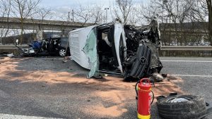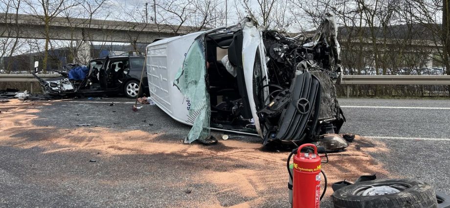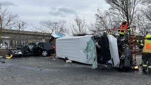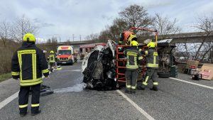 Hersfeld-Rotenburg – Zu einem schweren Verkehrsunfall mit zwei eingeklemmten Autofahrern kam es am Mittwochmittag gegen 12.30 Uhr auf der Bundesstraße 62 zwischen Niederaula und Niederjossa. Der Fahrer eines Baustellenlasters mit Tieflader befuhr die Bundesstraße von Niederjossa in Richtung Niederaula. Wie der Fahrer später mitteilte, kam ihm aus Niederaula ein Transporter entgegen, der plötzlich immer weiter nach links auf die Gegenfahrbahn fuhr und schließlich auf der Beifahrerseite des Lasters in die Stoßstange krachte. Der Transporter rutschte weiter am LKW entlang und krachte gegen die Hinterachse, die durch die Wucht des Aufpralls abriss. Im weiteren Verlauf prallte der Transporter gegen den Auflieger, an dem er auf voller Länge entlangrutschte, flog, wie ein Zeuge aussagte, durch die Luft, landete danach auf der Beifahrerseite und krachte auf der Seite liegend frontal in einen entgegenkommenden Skoda. Die Aussagen deckten sich mit der Zeugenaussage einer Autofahrerin, die hinter dem Transporter fuhr.