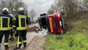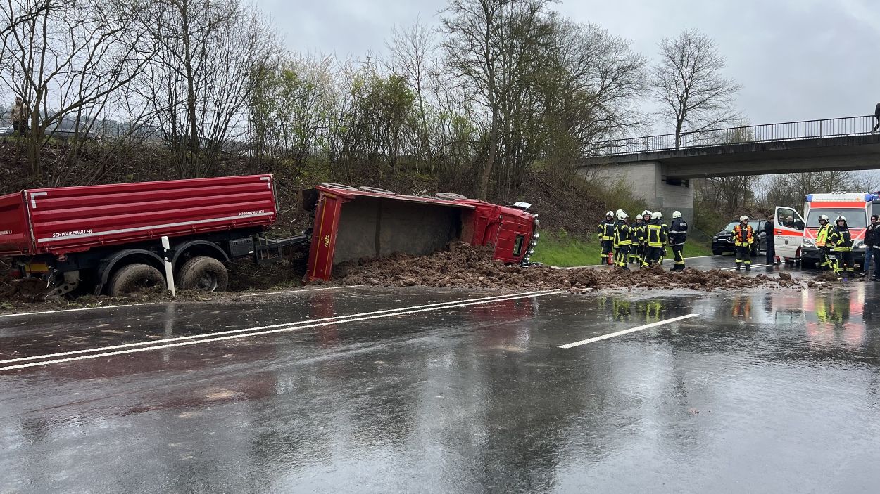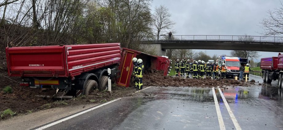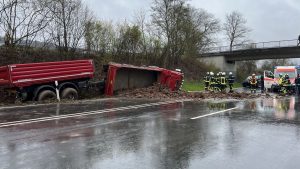 Bad Hersfeld – Am Samstagmorgen befuhr gegen 9.15 Uhr der Fahrer eines mit Erde beladenen Baustellenlasters die Bundesstraße 27 von Bad Hersfeld in Richtung Bebra. Etwa einen Kilometer hinter der Abzweigung nach Bebra-Blankenheim kam der Fahrer aus bislang ungeklärter Ursache nach rechts von der Fahrbahn ab und streifte die Schutzplanke. Bei dem Versuch, den Laster wieder auf die Spur zu bekommen, verriss der Fahrer offensichtlich das Lenkrad zu stark nach links. Dadurch kam das Fahrzeug über die Gegenfahrbahn in den Flutgraben, fuhr eine Böschung hinauf und kippte auf die Beifahrerseite. Der Anhänger kippte nicht mit um. Die Ladung der Zugmaschine verteilte sich auf der Fahrbahn. Der Fahrer des Lastzuges wurde in seinem Fahrzeug eingeschlossen und musste von der Feuerwehr aus dem Fahrerhaus befreit werden. Ein Rettungswagen brachte den verletzten Fahrer in ein Krankenhaus. Von den Feuerwehren aus Bebra wurde die Unfallstelle nach der Rettung abgesichert und die Polizei bei der Umleitung über die alte B27 unterstützt. Die verstreute Ladung an der Unfallstelle wurde vom Unternehmen, zu dem der Lastzug gehört, selbst entfernt und die Fahrbahn gereinigt. Während der Rettungs- und Aufräumarbeiten musste die B27 in beiden Richtungen voll gesperrt werden. Über die Höhe des Sachschadens konnten noch keine Angaben gemacht werden.
