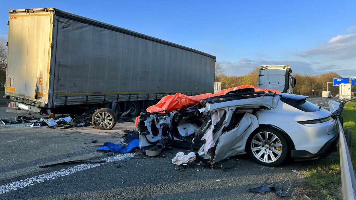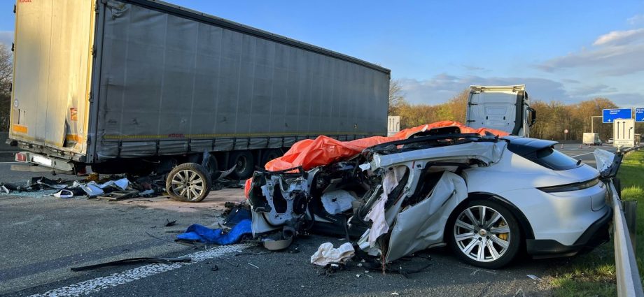 Niederaula – Am Dienstagabend kam es gegen 16.30 Uhr auf der A5 zwischen Alsfeld und dem Hattenbacher Dreieck zu einem schweren Verkehrsunfall. Nach ersten Erkenntnissen befuhr der Fahrer (71) eines Elektroporsches die kurz vor dem Hattenbacher Dreieck auf der rechten Abbiegespur in Richtung Fulda. Auf der mittleren Fahrspur staute sich der LKW-Verkehr in Richtung Kirchheim. Aus ungeklärter Ursache krachte der Porsche ungebremst in das Heck eines stehenden Sattelzuges. Durch die Wucht des Aufpralls wurde der Porsche völlig zerfetzt, wobei die Fahrerseite völlig aufgerissen wurde und kam neben dem Sattelzug zum Stehen. Wie der Fahrer des Sattelzuges später erzählte, verspürte er einen Aufschlag und einen lauten Knall. Der LKW-Fahrer stieg aus und eilte zum Porsche, um dem Fahrer zu helfen, erkannte aber, dass für den Mann jede Hilfe zu spät kam. Verkehrsteilnehmer setzten einen Notruf ab und gaben das Kennzeichen des Porsches durch. Durch dieses umsichtige Handeln der Ersthelfer bekam die Feuerwehr aus Kirchheim, die zur Unfallstelle alarmiert wurde, bereits auf der Anfahrt von der Leitstelle die Rettungskarte für den Elektro-Porsche übermittelt, um das Fahrzeug stromlos zu schalten. Eine Notärztin, die wenig später an der Unfallstelle eintraf konnte nur noch den Tod des Fahrers feststellen. Der Fahrer des Sattelzuges erlitt einen Schock, wollte aber die Unfallstelle nicht verlassen. Der Auflieger des Sattelzuges und der Porsche wurden nach der Unfallaufnahme durch einen Sachverständigen abgeschleppt. An der Unfallstelle bildete sich ein Stau von mehreren Kilometern.