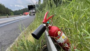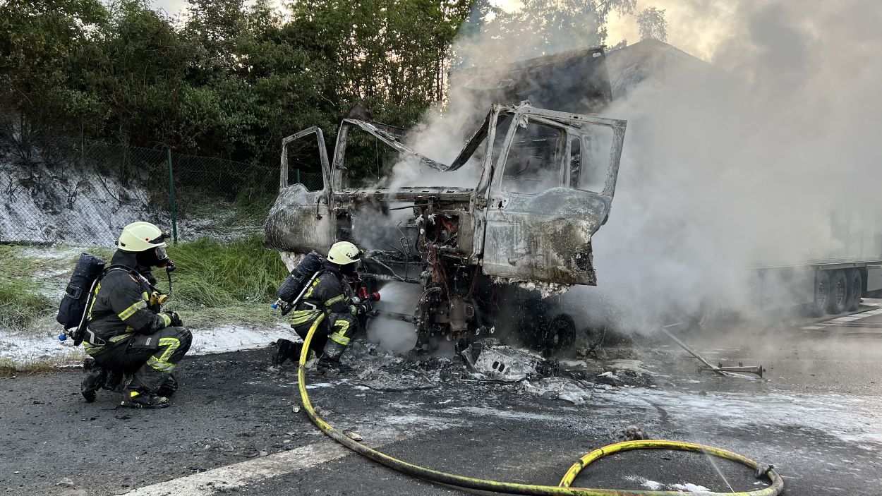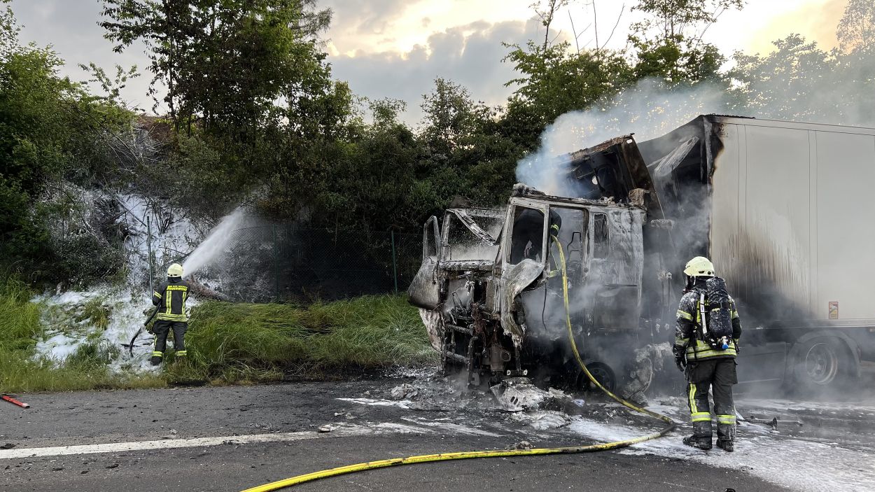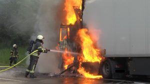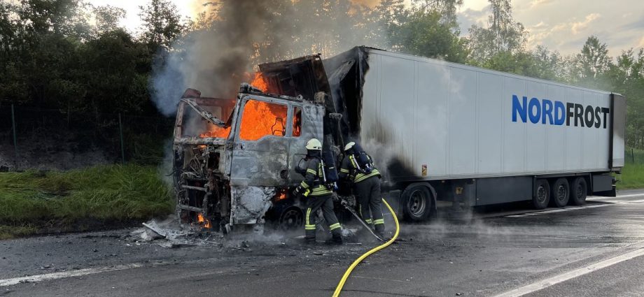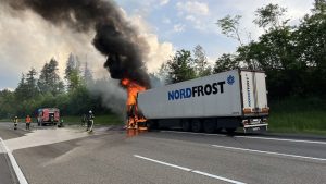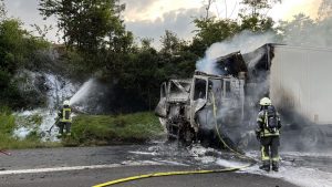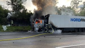Bad Hersfeld – „Es gab einen gewaltigen Knall durch einen Motorplatzer und dann schlugen mir auch schon die Flammen aus dem Motorraum entgegen“. Der Fahrer konnte am Montagabend auf der A7 zwischen Bad Hersfeld-West und Kirchheim in Fahrtrichtung Süden gegen 19.45 Uhr seinen mit Käse beladenen LKW gerade noch anhalten und aus dem Fahrerhaus seines Sattelzuges fliehen, als die Zugmaschine auch schon in ganzer Ausdehnung brannte. In einem Gespräch mit Feuerwehrleuten erzählte er später, dass er es nicht einmal mehr schaffte, den Sattelauflieger abzukoppeln. Und so griff das Feuer dann auch schnell auf die Ladung über. Beim Eintreffen der ersten Einsatzkräfte der Feuerwehr aus Bad Hersfeld sahen die Feuerwehrleute, dass nicht nur der Sattelzug, sondern auch die Böschung neben der Autobahn brannte. Mit mehreren Rohren gingen die Feuerwehrleute gegen die Flammen am Sattelzug und an der Böschung vor. Durch massiven Wassereinsatz und unter Zuhilfenahme von Löschschaum hatten die ca. 40 Feuerwehrleute die Feuer dann auch schnell unter Kontrolle.