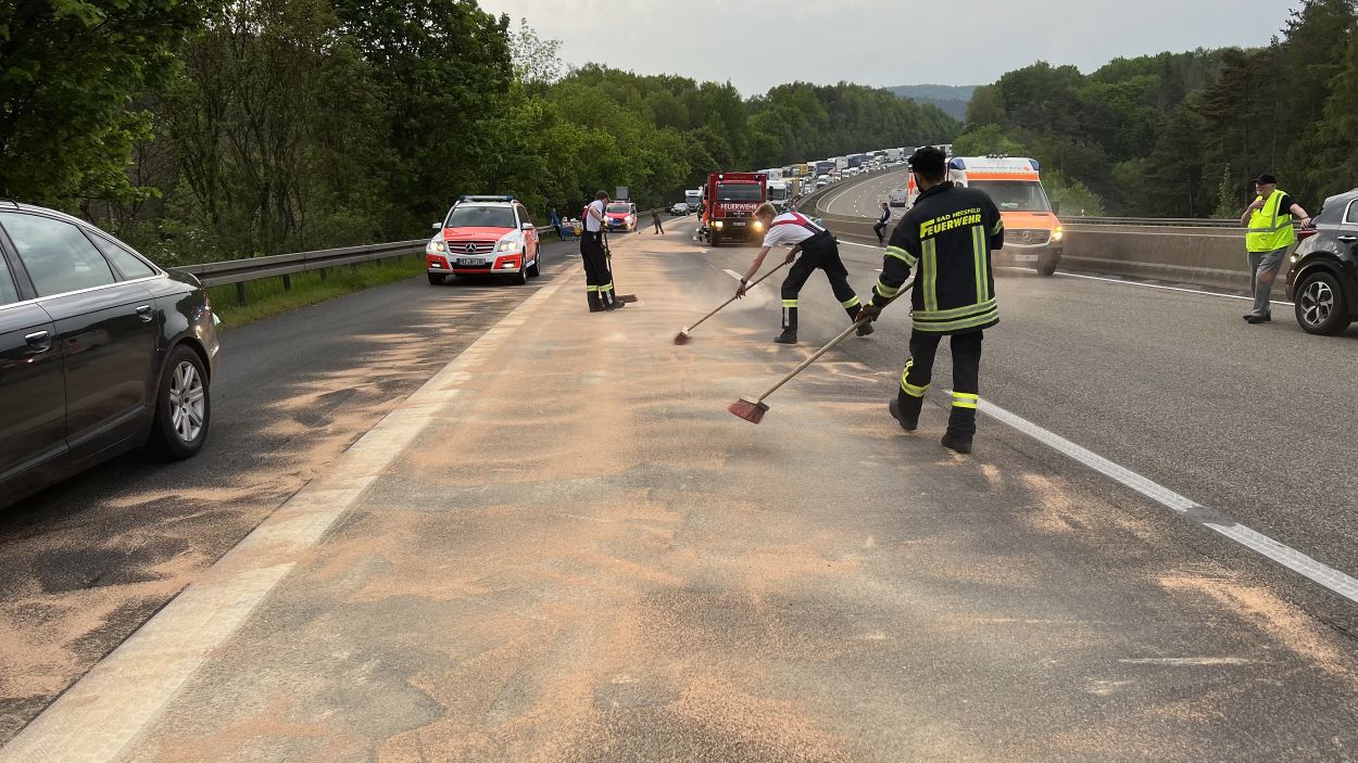 Als Brandursache wird vermutet, dass es am leichten Steigungsstück zu einem Motorplatzer kam. Kolbenteile lagen auf der Autobahn und eine große Fläche von ausgelaufenem Motoröl musste von der Feuerwehr abgestreut werden. Um genügend Wasser für die Löscharbeiten zu haben, wurde aus Kirchheim ein Wechselladerfahrzeug mit einem 10.000 Liter Tank zur Einsatzstelle alarmiert und die Feuerwehren aus Neuenstein setzten an den Bachläufen im Bereich der Einsatzstelle Ölsperren um eine Ölverschmutzung durch kontaminiertes Löschwasser zu verhindern. Der Fahrer wurde nicht verletzt und musste mit ansehen, wie sein Sattelzug ein Raub der Flammen wurde. Eigentlich wollte er kurz hinter Kirchheim Pause machen und dann nach Bamberg weiterfahren. Während der Löscharbeiten musste die A7 in Fahrtrichtung Süden für den gesamten Verkehr gesperrt werden. Der Verkehr wurde an der Anschlussstelle Bad Hersfeld-West ab- und über die Bundesstraße 324 nach Bad Hersfeld umgeleitet. Es bildete sich auf der A7 ein Stau von mehreren Kilometern. Auch die Bergung der Ladung dauerte mehrere Stunden an. Über die Höhe des Sachschadens konnten noch keine Angaben gemacht werden.