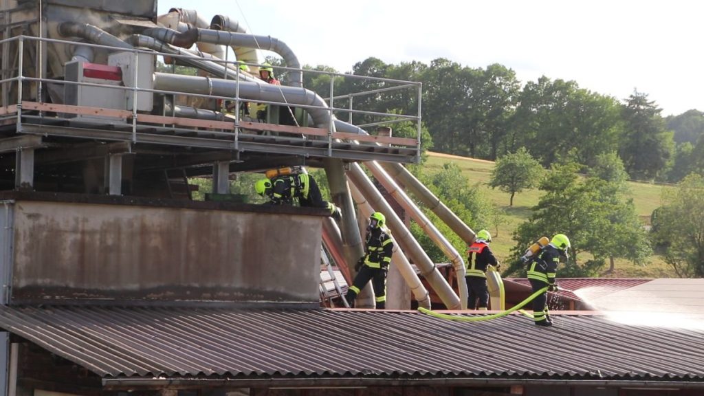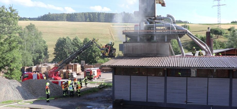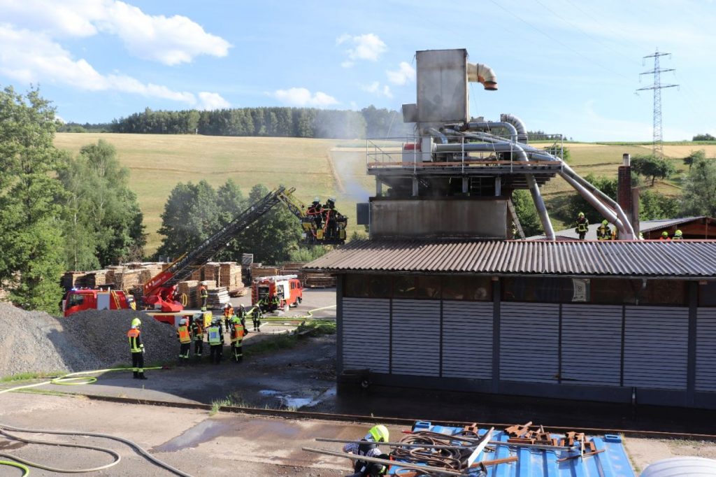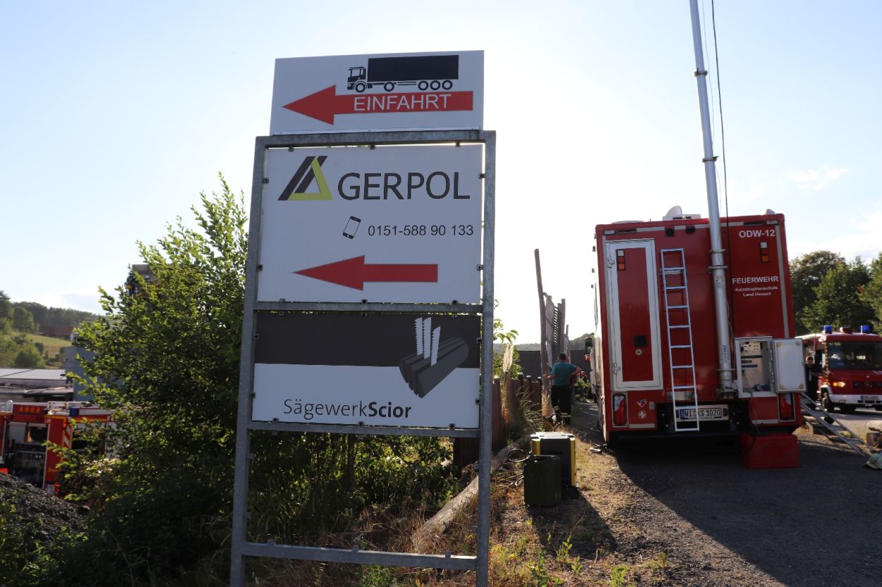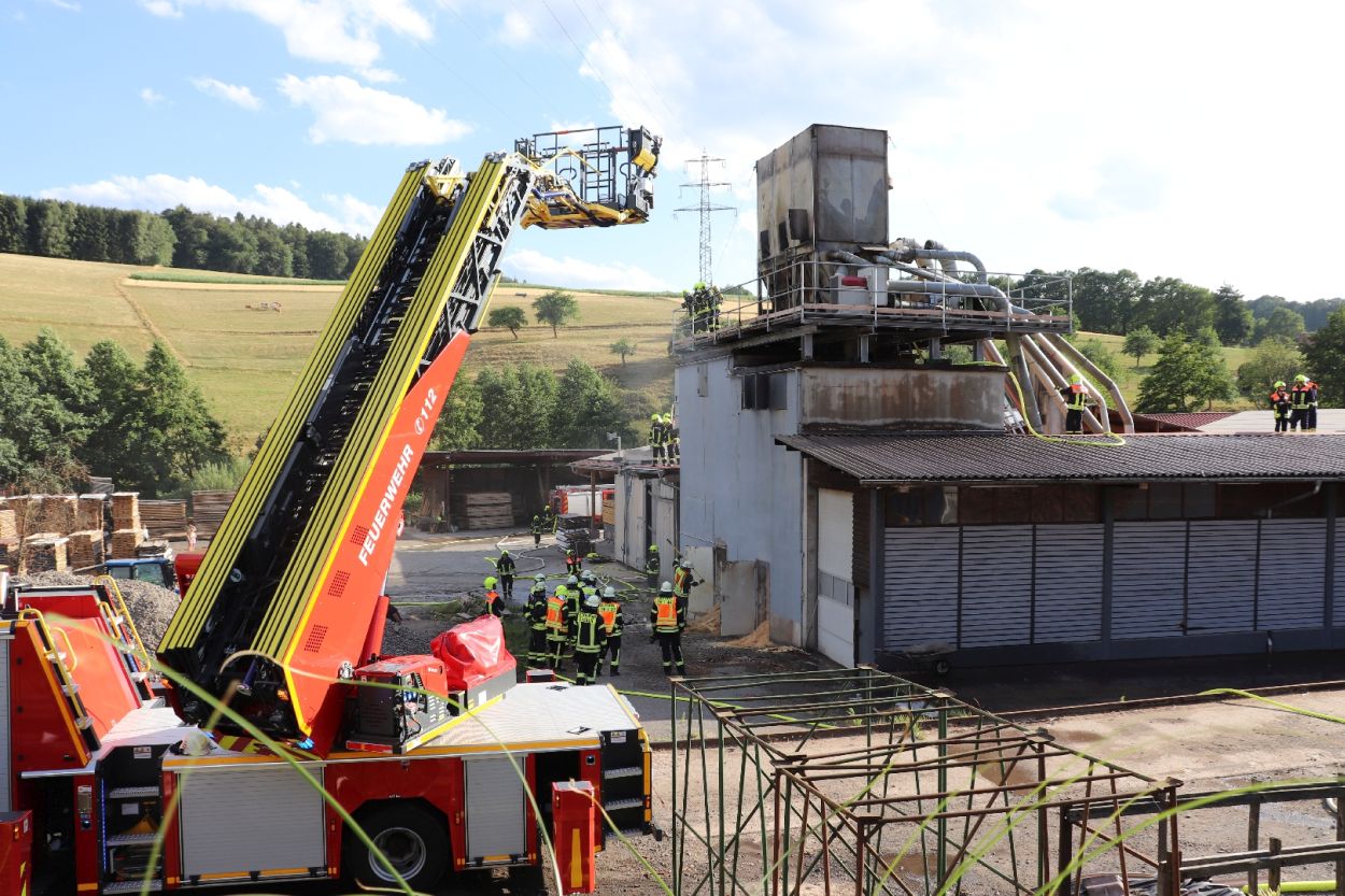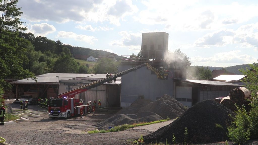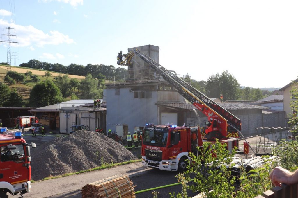 Mossautal – Am Montagnachmittag gegen 17.30 Uhr wurde über die Leitstelle ein Brand auf dem Gelände eines Sägewerks in der Unteren Siegfriedstraße im Mossautaler Ortsteil Hüttenthal gemeldet. Bei Ankunft der Einsatzkräfte brannte eine Filteranlage auf dem Dach eines Spänebunkers. Umgehend wurde ein massiver Löschangriff vorgenommen. Dennoch breiteten sich die Flammen auf zwei Spänebunker aus. Die Einsatzkräfte mussten unter schwerem Atemschutz bei knapp 30 Grad per Hand den Spänebunker ausräumen, was eine anstrengende und gefährliche Arbeit bedeutete. Daher wurde ein Gerätewagen Atemschutz wie auch Getränke an die Einsatzstelle gebracht. Die angrenzende B460 musste voll gesperrt werden. Zusätzlich wurde über KATWARN eine Meldung an die Bevölkerung ausgegeben. Im Laufe des Einsatzes kamen Einheiten aus fast dem ganzen Odenwaldkreis zum Einsatz. In Spitzenzeiten 22 Fahrzeuge mit über 80 Einsatzkräften. Darunter auch spezielle Gefahrstoffmessfahrzeuge, eine Drehleiter und ein Großtanklöschfahrzeug. Die Löschmaßnahmen werden wohl bis in die Nacht andauern.