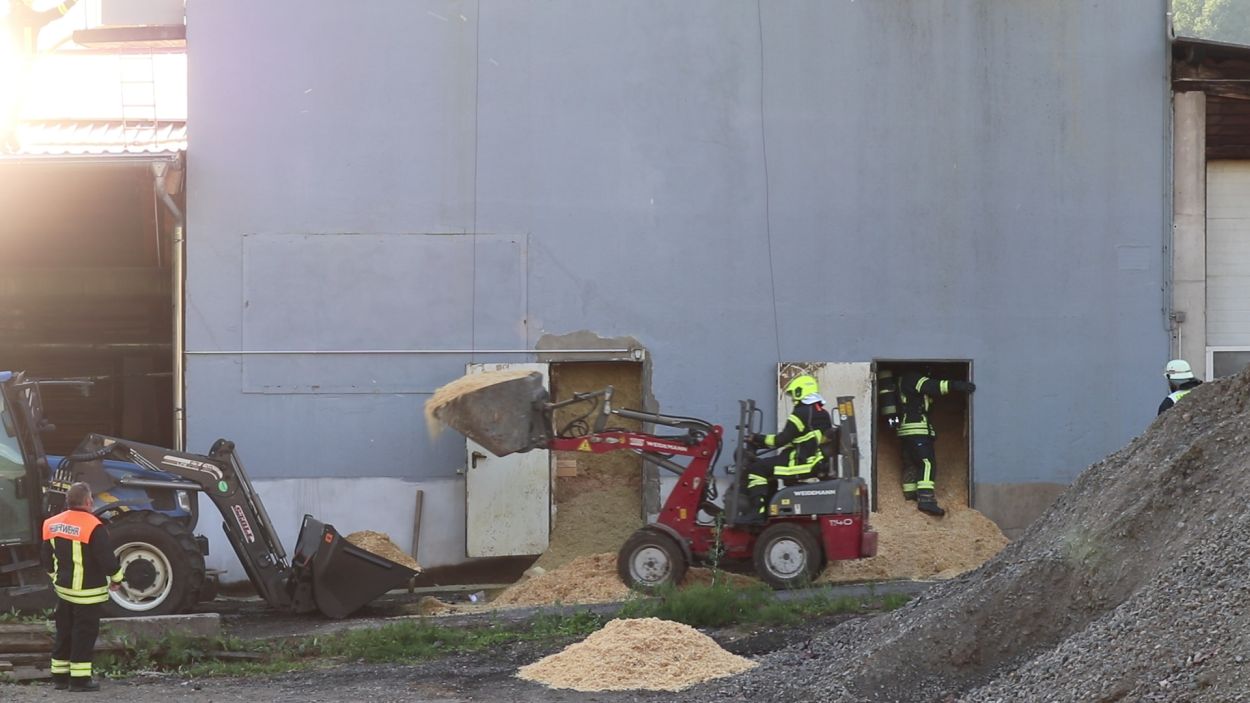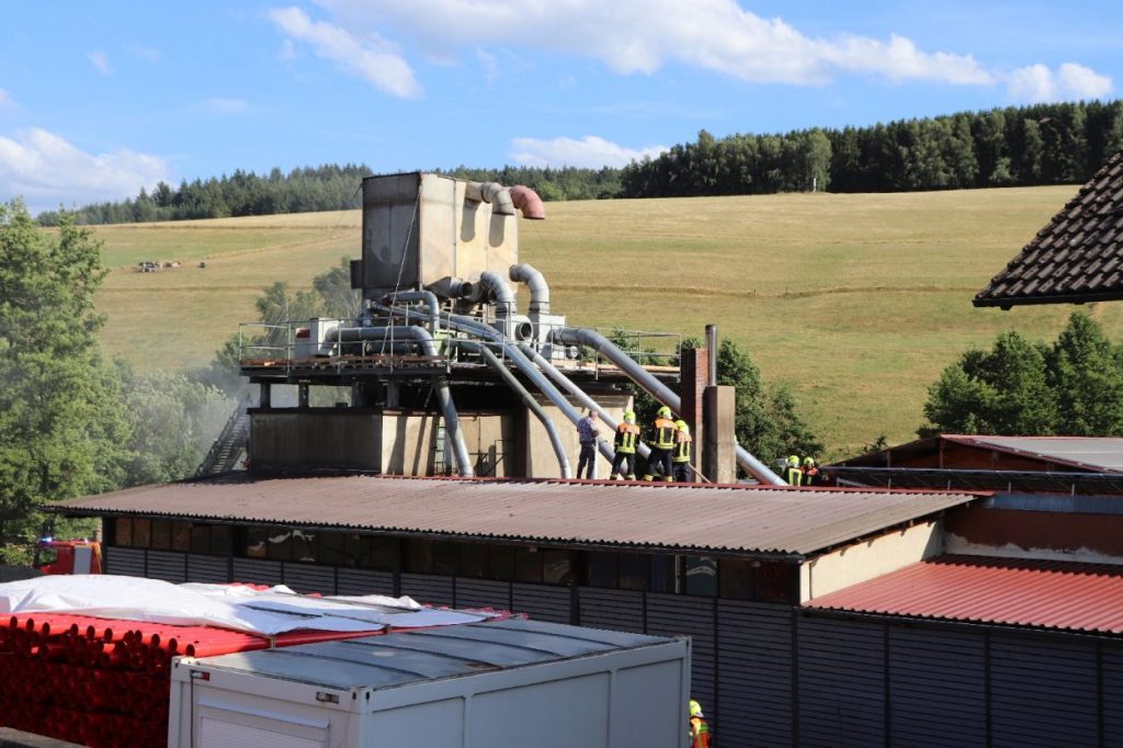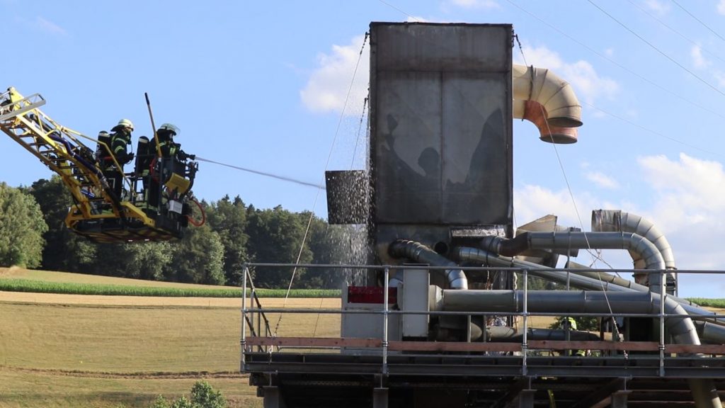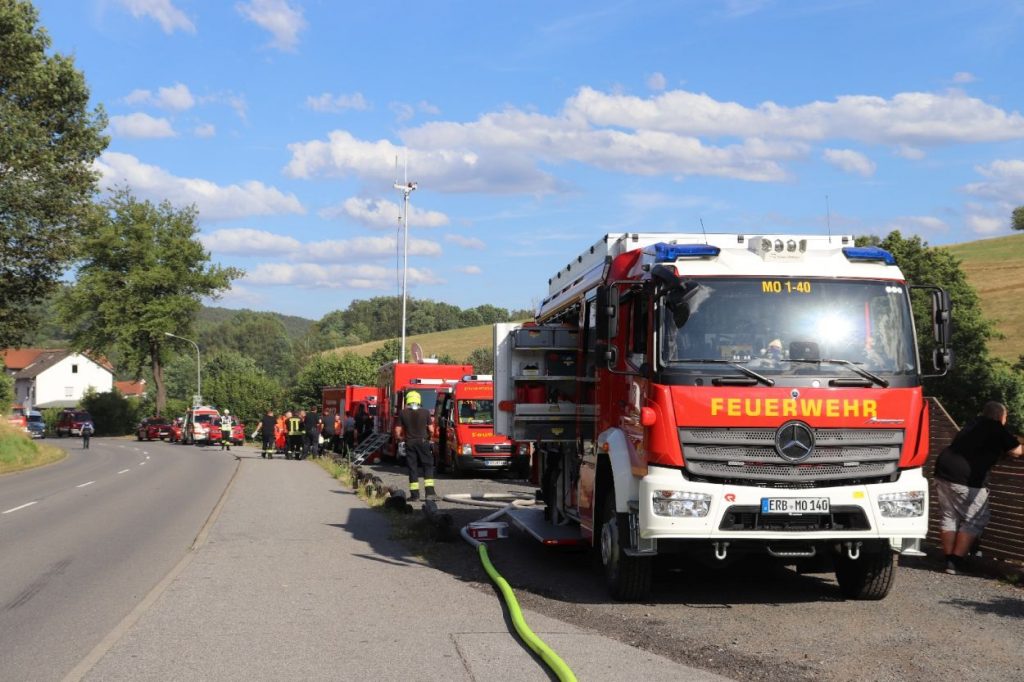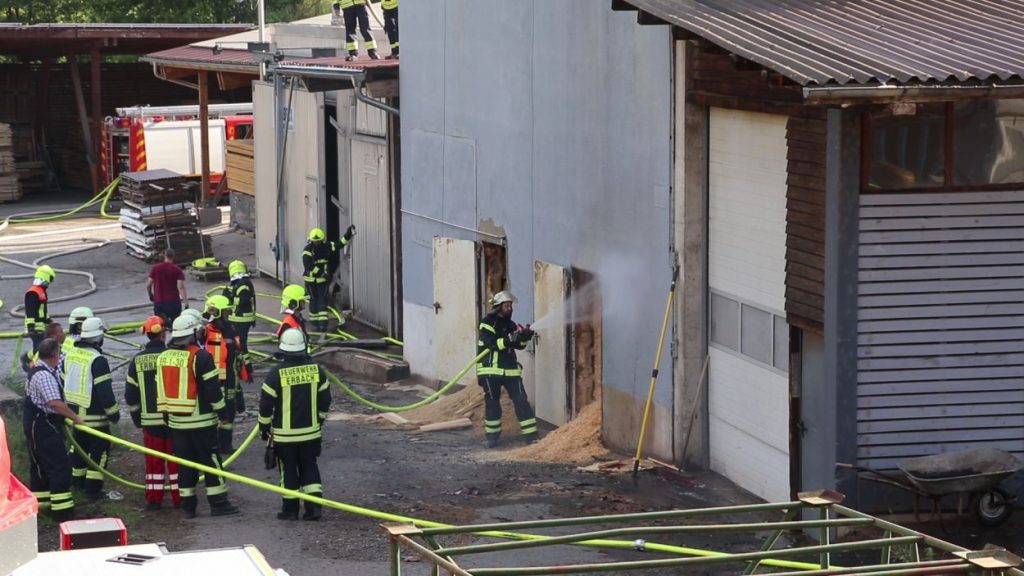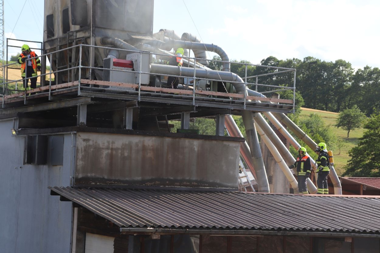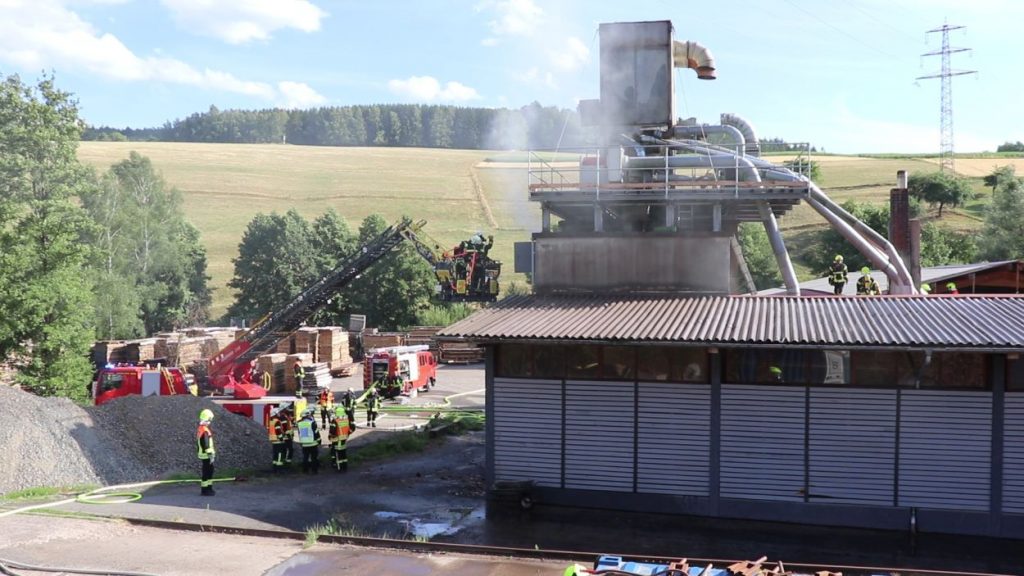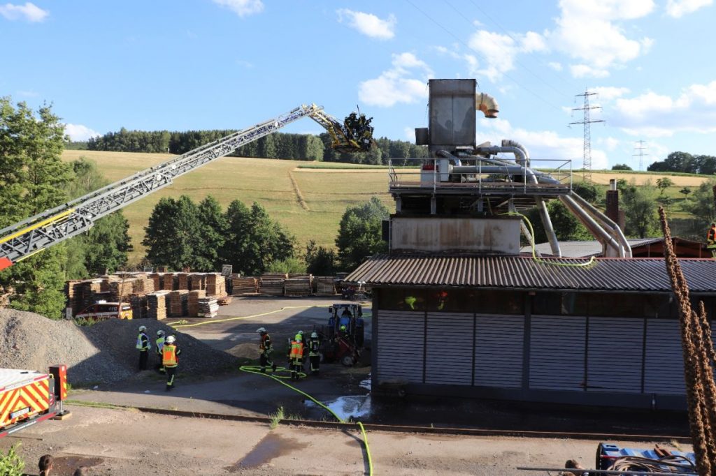 Mossautal – Am Montagnachmittag gegen 17.30 Uhr wurde über die Leitstelle ein Brand auf dem Gelände eines Sägewerks in der Unteren Siegfriedstraße im Mossautaler Ortsteil Hüttenthal gemeldet. Bei Ankunft der Einsatzkräfte brannte eine Filteranlage auf dem Dach eines Spänebunkers. Umgehend wurde ein massiver Löschangriff vorgenommen. Dennoch breiteten sich die Flammen auf zwei Spänebunker aus. Die Einsatzkräfte mussten unter schwerem Atemschutz bei knapp 30 Grad per Hand den Spänebunker ausräumen, was eine anstrengende und gefährliche Arbeit bedeutete. Daher wurde ein Gerätewagen Atemschutz wie auch Getränke an die Einsatzstelle gebracht. Die angrenzende B460 musste voll gesperrt werden. Zusätzlich wurde über KATWARN eine Meldung an die Bevölkerung ausgegeben. Im Laufe des Einsatzes kamen Einheiten aus fast dem ganzen Odenwaldkreis zum Einsatz. In Spitzenzeiten 22 Fahrzeuge mit über 80 Einsatzkräften. Darunter auch spezielle Gefahrstoffmessfahrzeuge, eine Drehleiter und ein Großtanklöschfahrzeug. Die Löschmaßnahmen werden wohl bis in die Nacht andauern.