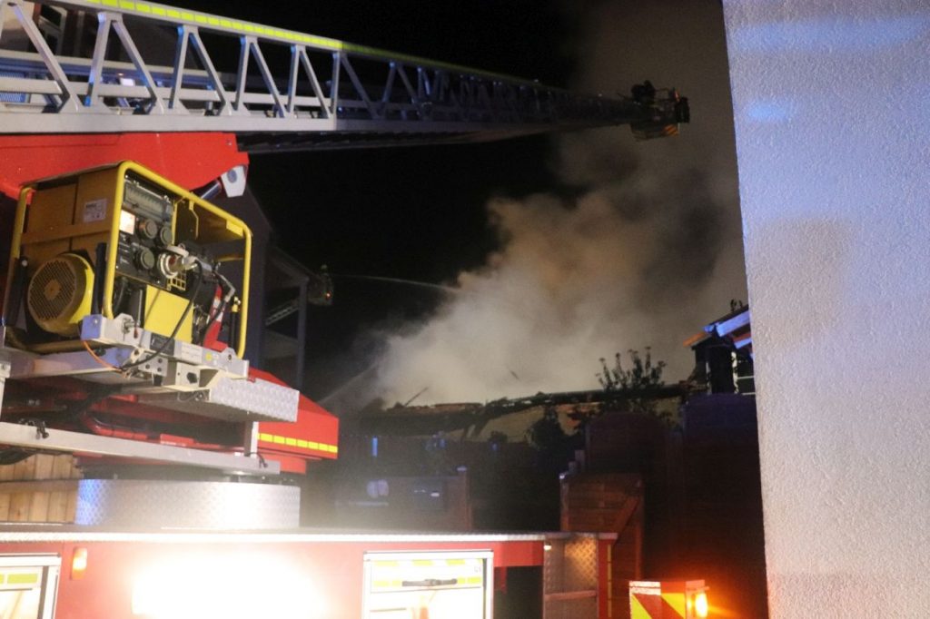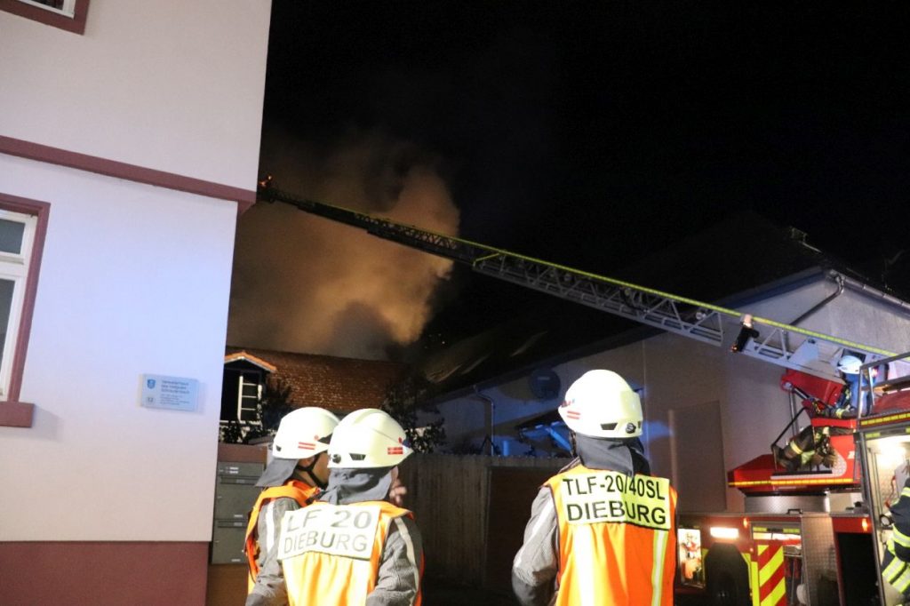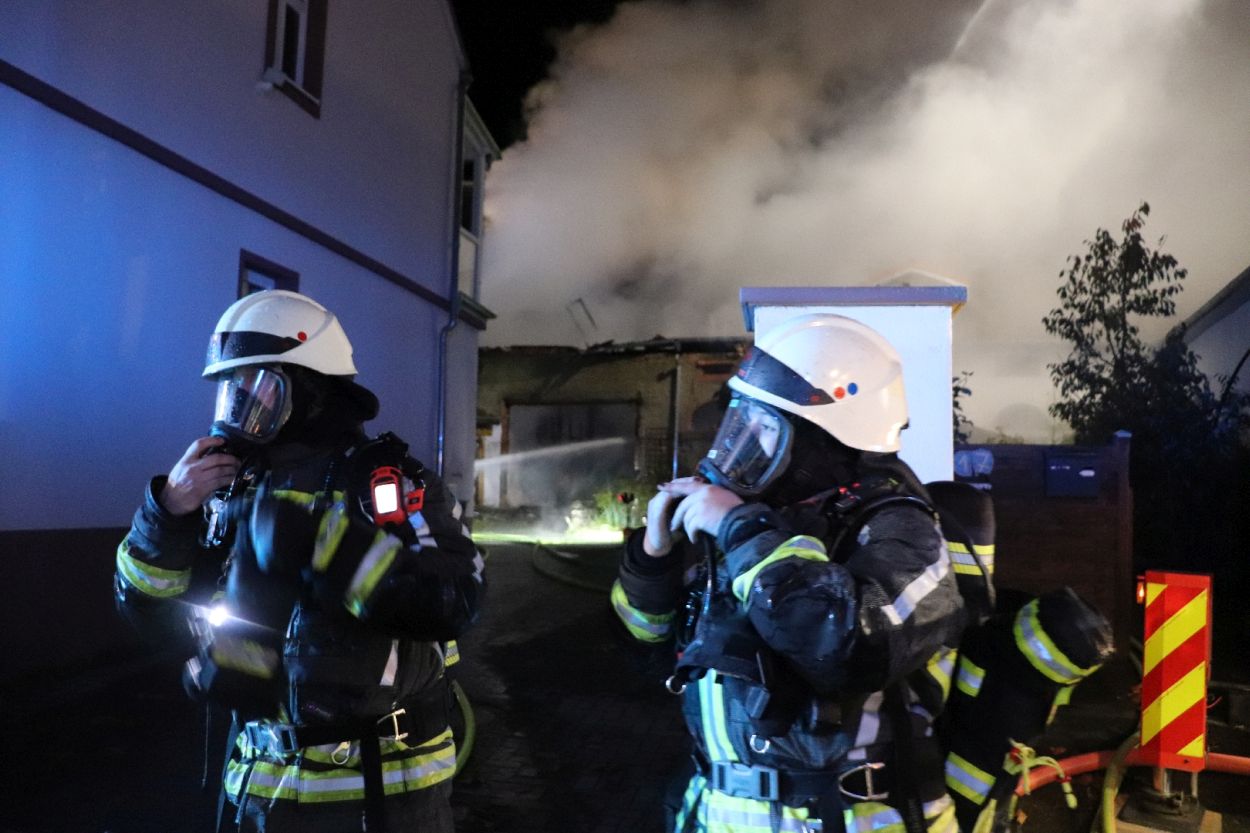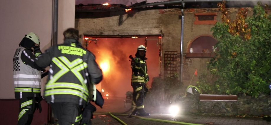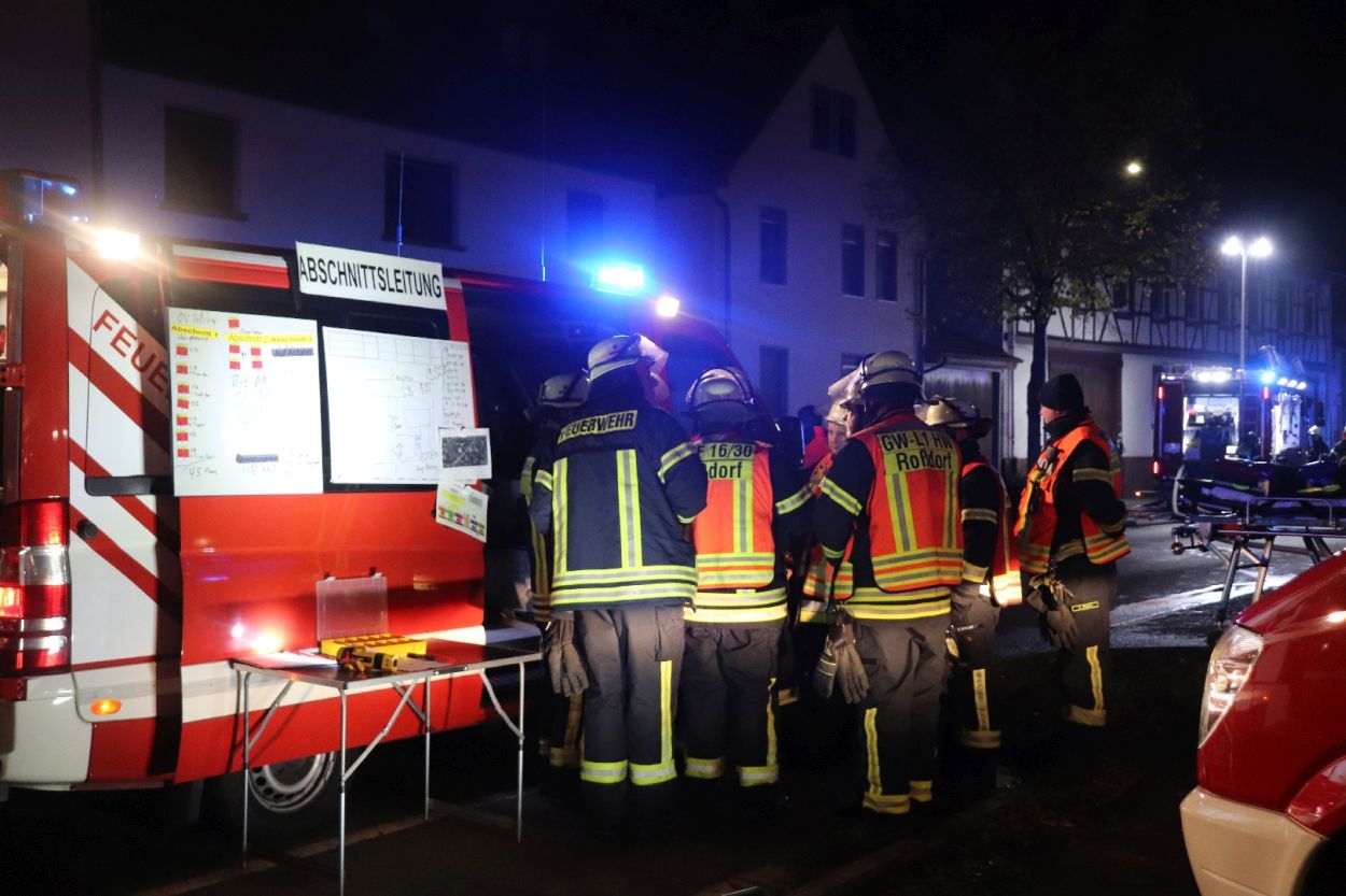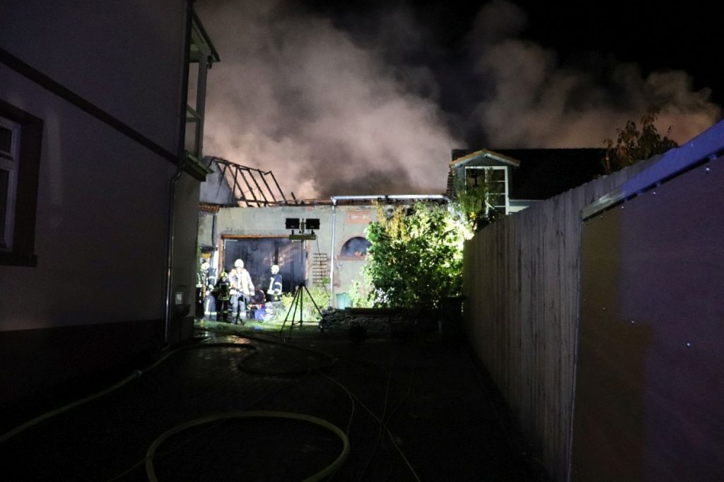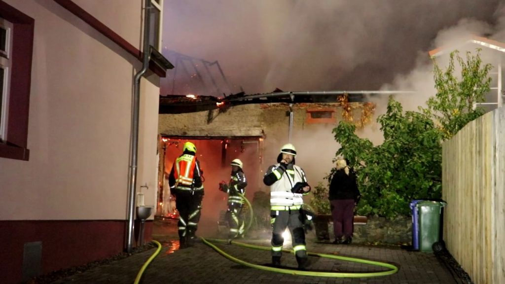 Rossdorf – Am Sonntag gegen 01.20 Uhr wurden die Feuerwehren der Gemeinde Rossdorf zu einem Großbrand alarmiert. Die Erstmeldung war eine brennende Scheune im Ortskern. Laut Einsatzleiter Eric Oeme waren hier Brennholz, Landwirtschaftliche Maschinen und Gasflaschen gelagert. Durch die Feuerwehr wurde ein umfassender Löschangriff und Riegelstellungen vorgenommen. Zu Einsatzbeginn wurden durch die Feuerwehr acht Familien aus umliegenden Gebäuden evakuiert. Hiervon verletzten sich zwei Personen durch Rauchgasinhalation und wurden in ein Krankenhaus verbracht. Im weiteren Einsatzverlauf wurde laut Polizei eine weitere Person leicht verletzt durch herabtropfende Flüssigkeiten, als die Person erneut ihr Gebäude betreten wollte.