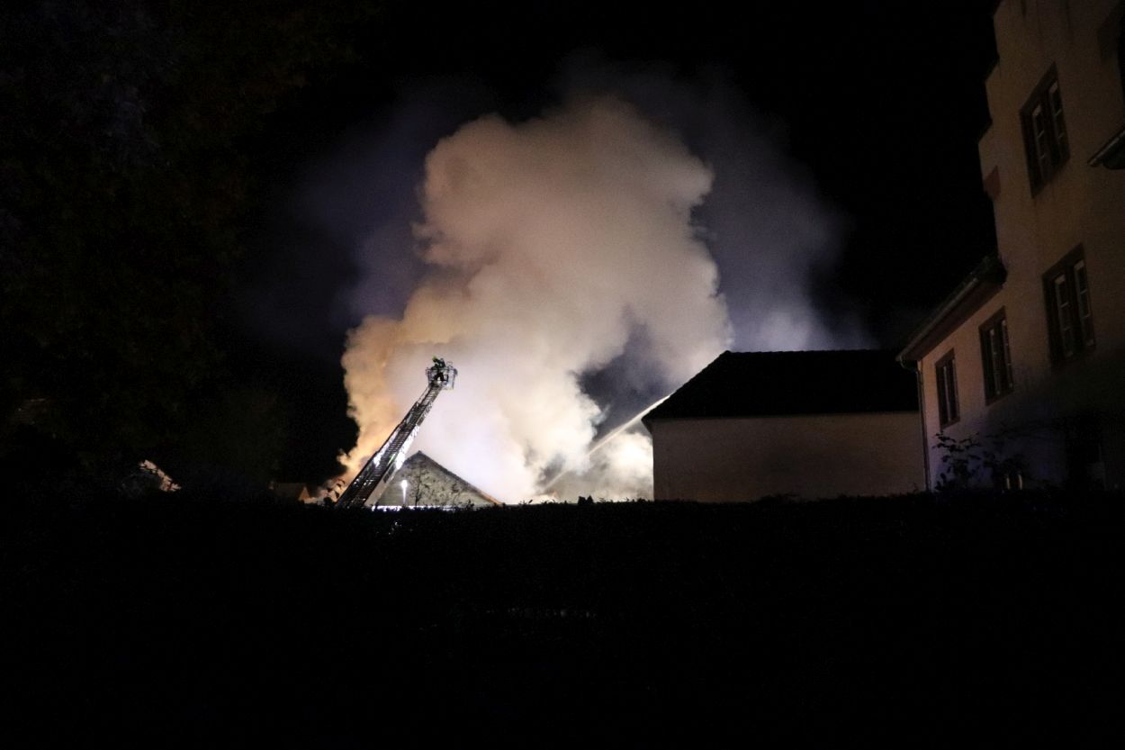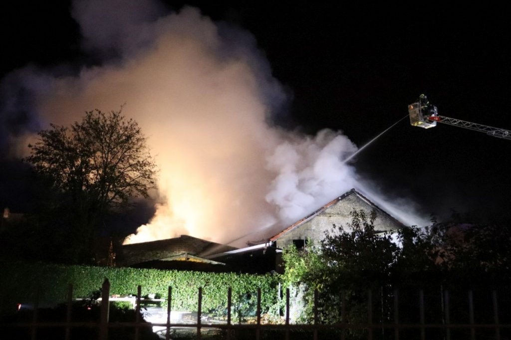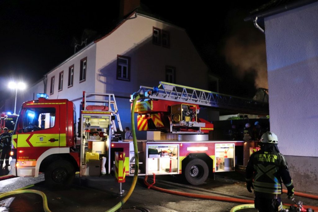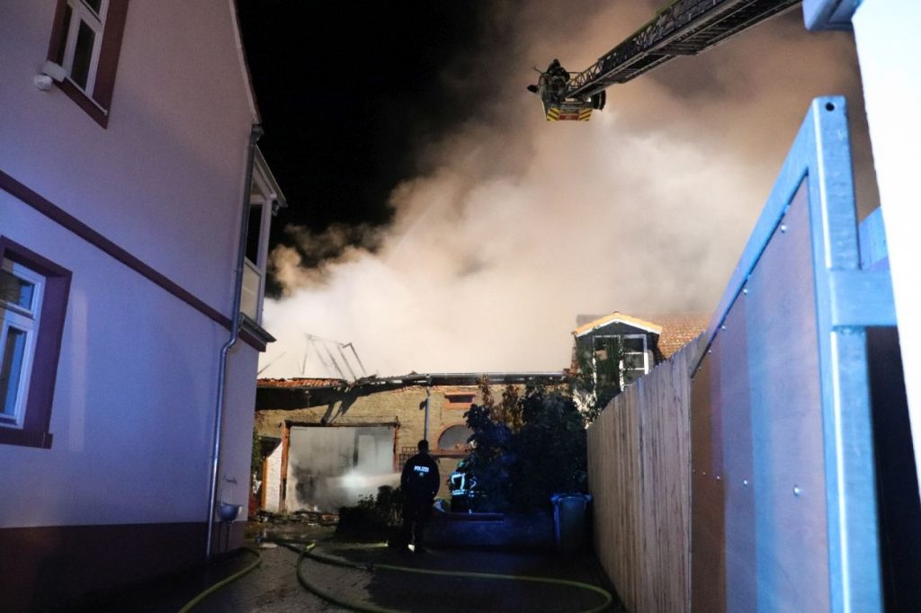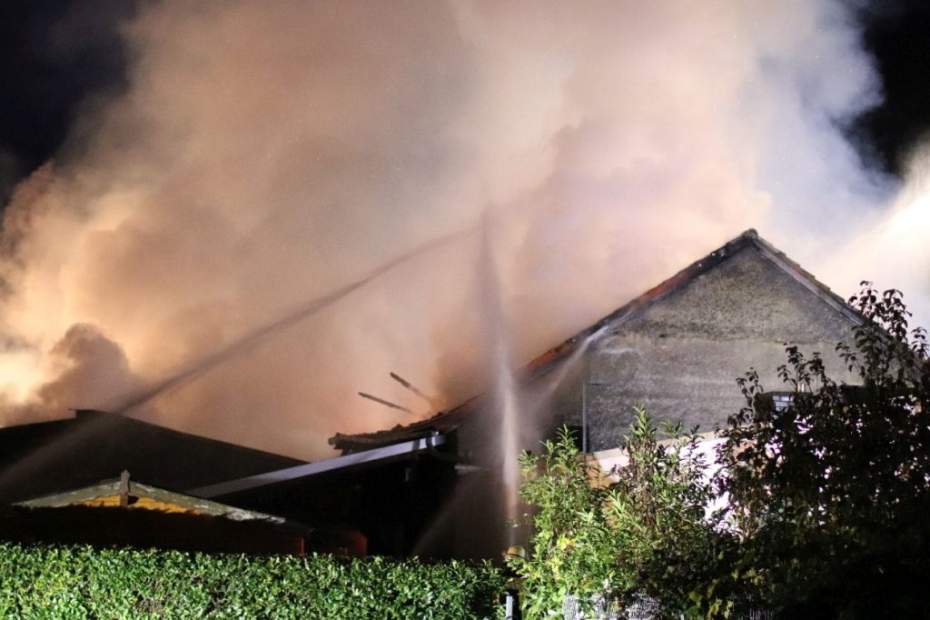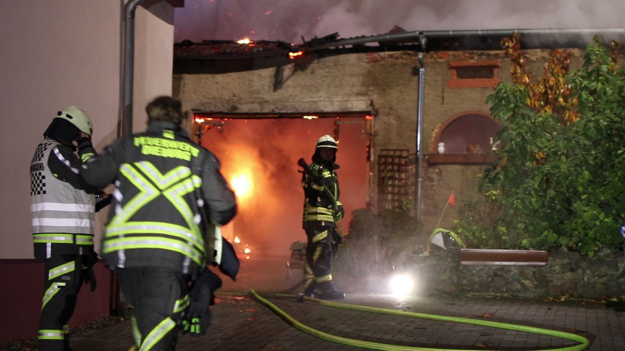 Rossdorf – Am Sonntag gegen 01.20 Uhr wurden die Feuerwehren der Gemeinde Rossdorf zu einem Großbrand alarmiert. Die Erstmeldung war eine brennende Scheune im Ortskern. Laut Einsatzleiter Eric Oeme waren hier Brennholz, Landwirtschaftliche Maschinen und Gasflaschen gelagert. Durch die Feuerwehr wurde ein umfassender Löschangriff und Riegelstellungen vorgenommen. Zu Einsatzbeginn wurden durch die Feuerwehr acht Familien aus umliegenden Gebäuden evakuiert. Hiervon verletzten sich zwei Personen durch Rauchgasinhalation und wurden in ein Krankenhaus verbracht. Im weiteren Einsatzverlauf wurde laut Polizei eine weitere Person leicht verletzt durch herabtropfende Flüssigkeiten, als die Person erneut ihr Gebäude betreten wollte.